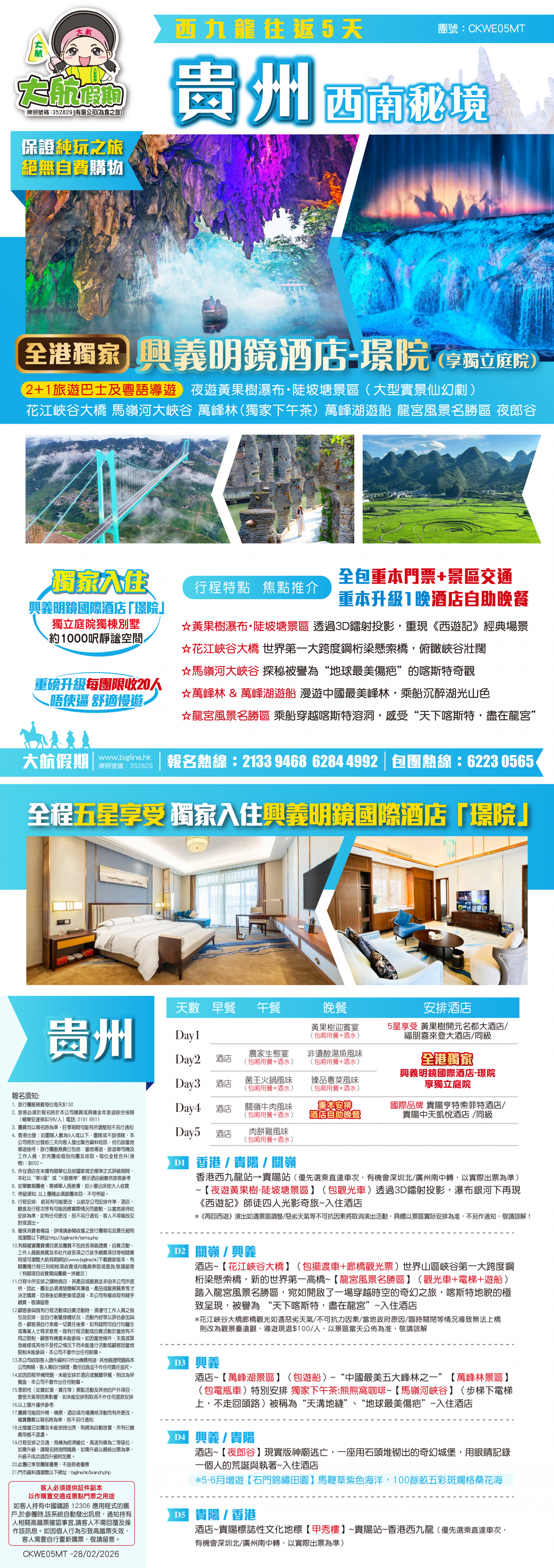 貴州 黔西南 【《全港獨家景點》興義 • 峰林佈依 非遺打鐵花&火壺 】 <2+1旅遊巴+粵語導遊>萬峰湖 萬峰林 馬嶺河大峽穀 黃果樹景區 全程5星享受酒店高鐵5天