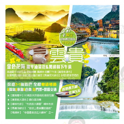 溫馨提示:油菜花期屬季節性景,如受氣候天氣影響較大觀賞不佳則改為【貴州醇景區】, 遊客不得藉故投訴,敬請理解!