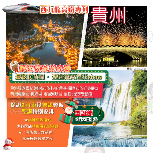 .香港西九龍站集合→大航專列→貴陽→【大航聖誕限定·聖誕狂歡夜】多彩貴州聖誕晚宴+酒店少數民族迎賓儀式+少數民族歌舞表演+篝火晚會+圣诞煙花秀