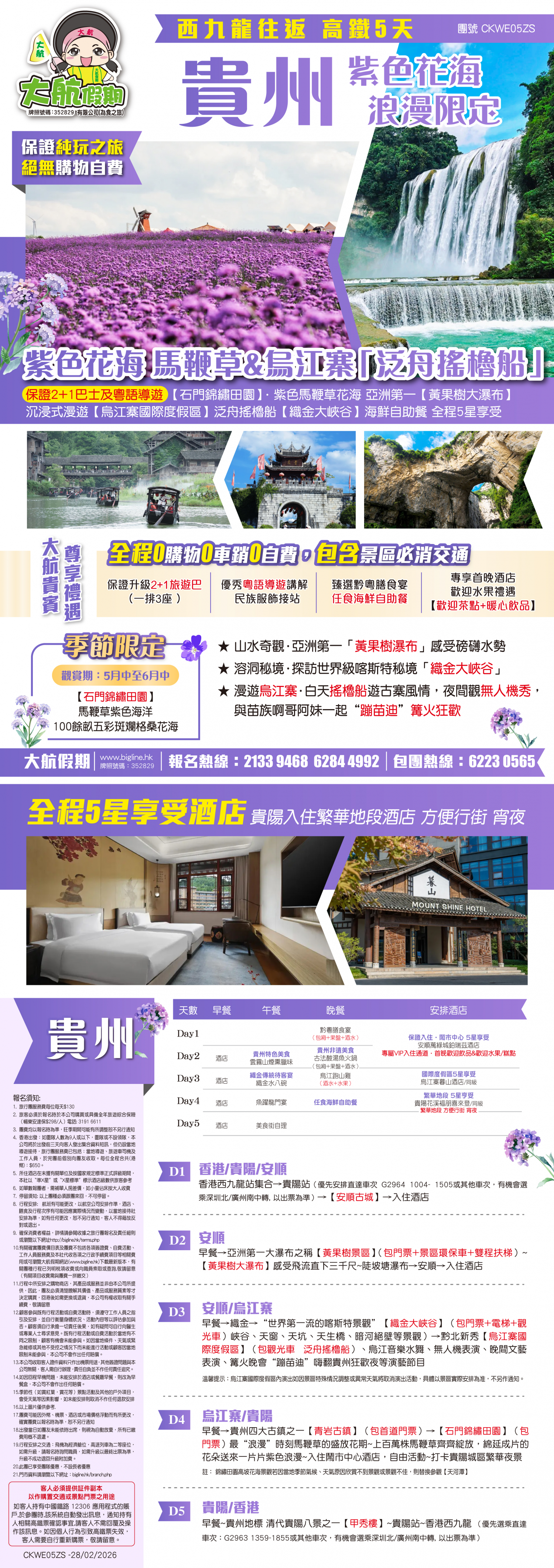 5-6月 浪漫限定【貴州。紫色花海 】《2+1旅遊巴+粵語導遊》【石門錦繡田園】紫色馬鞭草花海 烏江寨「泛舟搖櫓船」亞洲第一【黃果樹大瀑布】 織金大峽谷 青岩古鎮 全程5星享受高鐵5天