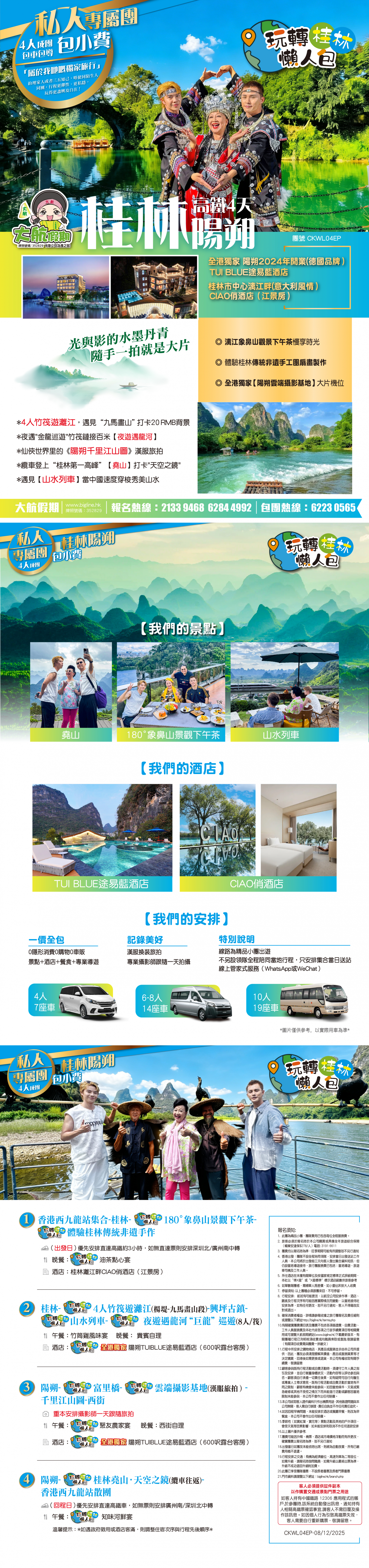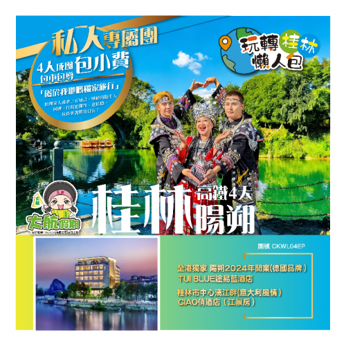 【4人成團 私人專屬旅行 包服務費】玩轉桂林懶人包「全港獨家:2晚連住陽朔途易藍酒店 陽朔雲端攝影基地」 (4人竹筏遊 千里江山圖 山水列車 夜遊"巨龍巡遊" 象鼻山觀景下午茶 西街)西九龍往返4天