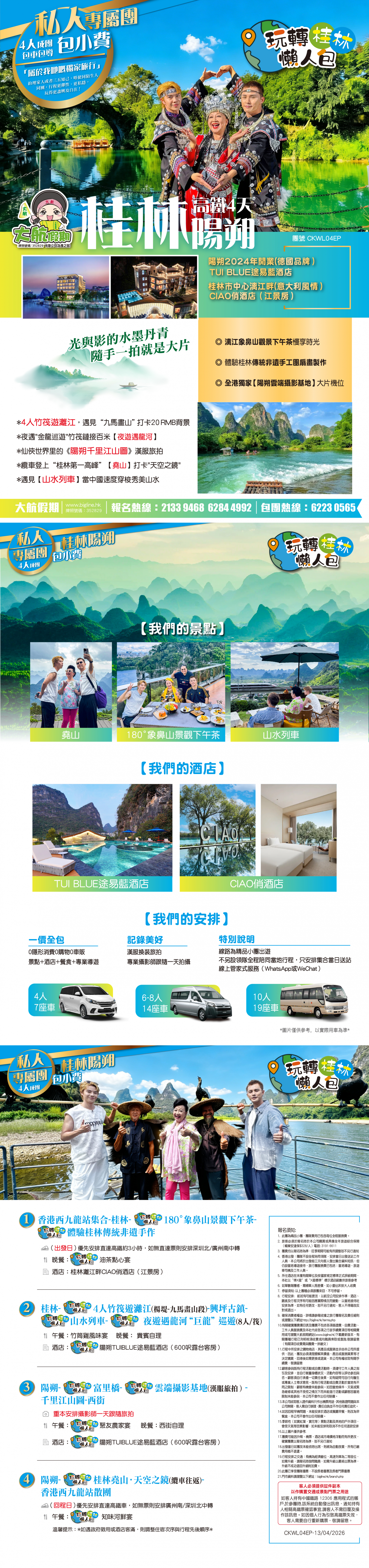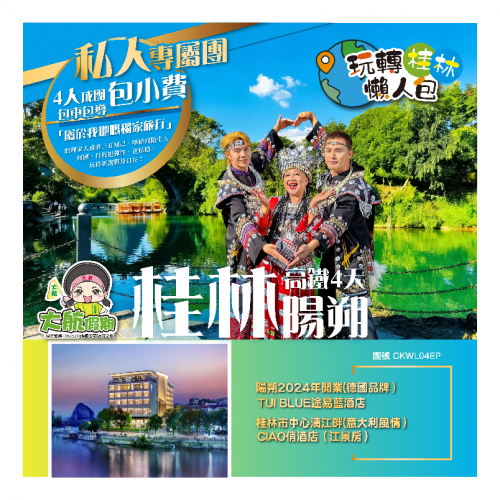 【4人成團 私人專屬旅行 包服務費】玩轉桂林懶人包「全港獨家:陽朔雲端攝影基地」2晚連住陽朔途易藍酒店 (4人竹筏遊 千里江山圖 山水列車 夜遊"巨龍巡遊" 象鼻山觀景下午茶 西街)西九龍往返4天