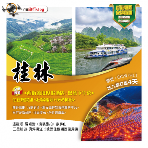 西九龍往返【純美桂林 連住陽朔】全港獨家(陽朔雲端攝影基地<換裝漢服旅拍>)三星船遊興坪灕江<打卡RMB 20同款背景>堯山纜車往返 冠岩小火車 象鼻山 富里橋 《當地粵語導遊》純玩4天