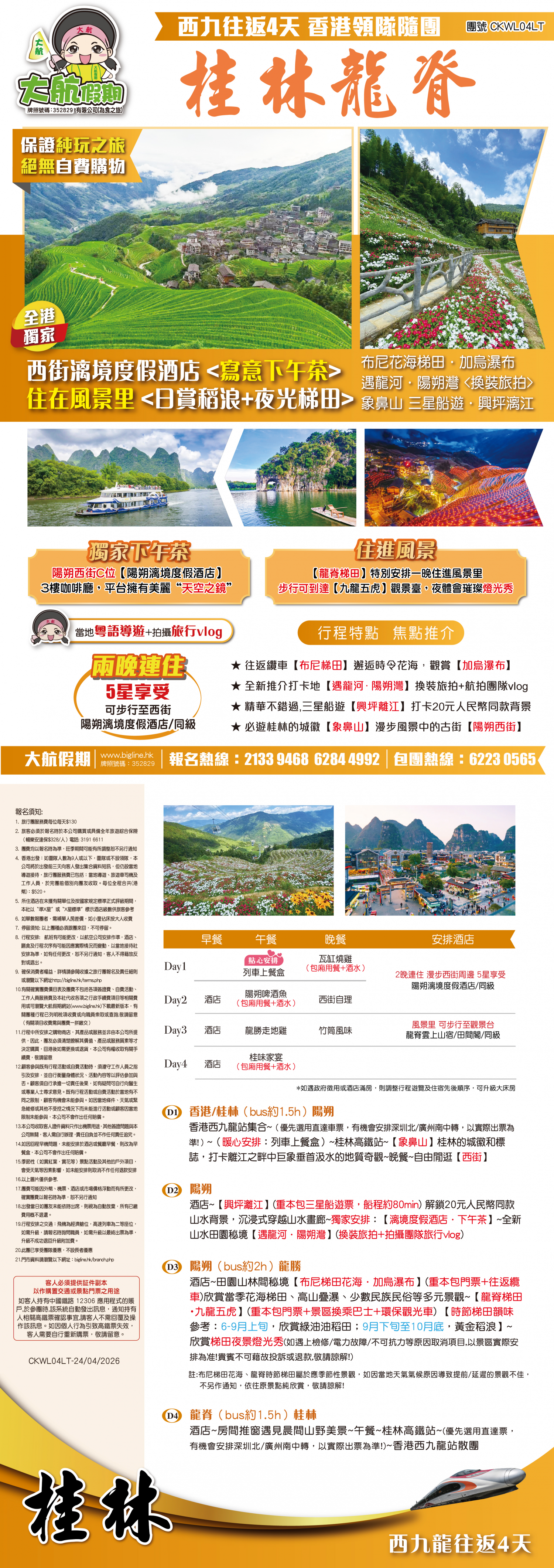 桂林龍脊#當地粵語導遊【全港獨家<西街漓境度假酒店·下午茶>】2晚連住陽朔+住在梯田風景里<夜景燈光秀> 布尼花海梯田·加烏瀑布 遇龍河·陽朔灣<換裝旅拍> 三星船遊灕江 象鼻山 西九龍往返4天