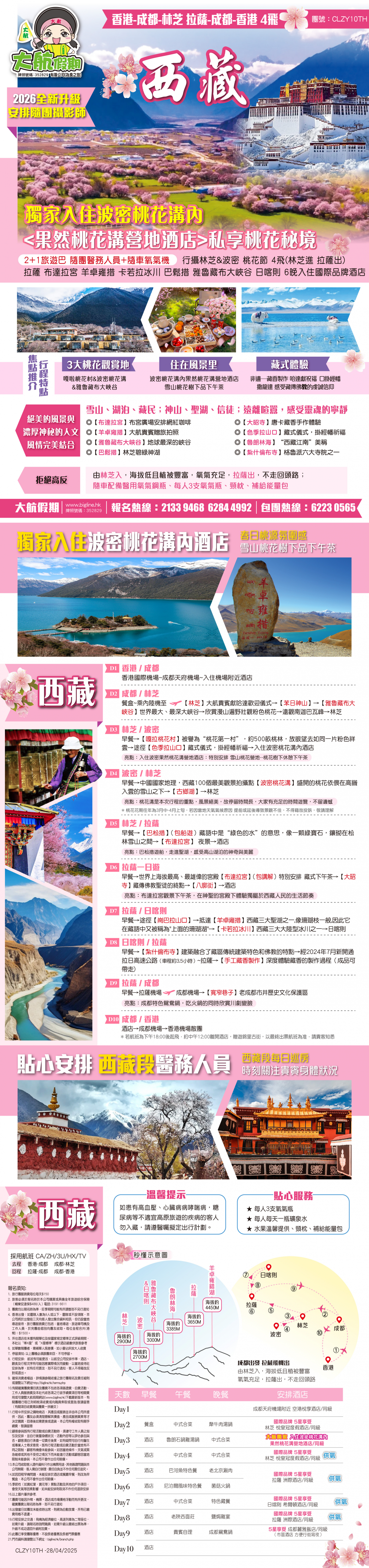 .早餐→中国国家地理,西藏100个最美观景拍摄点【波密桃花沟】漫山遍野的山桃花海,盛开的桃花依偎在高耸入云的雪山之下→【古乡湖】周围树木丛生,湖上有亭台楼阁,晴天时湖水碧蓝,环境很美→林芝