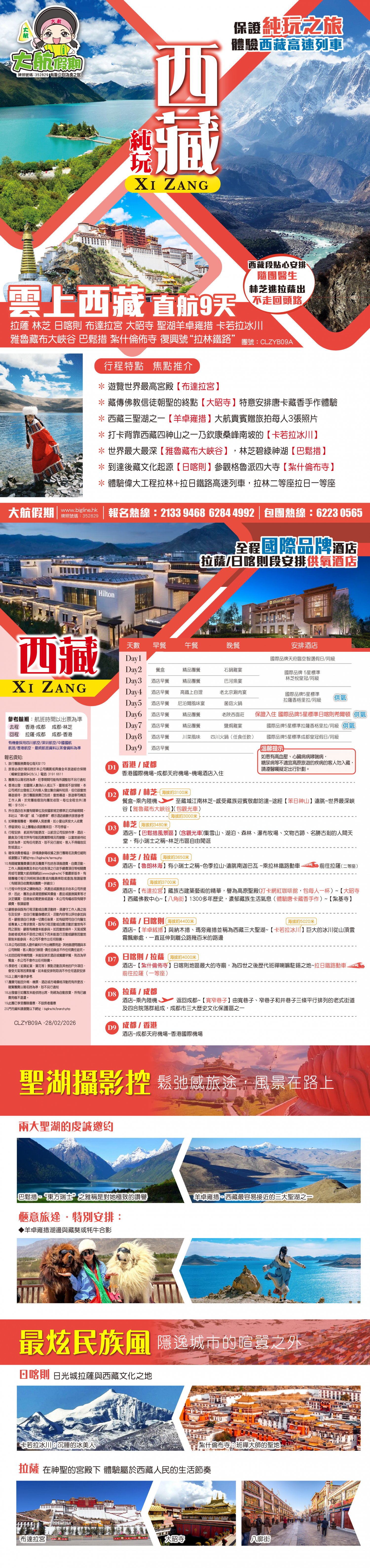 *團員繳付退票費後 (如適用): 1) 已繳款項可保留半年; 或 2) 選擇轉團後, 餘款則保留半年; 或 3) 可繳付『迫不得已理由』之手續費後, 取回已付餘款。 *個別機票+酒店套票產品如因『迫不得已理由』取消外遊行程, 處理旅客退款時亦按以上訂列收取每位退票費及手續費, 並以行程表 (套票單張) 所列為準。 責任細則: 1. 本公司保留合併團隊出發的權利。 2. 行程書或單張內所列費用根據當時機票價格及國際貨幣兌換率而訂立。外幣浮動等情況之下, 本公司保留在出發前調整各項費用的權利及徵收額外費用。 3. 所有列出的交通服務資料只供參考, 如有更改概不負責, 一切須以出票時為準。 4. 除本公司直接提供之服務外, 本公司及其職員或附屬公司或與本公司有經營關係之公司代理人身份在香港或外地安排其他獨立機構所提供之交通工具 (如飛機、輪船、火車、或遊覽巴士等) 、住宿、膳食或娛樂觀光項目等 (“委託機構”), 團員如遇交通延誤、行李遺失、意外傷亡或財物損失等, 該依照當地法律向擁有、管理或操作之委託機構直接交涉或追討賠償, 通常該等機構均各訂位不同條例, 以對客人負責。在此情況下, 本公司概不對該等損失或傷亡負責。 5. 除因由本公司之員工或其他直接管理或操作之機構之疏忽而引致團員之個人傷亡外, 本公司對團員在任何意外中之個人傷亡、經濟、娛樂或精神損失概不負責。 6. 除經本公司同意及安排, 如團員自行更改由其他人士代為參團, 本公司或其委託機構之職員有權取消其隨團之資格, 而無須發還任何團費, 而該人士在隨團期間之保險、責任賠償、行為後果等均由該人仕自行承擔。 7. 如因天氣、罷工、戰爭、怠工或安全情況影響而引致有關交通工具暫停服務, 停航或其他事故, 而必須將行程更改或取消部份行程, 本公司則將團員所繳交之費用扣除因以上事故而引致之損失後, 退回差額給團員。 8. 有關住宿、膳食、遊覽節目等問題, 均依據行程表安排, 行程先後次序有可能需要更改, 一切以當地安排為準。若遇特殊情況, 如簽證受阻, 當地酒店突告客滿或航機改變飛行時間或地點, 以及非本公司或其委託機構所能控制之因素, 令旅行團節目有增減, 或臨時更改交通工具、班機時間、機種及更換酒店等等, 本公司或其委託機構得依當時情況全權盡力處理, 團員不得藉故反對或退出, 因故取消之節目, 將不獲退還款項, 任何因延期而引致之額外支出, 本公司或其委託機構概不負責。 9. 所有酒店及住宿根據行程安排, 本公司視乎當時情形作出更改, 但不限於遇展覽會或特殊情況下, 將住宿鄰近城市之同等級酒店及住宿代替。本公司如因『迫不得已理由(外遊)』(即指戰爭、政治動盪、恐怖襲擊、天災、疫症、惡劣天氣、交通工具發生技術問題、載運機構臨時更改班次或取消服務、罷工、工業行動、旅遊目的地政府或世界衛生組織發出旅遊警示(警告)、香港特別行政區政府發出紅色或黑色外遊警示、不可抗力事件,以及業界不能控制的其他不利離開香港或在香港境外旅遊的情況)於外遊旅行團出發後更改任何項目而引致成本增加,可向顧客徵收額外費用。 10. 【已成團】代表該團號之指定出發日期預訂機位或已有足夠人數報名參加。但出發與否還受其他因素影響, 本公司保留最終決定權。 11. 任何團員在參與各項活動時, 如經常不遵守服飾人員之指引或安排, 在行動或言語上侮辱或滋擾其他團員或工作人員, 本公司或其委託機構職員有權視具體情況而取消其隨團資格而母須發任何團費, 而受該旅客監護之18歲以下同行團員亦須一併離開, 有關旅客離團後一切活動, 概與本公司或其委託機構無關。 12. 團員如欲於旅程完畢後延期返港, 須於出發前十四天提出, 以便本公司代為預定返港機位, 延期返港之機位, 未能即時作實, 團員不得藉此理由要求退出, 旅程完畢後延期逗留之費用, 概由團員自負。 13. 延期返港之團友, 必須在離境前七十二小時向航空公司確實回程機位, 任何機位如有變更, 概與本公司無關。 14. 團員如在旅途中自行離團或放棄行程, 離團後之責任自負, 一切後果與本公司或其委託機構無關。 15. 參團者須切實遵守各國及各地法例, 包括但不限於防疫防控條例, 並嚴禁攜帶違例物品出入境, 並照實申報攜帶之物品及現金。 16. 任何種類的簽證審批權及出入境批准權一律由該國或地區之領事館及/或出入境部門全權決定, 出入境如有問題, 責任旅客自負, 本公司或其委託機構母須負任何責任。如簽證已代辦, 簽證費恕不退還。 17. 即使團員持有效之入境簽證及旅遊證件, 而於入境時被當值之移民局海關人員拒絕入境, 本公司或其委託機構亦無須負任何責任。所需額外安排之食宿、交通費用、全部由其本人負責, 其餘下的行程亦將不會獲得任何補償, 亦不得要求退款或改團。 18. 中國內地相關法規規定, 即日起旅客入住中國內地境內酒店時, 公安機關會透過酒店前台向旅客一併採集人像信息資訊。 19. 如出現一些非本公司能力範圍可控制之問題 (如花卉、紅葉提早凋謝或景觀、自然現象、景點活動或戶外項目) 會受天氣等因素影響, 如未能安排則取消不作任何退款安排。 20. 旅客如在旅程中確診 COVID-19或其他傳染病,無論受到當地政府隔離或其他檢疫要求影響與否,為確保其他旅客之安全,確診旅