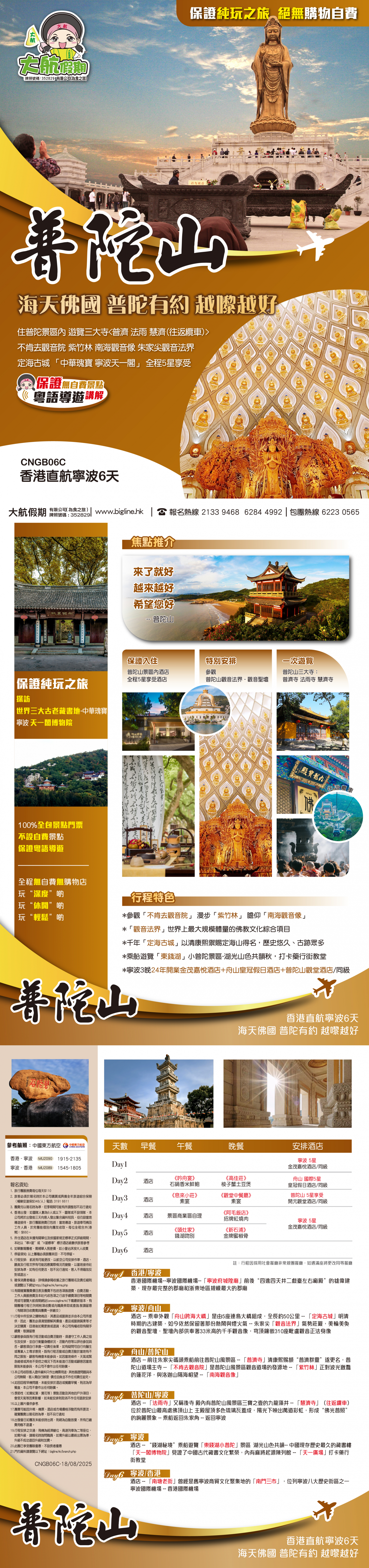*團員繳付退票費後 (如適用): 1) 已繳款項可保留半年; 或 2) 選擇轉團後, 餘款則保留半年; 或 3) 可繳付『迫不得已理由』之手續費後, 取回已付餘款。 *個別機票+酒店套票產品如因『迫不得已理由』取消外遊行程, 處理旅客退款時亦按以上訂列收取每位退票費及手續費, 並以行程表 (套票單張) 所列為準。 責任細則: 1. 本公司保留合併團隊出發的權利。 2. 行程書或單張內所列費用根據當時機票價格及國際貨幣兌換率而訂立。外幣浮動等情況之下, 本公司保留在出發前調整各項費用的權利及徵收額外費用。 3. 所有列出的交通服務資料只供參考, 如有更改概不負責, 一切須以出票時為準。 4. 除本公司直接提供之服務外, 本公司及其職員或附屬公司或與本公司有經營關係之公司代理人身份在香港或外地安排其他獨立機構所提供之交通工具 (如飛機、輪船、火車、或遊覽巴士等) 、住宿、膳食或娛樂觀光項目等 (“委託機構”), 團員如遇交通延誤、行李遺失、意外傷亡或財物損失等, 該依照當地法律向擁有、管理或操作之委託機構直接交涉或追討賠償, 通常該等機構均各訂位不同條例, 以對客人負責。在此情況下, 本公司概不對該等損失或傷亡負責。 5. 除因由本公司之員工或其他直接管理或操作之機構之疏忽而引致團員之個人傷亡外, 本公司對團員在任何意外中之個人傷亡、經濟、娛樂或精神損失概不負責。 6. 除經本公司同意及安排, 如團員自行更改由其他人士代為參團, 本公司或其委託機構之職員有權取消其隨團之資格, 而無須發還任何團費, 而該人士在隨團期間之保險、責任賠償、行為後果等均由該人仕自行承擔。 7. 如因天氣、罷工、戰爭、怠工或安全情況影響而引致有關交通工具暫停服務, 停航或其他事故, 而必須將行程更改或取消部份行程, 本公司則將團員所繳交之費用扣除因以上事故而引致之損失後, 退回差額給團員。 8. 有關住宿、膳食、遊覽節目等問題, 均依據行程表安排, 行程先後次序有可能需要更改, 一切以當地安排為準。若遇特殊情況, 如簽證受阻, 當地酒店突告客滿或航機改變飛行時間或地點, 以及非本公司或其委託機構所能控制之因素, 令旅行團節目有增減, 或臨時更改交通工具、班機時間、機種及更換酒店等等, 本公司或其委託機構得依當時情況全權盡力處理, 團員不得藉故反對或退出, 因故取消之節目, 將不獲退還款項, 任何因延期而引致之額外支出, 本公司或其委託機構概不負責。 9. 所有酒店及住宿根據行程安排, 本公司視乎當時情形作出更改, 但不限於遇展覽會或特殊情況下, 將住宿鄰近城市之同等級酒店及住宿代替。本公司如因『迫不得已理由(外遊)』(即指戰爭、政治動盪、恐怖襲擊、天災、疫症、惡劣天氣、交通工具發生技術問題、載運機構臨時更改班次或取消服務、罷工、工業行動、旅遊目的地政府或世界衛生組織發出旅遊警示(警告)、香港特別行政區政府發出紅色或黑色外遊警示、不可抗力事件,以及業界不能控制的其他不利離開香港或在香港境外旅遊的情況)於外遊旅行團出發後更改任何項目而引致成本增加,可向顧客徵收額外費用。 10. 【已成團】代表該團號之指定出發日期預訂機位或已有足夠人數報名參加。但出發與否還受其他因素影響, 本公司保留最終決定權。 11. 任何團員在參與各項活動時, 如經常不遵守服飾人員之指引或安排, 在行動或言語上侮辱或滋擾其他團員或工作人員, 本公司或其委託機構職員有權視具體情況而取消其隨團資格而母須發任何團費, 而受該旅客監護之18歲以下同行團員亦須一併離開, 有關旅客離團後一切活動, 概與本公司或其委託機構無關。 12. 團員如欲於旅程完畢後延期返港, 須於出發前十四天提出, 以便本公司代為預定返港機位, 延期返港之機位, 未能即時作實, 團員不得藉此理由要求退出, 旅程完畢後延期逗留之費用, 概由團員自負。 13. 延期返港之團友, 必須在離境前七十二小時向航空公司確實回程機位, 任何機位如有變更, 概與本公司無關。 14. 團員如在旅途中自行離團或放棄行程, 離團後之責任自負, 一切後果與本公司或其委託機構無關。 15. 參團者須切實遵守各國及各地法例, 包括但不限於防疫防控條例, 並嚴禁攜帶違例物品出入境, 並照實申報攜帶之物品及現金。 16. 任何種類的簽證審批權及出入境批准權一律由該國或地區之領事館及/或出入境部門全權決定, 出入境如有問題, 責任旅客自負, 本公司或其委託機構母須負任何責任。如簽證已代辦, 簽證費恕不退還。 17. 即使團員持有效之入境簽證及旅遊證件, 而於入境時被當值之移民局海關人員拒絕入境, 本公司或其委託機構亦無須負任何責任。所需額外安排之食宿、交通費用、全部由其本人負責, 其餘下的行程亦將不會獲得任何補償, 亦不得要求退款或改團。 18. 中國內地相關法規規定, 即日起旅客入住中國內地境內酒店時, 公安機關會透過酒店前台向旅客一併採集人像信息資訊。 19. 如出現一些非本公司能力範圍可控制之問題 (如花卉、紅葉提早凋謝或景觀、自然現象、景點活動或戶外項目) 會受天氣等因素影響, 如未能安排則取消不作任何退款安排。 20. 旅客如在旅程中確診 COVID-19或其他傳染病,無論受到當地政府隔離或其他檢疫要求影響與否,為確保其他旅客之安全,確診旅