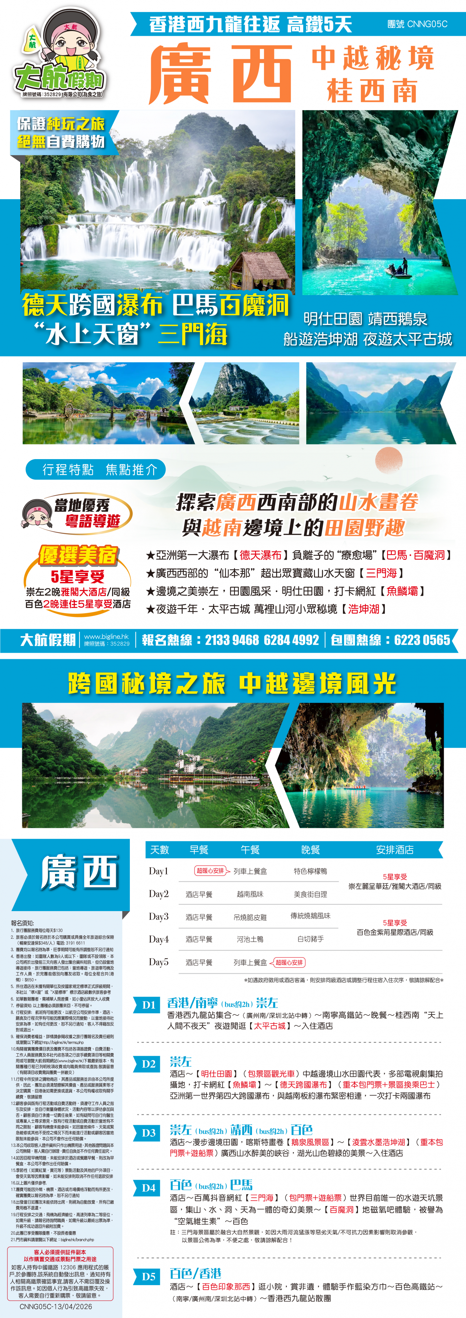 *團員繳付退票費後 (如適用): 1) 已繳款項可保留半年; 或 2) 選擇轉團後, 餘款則保留半年; 或 3) 可繳付『迫不得已理由』之手續費後, 取回已付餘款。 *個別機票+酒店套票產品如因『迫不得已理由』取消外遊行程, 處理旅客退款時亦按以上訂列收取每位退票費及手續費, 並以行程表 (套票單張) 所列為準。 責任細則: 1. 本公司保留合併團隊出發的權利。 2. 行程書或單張內所列費用根據當時機票價格及國際貨幣兌換率而訂立。外幣浮動等情況之下, 本公司保留在出發前調整各項費用的權利及徵收額外費用。 3. 所有列出的交通服務資料只供參考, 如有更改概不負責, 一切須以出票時為準。 4. 除本公司直接提供之服務外, 本公司及其職員或附屬公司或與本公司有經營關係之公司代理人身份在香港或外地安排其他獨立機構所提供之交通工具 (如飛機、輪船、火車、或遊覽巴士等) 、住宿、膳食或娛樂觀光項目等 (“委託機構”), 團員如遇交通延誤、行李遺失、意外傷亡或財物損失等, 該依照當地法律向擁有、管理或操作之委託機構直接交涉或追討賠償, 通常該等機構均各訂位不同條例, 以對客人負責。在此情況下, 本公司概不對該等損失或傷亡負責。 5. 除因由本公司之員工或其他直接管理或操作之機構之疏忽而引致團員之個人傷亡外, 本公司對團員在任何意外中之個人傷亡、經濟、娛樂或精神損失概不負責。 6. 除經本公司同意及安排, 如團員自行更改由其他人士代為參團, 本公司或其委託機構之職員有權取消其隨團之資格, 而無須發還任何團費, 而該人士在隨團期間之保險、責任賠償、行為後果等均由該人仕自行承擔。 7. 如因天氣、罷工、戰爭、怠工或安全情況影響而引致有關交通工具暫停服務, 停航或其他事故, 而必須將行程更改或取消部份行程, 本公司則將團員所繳交之費用扣除因以上事故而引致之損失後, 退回差額給團員。 8. 有關住宿、膳食、遊覽節目等問題, 均依據行程表安排, 行程先後次序有可能需要更改, 一切以當地安排為準。若遇特殊情況, 如簽證受阻, 當地酒店突告客滿或航機改變飛行時間或地點, 以及非本公司或其委託機構所能控制之因素, 令旅行團節目有增減, 或臨時更改交通工具、班機時間、機種及更換酒店等等, 本公司或其委託機構得依當時情況全權盡力處理, 團員不得藉故反對或退出, 因故取消之節目, 將不獲退還款項, 任何因延期而引致之額外支出, 本公司或其委託機構概不負責。 9. 所有酒店及住宿根據行程安排, 本公司視乎當時情形作出更改, 但不限於遇展覽會或特殊情況下, 將住宿鄰近城市之同等級酒店及住宿代替。本公司如因『迫不得已理由(外遊)』(即指戰爭、政治動盪、恐怖襲擊、天災、疫症、惡劣天氣、交通工具發生技術問題、載運機構臨時更改班次或取消服務、罷工、工業行動、旅遊目的地政府或世界衛生組織發出旅遊警示(警告)、香港特別行政區政府發出紅色或黑色外遊警示、不可抗力事件,以及業界不能控制的其他不利離開香港或在香港境外旅遊的情況)於外遊旅行團出發後更改任何項目而引致成本增加,可向顧客徵收額外費用。 10. 【已成團】代表該團號之指定出發日期預訂機位或已有足夠人數報名參加。但出發與否還受其他因素影響, 本公司保留最終決定權。 11. 任何團員在參與各項活動時, 如經常不遵守服飾人員之指引或安排, 在行動或言語上侮辱或滋擾其他團員或工作人員, 本公司或其委託機構職員有權視具體情況而取消其隨團資格而母須發任何團費, 而受該旅客監護之18歲以下同行團員亦須一併離開, 有關旅客離團後一切活動, 概與本公司或其委託機構無關。 12. 團員如欲於旅程完畢後延期返港, 須於出發前十四天提出, 以便本公司代為預定返港機位, 延期返港之機位, 未能即時作實, 團員不得藉此理由要求退出, 旅程完畢後延期逗留之費用, 概由團員自負。 13. 延期返港之團友, 必須在離境前七十二小時向航空公司確實回程機位, 任何機位如有變更, 概與本公司無關。 14. 團員如在旅途中自行離團或放棄行程, 離團後之責任自負, 一切後果與本公司或其委託機構無關。 15. 參團者須切實遵守各國及各地法例, 包括但不限於防疫防控條例, 並嚴禁攜帶違例物品出入境, 並照實申報攜帶之物品及現金。 16. 任何種類的簽證審批權及出入境批准權一律由該國或地區之領事館及/或出入境部門全權決定, 出入境如有問題, 責任旅客自負, 本公司或其委託機構母須負任何責任。如簽證已代辦, 簽證費恕不退還。 17. 即使團員持有效之入境簽證及旅遊證件, 而於入境時被當值之移民局海關人員拒絕入境, 本公司或其委託機構亦無須負任何責任。所需額外安排之食宿、交通費用、全部由其本人負責, 其餘下的行程亦將不會獲得任何補償, 亦不得要求退款或改團。 18. 中國內地相關法規規定, 即日起旅客入住中國內地境內酒店時, 公安機關會透過酒店前台向旅客一併採集人像信息資訊。 19. 如出現一些非本公司能力範圍可控制之問題 (如花卉、紅葉提早凋謝或景觀、自然現象、景點活動或戶外項目) 會受天氣等因素影響, 如未能安排則取消不作任何退款安排。 20. 旅客如在旅程中確診 COVID-19或其他傳染病,無論受到當地政府隔離或其他檢疫要求影響與否,為確保其他旅客之安全,確診旅