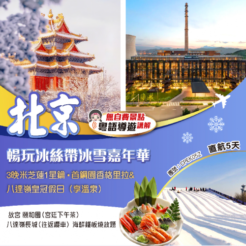 .酒店--天安門廣場「人民英雄紀念碑、人民大會堂外觀」--紫禁皇城「故宮博物館」(包耳機導賞)遊延禧宮、壽康宮、慈寧宮、禦花園 -- 神武門觀光巴士 -- 「冰絲帶冰雪嘉年華」包8大項目通玩不限次(具體專案已當時場地開放為準)雪上飛碟、颶風牆、人力過山車、雪地轉轉雪地悠波球、兒童樂園、雪地探寶、充氣城堡、雪地蹦床