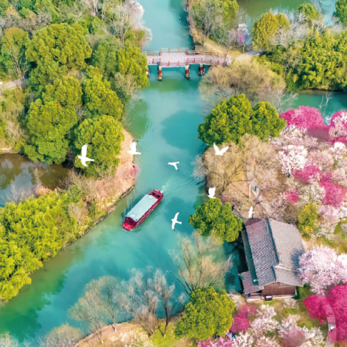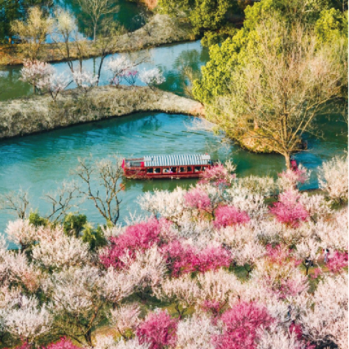 .酒店 -- 享受烏鎮水鄉清晨時光,醬坊,冶坊,三寸金蓮館,烏鎮老郵局,花鼓戲 -- 特別安排《藍印花布》體驗 -- 「西溪濕地國家公園」(乘遊船和電瓶車)西溪梅墅探梅,春節梅花盛開期,園內有梅花25000余株,梅林300畝地,梅花品種豐富