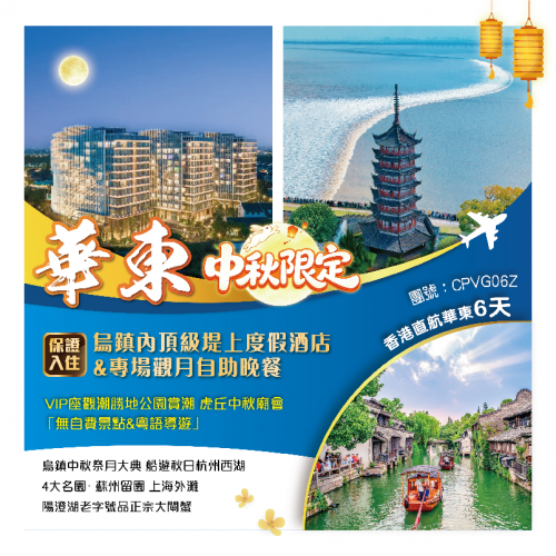 .酒店 -- 《國家地理》評為最美的江南水鄉「烏鎮西柵景區」(無限次乘坐景區遊覽車)遊覽醬坊,冶坊,水上集市等 -- 大航專享堤上度假酒店觀月自助晚餐 -- 烏鎮中秋特別節目:千裏共嬋娟烏鎮祭月大典,“昭明月集”曲韻風華民樂演奏,入夢靈水居光影秀