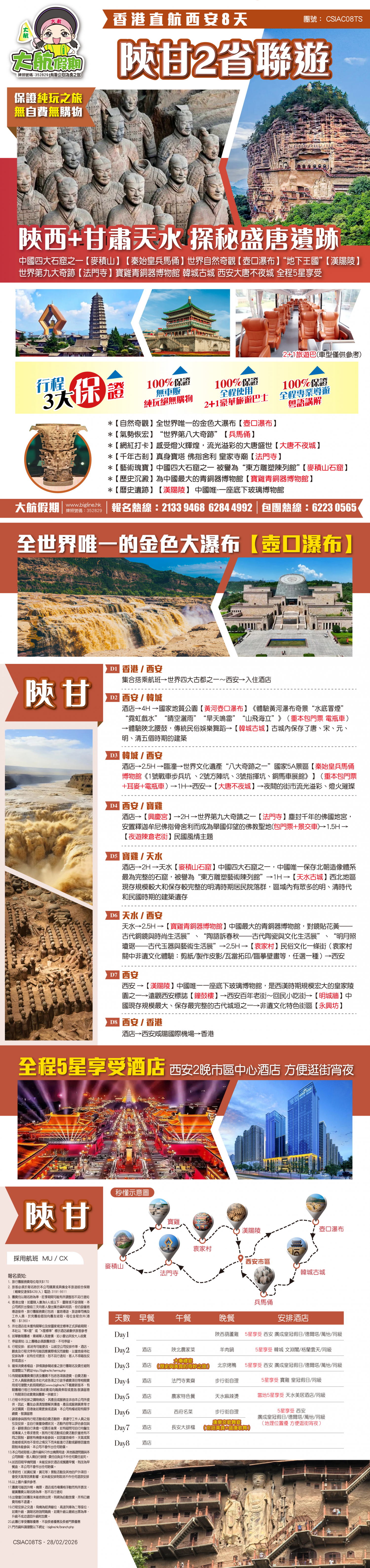 *團員繳付退票費後 (如適用): 1) 已繳款項可保留半年; 或 2) 選擇轉團後, 餘款則保留半年; 或 3) 可繳付『迫不得已理由』之手續費後, 取回已付餘款。 *個別機票+酒店套票產品如因『迫不得已理由』取消外遊行程, 處理旅客退款時亦按以上訂列收取每位退票費及手續費, 並以行程表 (套票單張) 所列為準。 責任細則: 1. 本公司保留合併團隊出發的權利。 2. 行程書或單張內所列費用根據當時機票價格及國際貨幣兌換率而訂立。外幣浮動等情況之下, 本公司保留在出發前調整各項費用的權利及徵收額外費用。 3. 所有列出的交通服務資料只供參考, 如有更改概不負責, 一切須以出票時為準。 4. 除本公司直接提供之服務外, 本公司及其職員或附屬公司或與本公司有經營關係之公司代理人身份在香港或外地安排其他獨立機構所提供之交通工具 (如飛機、輪船、火車、或遊覽巴士等) 、住宿、膳食或娛樂觀光項目等 (“委託機構”), 團員如遇交通延誤、行李遺失、意外傷亡或財物損失等, 該依照當地法律向擁有、管理或操作之委託機構直接交涉或追討賠償, 通常該等機構均各訂位不同條例, 以對客人負責。在此情況下, 本公司概不對該等損失或傷亡負責。 5. 除因由本公司之員工或其他直接管理或操作之機構之疏忽而引致團員之個人傷亡外, 本公司對團員在任何意外中之個人傷亡、經濟、娛樂或精神損失概不負責。 6. 除經本公司同意及安排, 如團員自行更改由其他人士代為參團, 本公司或其委託機構之職員有權取消其隨團之資格, 而無須發還任何團費, 而該人士在隨團期間之保險、責任賠償、行為後果等均由該人仕自行承擔。 7. 如因天氣、罷工、戰爭、怠工或安全情況影響而引致有關交通工具暫停服務, 停航或其他事故, 而必須將行程更改或取消部份行程, 本公司則將團員所繳交之費用扣除因以上事故而引致之損失後, 退回差額給團員。 8. 有關住宿、膳食、遊覽節目等問題, 均依據行程表安排, 行程先後次序有可能需要更改, 一切以當地安排為準。若遇特殊情況, 如簽證受阻, 當地酒店突告客滿或航機改變飛行時間或地點, 以及非本公司或其委託機構所能控制之因素, 令旅行團節目有增減, 或臨時更改交通工具、班機時間、機種及更換酒店等等, 本公司或其委託機構得依當時情況全權盡力處理, 團員不得藉故反對或退出, 因故取消之節目, 將不獲退還款項, 任何因延期而引致之額外支出, 本公司或其委託機構概不負責。 9. 所有酒店及住宿根據行程安排, 本公司視乎當時情形作出更改, 但不限於遇展覽會或特殊情況下, 將住宿鄰近城市之同等級酒店及住宿代替。本公司如因『迫不得已理由(外遊)』(即指戰爭、政治動盪、恐怖襲擊、天災、疫症、惡劣天氣、交通工具發生技術問題、載運機構臨時更改班次或取消服務、罷工、工業行動、旅遊目的地政府或世界衛生組織發出旅遊警示(警告)、香港特別行政區政府發出紅色或黑色外遊警示、不可抗力事件,以及業界不能控制的其他不利離開香港或在香港境外旅遊的情況)於外遊旅行團出發後更改任何項目而引致成本增加,可向顧客徵收額外費用。 10. 【已成團】代表該團號之指定出發日期預訂機位或已有足夠人數報名參加。但出發與否還受其他因素影響, 本公司保留最終決定權。 11. 任何團員在參與各項活動時, 如經常不遵守服飾人員之指引或安排, 在行動或言語上侮辱或滋擾其他團員或工作人員, 本公司或其委託機構職員有權視具體情況而取消其隨團資格而母須發任何團費, 而受該旅客監護之18歲以下同行團員亦須一併離開, 有關旅客離團後一切活動, 概與本公司或其委託機構無關。 12. 團員如欲於旅程完畢後延期返港, 須於出發前十四天提出, 以便本公司代為預定返港機位, 延期返港之機位, 未能即時作實, 團員不得藉此理由要求退出, 旅程完畢後延期逗留之費用, 概由團員自負。 13. 延期返港之團友, 必須在離境前七十二小時向航空公司確實回程機位, 任何機位如有變更, 概與本公司無關。 14. 團員如在旅途中自行離團或放棄行程, 離團後之責任自負, 一切後果與本公司或其委託機構無關。 15. 參團者須切實遵守各國及各地法例, 包括但不限於防疫防控條例, 並嚴禁攜帶違例物品出入境, 並照實申報攜帶之物品及現金。 16. 任何種類的簽證審批權及出入境批准權一律由該國或地區之領事館及/或出入境部門全權決定, 出入境如有問題, 責任旅客自負, 本公司或其委託機構母須負任何責任。如簽證已代辦, 簽證費恕不退還。 17. 即使團員持有效之入境簽證及旅遊證件, 而於入境時被當值之移民局海關人員拒絕入境, 本公司或其委託機構亦無須負任何責任。所需額外安排之食宿、交通費用、全部由其本人負責, 其餘下的行程亦將不會獲得任何補償, 亦不得要求退款或改團。 18. 中國內地相關法規規定, 即日起旅客入住中國內地境內酒店時, 公安機關會透過酒店前台向旅客一併採集人像信息資訊。 19. 如出現一些非本公司能力範圍可控制之問題 (如花卉、紅葉提早凋謝或景觀、自然現象、景點活動或戶外項目) 會受天氣等因素影響, 如未能安排則取消不作任何退款安排。 20. 旅客如在旅程中確診 COVID-19或其他傳染病,無論受到當地政府隔離或其他檢疫要求影響與否,為確保其他旅客之安全,確診旅