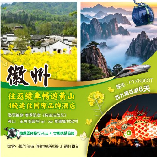 酒店享用早餐→参观國家一级博物馆【徽州文化博物馆】→人稱活動上河圖的宋代古街【屯溪老街】→黃山北站→香港西九龍站