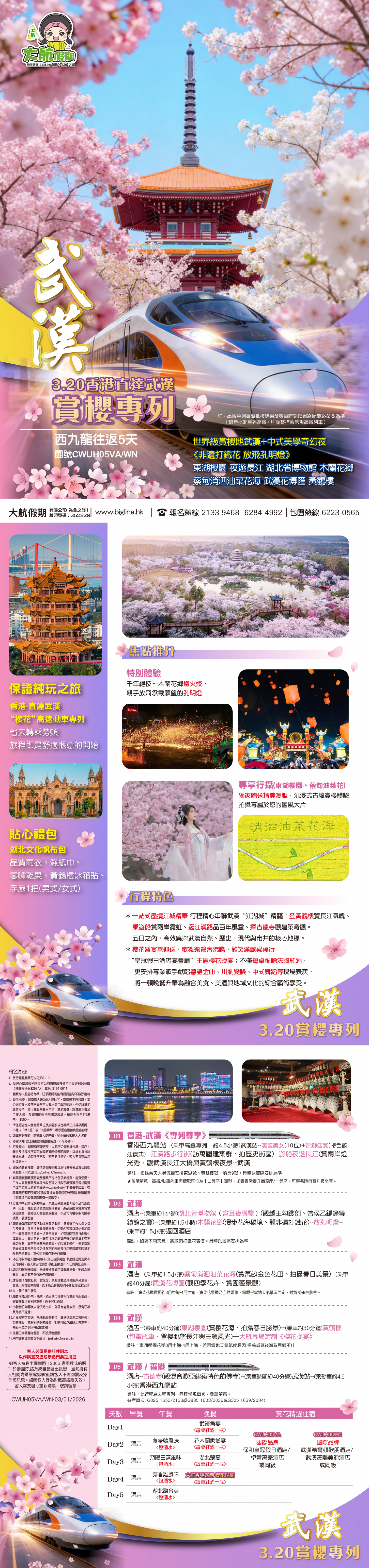 *團員繳付退票費後 (如適用): 1) 已繳款項可保留半年; 或 2) 選擇轉團後, 餘款則保留半年; 或 3) 可繳付『迫不得已理由』之手續費後, 取回已付餘款。 *個別機票+酒店套票產品如因『迫不得已理由』取消外遊行程, 處理旅客退款時亦按以上訂列收取每位退票費及手續費, 並以行程表 (套票單張) 所列為準。 責任細則: 1. 本公司保留合併團隊出發的權利。 2. 行程書或單張內所列費用根據當時機票價格及國際貨幣兌換率而訂立。外幣浮動等情況之下, 本公司保留在出發前調整各項費用的權利及徵收額外費用。 3. 所有列出的交通服務資料只供參考, 如有更改概不負責, 一切須以出票時為準。 4. 除本公司直接提供之服務外, 本公司及其職員或附屬公司或與本公司有經營關係之公司代理人身份在香港或外地安排其他獨立機構所提供之交通工具 (如飛機、輪船、火車、或遊覽巴士等) 、住宿、膳食或娛樂觀光項目等 (“委託機構”), 團員如遇交通延誤、行李遺失、意外傷亡或財物損失等, 該依照當地法律向擁有、管理或操作之委託機構直接交涉或追討賠償, 通常該等機構均各訂位不同條例, 以對客人負責。在此情況下, 本公司概不對該等損失或傷亡負責。 5. 除因由本公司之員工或其他直接管理或操作之機構之疏忽而引致團員之個人傷亡外, 本公司對團員在任何意外中之個人傷亡、經濟、娛樂或精神損失概不負責。 6. 除經本公司同意及安排, 如團員自行更改由其他人士代為參團, 本公司或其委託機構之職員有權取消其隨團之資格, 而無須發還任何團費, 而該人士在隨團期間之保險、責任賠償、行為後果等均由該人仕自行承擔。 7. 如因天氣、罷工、戰爭、怠工或安全情況影響而引致有關交通工具暫停服務, 停航或其他事故, 而必須將行程更改或取消部份行程, 本公司則將團員所繳交之費用扣除因以上事故而引致之損失後, 退回差額給團員。 8. 有關住宿、膳食、遊覽節目等問題, 均依據行程表安排, 行程先後次序有可能需要更改, 一切以當地安排為準。若遇特殊情況, 如簽證受阻, 當地酒店突告客滿或航機改變飛行時間或地點, 以及非本公司或其委託機構所能控制之因素, 令旅行團節目有增減, 或臨時更改交通工具、班機時間、機種及更換酒店等等, 本公司或其委託機構得依當時情況全權盡力處理, 團員不得藉故反對或退出, 因故取消之節目, 將不獲退還款項, 任何因延期而引致之額外支出, 本公司或其委託機構概不負責。 9. 所有酒店及住宿根據行程安排, 本公司視乎當時情形作出更改, 但不限於遇展覽會或特殊情況下, 將住宿鄰近城市之同等級酒店及住宿代替。本公司如因『迫不得已理由(外遊)』(即指戰爭、政治動盪、恐怖襲擊、天災、疫症、惡劣天氣、交通工具發生技術問題、載運機構臨時更改班次或取消服務、罷工、工業行動、旅遊目的地政府或世界衛生組織發出旅遊警示(警告)、香港特別行政區政府發出紅色或黑色外遊警示、不可抗力事件,以及業界不能控制的其他不利離開香港或在香港境外旅遊的情況)於外遊旅行團出發後更改任何項目而引致成本增加,可向顧客徵收額外費用。 10. 【已成團】代表該團號之指定出發日期預訂機位或已有足夠人數報名參加。但出發與否還受其他因素影響, 本公司保留最終決定權。 11. 任何團員在參與各項活動時, 如經常不遵守服飾人員之指引或安排, 在行動或言語上侮辱或滋擾其他團員或工作人員, 本公司或其委託機構職員有權視具體情況而取消其隨團資格而母須發任何團費, 而受該旅客監護之18歲以下同行團員亦須一併離開, 有關旅客離團後一切活動, 概與本公司或其委託機構無關。 12. 團員如欲於旅程完畢後延期返港, 須於出發前十四天提出, 以便本公司代為預定返港機位, 延期返港之機位, 未能即時作實, 團員不得藉此理由要求退出, 旅程完畢後延期逗留之費用, 概由團員自負。 13. 延期返港之團友, 必須在離境前七十二小時向航空公司確實回程機位, 任何機位如有變更, 概與本公司無關。 14. 團員如在旅途中自行離團或放棄行程, 離團後之責任自負, 一切後果與本公司或其委託機構無關。 15. 參團者須切實遵守各國及各地法例, 包括但不限於防疫防控條例, 並嚴禁攜帶違例物品出入境, 並照實申報攜帶之物品及現金。 16. 任何種類的簽證審批權及出入境批准權一律由該國或地區之領事館及/或出入境部門全權決定, 出入境如有問題, 責任旅客自負, 本公司或其委託機構母須負任何責任。如簽證已代辦, 簽證費恕不退還。 17. 即使團員持有效之入境簽證及旅遊證件, 而於入境時被當值之移民局海關人員拒絕入境, 本公司或其委託機構亦無須負任何責任。所需額外安排之食宿、交通費用、全部由其本人負責, 其餘下的行程亦將不會獲得任何補償, 亦不得要求退款或改團。 18. 中國內地相關法規規定, 即日起旅客入住中國內地境內酒店時, 公安機關會透過酒店前台向旅客一併採集人像信息資訊。 19. 如出現一些非本公司能力範圍可控制之問題 (如花卉、紅葉提早凋謝或景觀、自然現象、景點活動或戶外項目) 會受天氣等因素影響, 如未能安排則取消不作任何退款安排。 20. 旅客如在旅程中確診 COVID-19或其他傳染病,無論受到當地政府隔離或其他檢疫要求影響與否,為確保其他旅客之安全,確診旅