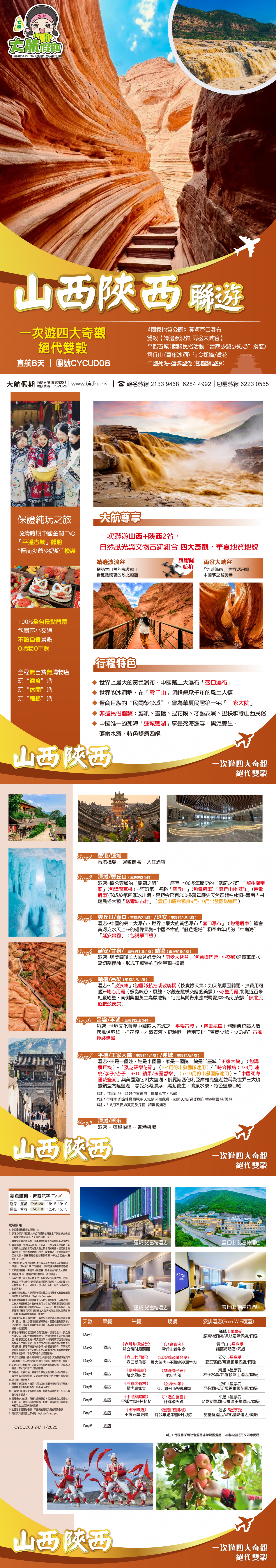 山西陝西 行攝絕代雙谷 《國家地質公園》黃河壺口瀑布 「靖邊波浪谷 雨岔大峽谷」平遙古城民俗活動“晉商少爺少奶奶”換裝 雲丘山(萬年冰洞) 時令採摘/賞花 中國死海▪運城鹽湖(體驗鹽療)直航8天