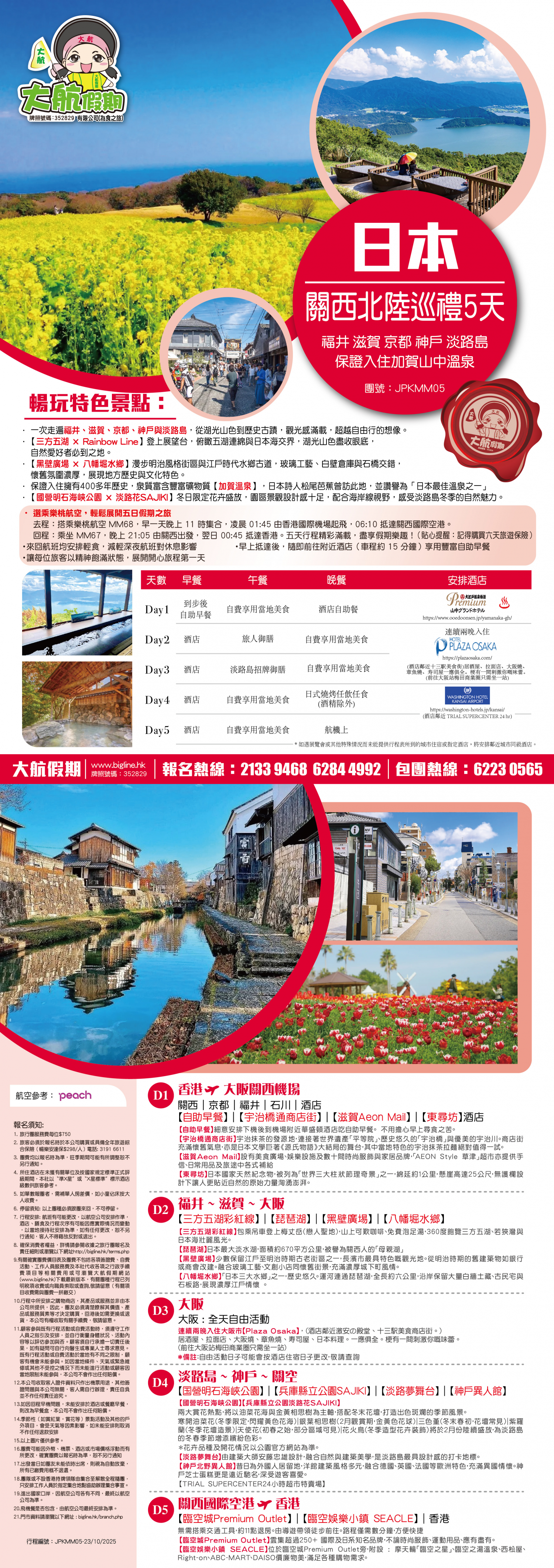 *團員繳付退票費後 (如適用): 1) 已繳款項可保留半年; 或 2) 選擇轉團後, 餘款則保留半年; 或 3) 可繳付『迫不得已理由』之手續費後, 取回已付餘款。 *個別機票+酒店套票產品如因『迫不得已理由』取消外遊行程, 處理旅客退款時亦按以上訂列收取每位退票費及手續費, 並以行程表 (套票單張) 所列為準。 責任細則: 1. 本公司保留合併團隊出發的權利。 2. 行程書或單張內所列費用根據當時機票價格及國際貨幣兌換率而訂立。外幣浮動等情況之下, 本公司保留在出發前調整各項費用的權利及徵收額外費用。 3. 所有列出的交通服務資料只供參考, 如有更改概不負責, 一切須以出票時為準。 4. 除本公司直接提供之服務外, 本公司及其職員或附屬公司或與本公司有經營關係之公司代理人身份在香港或外地安排其他獨立機構所提供之交通工具 (如飛機、輪船、火車、或遊覽巴士等) 、住宿、膳食或娛樂觀光項目等 (“委託機構”), 團員如遇交通延誤、行李遺失、意外傷亡或財物損失等, 該依照當地法律向擁有、管理或操作之委託機構直接交涉或追討賠償, 通常該等機構均各訂位不同條例, 以對客人負責。在此情況下, 本公司概不對該等損失或傷亡負責。 5. 除因由本公司之員工或其他直接管理或操作之機構之疏忽而引致團員之個人傷亡外, 本公司對團員在任何意外中之個人傷亡、經濟、娛樂或精神損失概不負責。 6. 除經本公司同意及安排, 如團員自行更改由其他人士代為參團, 本公司或其委託機構之職員有權取消其隨團之資格, 而無須發還任何團費, 而該人士在隨團期間之保險、責任賠償、行為後果等均由該人仕自行承擔。 7. 如因天氣、罷工、戰爭、怠工或安全情況影響而引致有關交通工具暫停服務, 停航或其他事故, 而必須將行程更改或取消部份行程, 本公司則將團員所繳交之費用扣除因以上事故而引致之損失後, 退回差額給團員。 8. 有關住宿、膳食、遊覽節目等問題, 均依據行程表安排, 行程先後次序有可能需要更改, 一切以當地安排為準。若遇特殊情況, 如簽證受阻, 當地酒店突告客滿或航機改變飛行時間或地點, 以及非本公司或其委託機構所能控制之因素, 令旅行團節目有增減, 或臨時更改交通工具、班機時間、機種及更換酒店等等, 本公司或其委託機構得依當時情況全權盡力處理, 團員不得藉故反對或退出, 因故取消之節目, 將不獲退還款項, 任何因延期而引致之額外支出, 本公司或其委託機構概不負責。 9. 所有酒店及住宿根據行程安排, 本公司視乎當時情形作出更改, 但不限於遇展覽會或特殊情況下, 將住宿鄰近城市之同等級酒店及住宿代替。本公司如因『迫不得已理由(外遊)』(即指戰爭、政治動盪、恐怖襲擊、天災、疫症、惡劣天氣、交通工具發生技術問題、載運機構臨時更改班次或取消服務、罷工、工業行動、旅遊目的地政府或世界衛生組織發出旅遊警示(警告)、香港特別行政區政府發出紅色或黑色外遊警示、不可抗力事件,以及業界不能控制的其他不利離開香港或在香港境外旅遊的情況)於外遊旅行團出發後更改任何項目而引致成本增加,可向顧客徵收額外費用。 10. 【已成團】代表該團號之指定出發日期預訂機位或已有足夠人數報名參加。但出發與否還受其他因素影響, 本公司保留最終決定權。 11. 任何團員在參與各項活動時, 如經常不遵守服飾人員之指引或安排, 在行動或言語上侮辱或滋擾其他團員或工作人員, 本公司或其委託機構職員有權視具體情況而取消其隨團資格而母須發任何團費, 而受該旅客監護之18歲以下同行團員亦須一併離開, 有關旅客離團後一切活動, 概與本公司或其委託機構無關。 12. 團員如欲於旅程完畢後延期返港, 須於出發前十四天提出, 以便本公司代為預定返港機位, 延期返港之機位, 未能即時作實, 團員不得藉此理由要求退出, 旅程完畢後延期逗留之費用, 概由團員自負。 13. 延期返港之團友, 必須在離境前七十二小時向航空公司確實回程機位, 任何機位如有變更, 概與本公司無關。 14. 團員如在旅途中自行離團或放棄行程, 離團後之責任自負, 一切後果與本公司或其委託機構無關。 15. 參團者須切實遵守各國及各地法例, 包括但不限於防疫防控條例, 並嚴禁攜帶違例物品出入境, 並照實申報攜帶之物品及現金。 16. 任何種類的簽證審批權及出入境批准權一律由該國或地區之領事館及/或出入境部門全權決定, 出入境如有問題, 責任旅客自負, 本公司或其委託機構母須負任何責任。如簽證已代辦, 簽證費恕不退還。 17. 即使團員持有效之入境簽證及旅遊證件, 而於入境時被當值之移民局海關人員拒絕入境, 本公司或其委託機構亦無須負任何責任。所需額外安排之食宿、交通費用、全部由其本人負責, 其餘下的行程亦將不會獲得任何補償, 亦不得要求退款或改團。 18. 中國內地相關法規規定, 即日起旅客入住中國內地境內酒店時, 公安機關會透過酒店前台向旅客一併採集人像信息資訊。 19. 如出現一些非本公司能力範圍可控制之問題 (如花卉、紅葉提早凋謝或景觀、自然現象、景點活動或戶外項目) 會受天氣等因素影響, 如未能安排則取消不作任何退款安排。 20. 旅客如在旅程中確診 COVID-19或其他傳染病,無論受到當地政府隔離或其他檢疫要求影響與否,為確保其他旅客之安全,確診旅