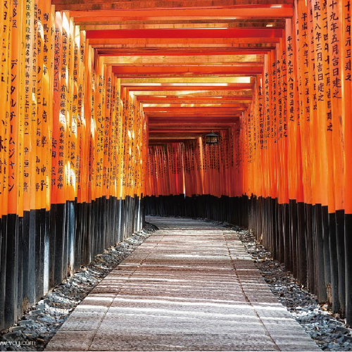 【千本鳥居‧伏見稻荷】昔日民眾為祈求五穀豐收而建的神社,供奉象徵守護與豐收的神使狐狸;後來商人為祈求生意興隆而奉納鳥居,至今累積數千座,綿延山道,形成壯觀的千本鳥居景致。