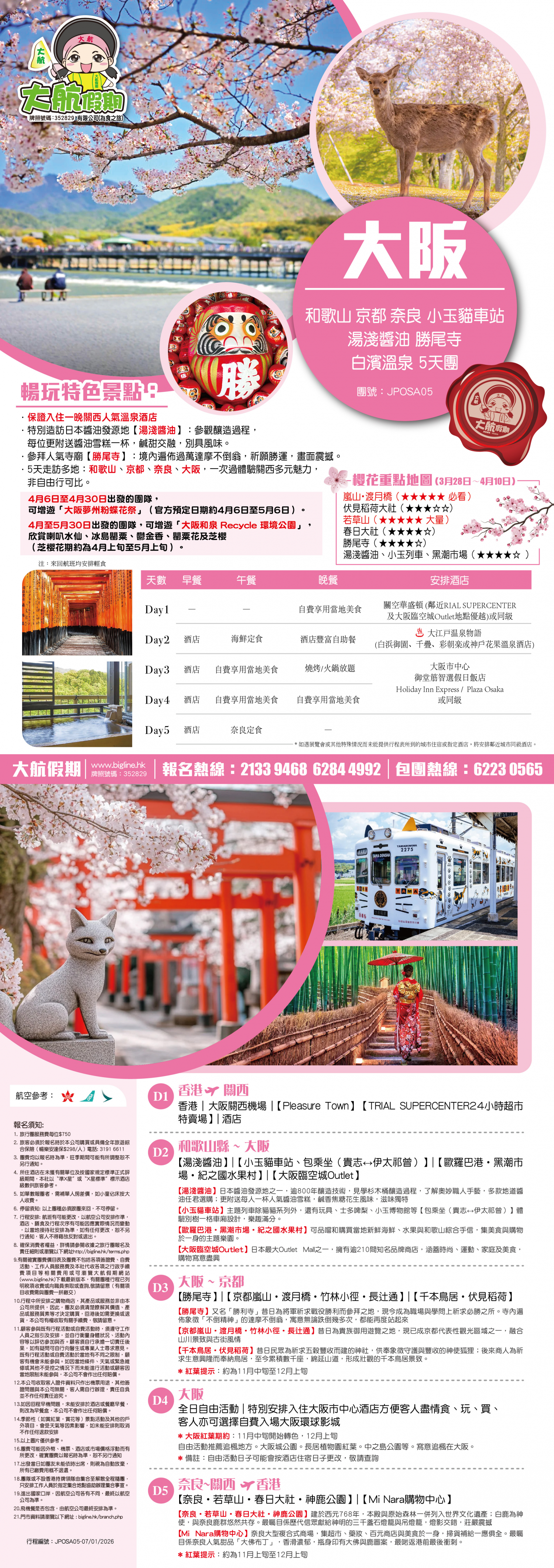 *團員繳付退票費後 (如適用): 1) 已繳款項可保留半年; 或 2) 選擇轉團後, 餘款則保留半年; 或 3) 可繳付『迫不得已理由』之手續費後, 取回已付餘款。 *個別機票+酒店套票產品如因『迫不得已理由』取消外遊行程, 處理旅客退款時亦按以上訂列收取每位退票費及手續費, 並以行程表 (套票單張) 所列為準。 責任細則: 1. 本公司保留合併團隊出發的權利。 2. 行程書或單張內所列費用根據當時機票價格及國際貨幣兌換率而訂立。外幣浮動等情況之下, 本公司保留在出發前調整各項費用的權利及徵收額外費用。 3. 所有列出的交通服務資料只供參考, 如有更改概不負責, 一切須以出票時為準。 4. 除本公司直接提供之服務外, 本公司及其職員或附屬公司或與本公司有經營關係之公司代理人身份在香港或外地安排其他獨立機構所提供之交通工具 (如飛機、輪船、火車、或遊覽巴士等) 、住宿、膳食或娛樂觀光項目等 (“委託機構”), 團員如遇交通延誤、行李遺失、意外傷亡或財物損失等, 該依照當地法律向擁有、管理或操作之委託機構直接交涉或追討賠償, 通常該等機構均各訂位不同條例, 以對客人負責。在此情況下, 本公司概不對該等損失或傷亡負責。 5. 除因由本公司之員工或其他直接管理或操作之機構之疏忽而引致團員之個人傷亡外, 本公司對團員在任何意外中之個人傷亡、經濟、娛樂或精神損失概不負責。 6. 除經本公司同意及安排, 如團員自行更改由其他人士代為參團, 本公司或其委託機構之職員有權取消其隨團之資格, 而無須發還任何團費, 而該人士在隨團期間之保險、責任賠償、行為後果等均由該人仕自行承擔。 7. 如因天氣、罷工、戰爭、怠工或安全情況影響而引致有關交通工具暫停服務, 停航或其他事故, 而必須將行程更改或取消部份行程, 本公司則將團員所繳交之費用扣除因以上事故而引致之損失後, 退回差額給團員。 8. 有關住宿、膳食、遊覽節目等問題, 均依據行程表安排, 行程先後次序有可能需要更改, 一切以當地安排為準。若遇特殊情況, 如簽證受阻, 當地酒店突告客滿或航機改變飛行時間或地點, 以及非本公司或其委託機構所能控制之因素, 令旅行團節目有增減, 或臨時更改交通工具、班機時間、機種及更換酒店等等, 本公司或其委託機構得依當時情況全權盡力處理, 團員不得藉故反對或退出, 因故取消之節目, 將不獲退還款項, 任何因延期而引致之額外支出, 本公司或其委託機構概不負責。 9. 所有酒店及住宿根據行程安排, 本公司視乎當時情形作出更改, 但不限於遇展覽會或特殊情況下, 將住宿鄰近城市之同等級酒店及住宿代替。本公司如因『迫不得已理由(外遊)』(即指戰爭、政治動盪、恐怖襲擊、天災、疫症、惡劣天氣、交通工具發生技術問題、載運機構臨時更改班次或取消服務、罷工、工業行動、旅遊目的地政府或世界衛生組織發出旅遊警示(警告)、香港特別行政區政府發出紅色或黑色外遊警示、不可抗力事件,以及業界不能控制的其他不利離開香港或在香港境外旅遊的情況)於外遊旅行團出發後更改任何項目而引致成本增加,可向顧客徵收額外費用。 10. 【已成團】代表該團號之指定出發日期預訂機位或已有足夠人數報名參加。但出發與否還受其他因素影響, 本公司保留最終決定權。 11. 任何團員在參與各項活動時, 如經常不遵守服飾人員之指引或安排, 在行動或言語上侮辱或滋擾其他團員或工作人員, 本公司或其委託機構職員有權視具體情況而取消其隨團資格而母須發任何團費, 而受該旅客監護之18歲以下同行團員亦須一併離開, 有關旅客離團後一切活動, 概與本公司或其委託機構無關。 12. 團員如欲於旅程完畢後延期返港, 須於出發前十四天提出, 以便本公司代為預定返港機位, 延期返港之機位, 未能即時作實, 團員不得藉此理由要求退出, 旅程完畢後延期逗留之費用, 概由團員自負。 13. 延期返港之團友, 必須在離境前七十二小時向航空公司確實回程機位, 任何機位如有變更, 概與本公司無關。 14. 團員如在旅途中自行離團或放棄行程, 離團後之責任自負, 一切後果與本公司或其委託機構無關。 15. 參團者須切實遵守各國及各地法例, 包括但不限於防疫防控條例, 並嚴禁攜帶違例物品出入境, 並照實申報攜帶之物品及現金。 16. 任何種類的簽證審批權及出入境批准權一律由該國或地區之領事館及/或出入境部門全權決定, 出入境如有問題, 責任旅客自負, 本公司或其委託機構母須負任何責任。如簽證已代辦, 簽證費恕不退還。 17. 即使團員持有效之入境簽證及旅遊證件, 而於入境時被當值之移民局海關人員拒絕入境, 本公司或其委託機構亦無須負任何責任。所需額外安排之食宿、交通費用、全部由其本人負責, 其餘下的行程亦將不會獲得任何補償, 亦不得要求退款或改團。 18. 中國內地相關法規規定, 即日起旅客入住中國內地境內酒店時, 公安機關會透過酒店前台向旅客一併採集人像信息資訊。 19. 如出現一些非本公司能力範圍可控制之問題 (如花卉、紅葉提早凋謝或景觀、自然現象、景點活動或戶外項目) 會受天氣等因素影響, 如未能安排則取消不作任何退款安排。 20. 旅客如在旅程中確診 COVID-19或其他傳染病,無論受到當地政府隔離或其他檢疫要求影響與否,為確保其他旅客之安全,確診旅