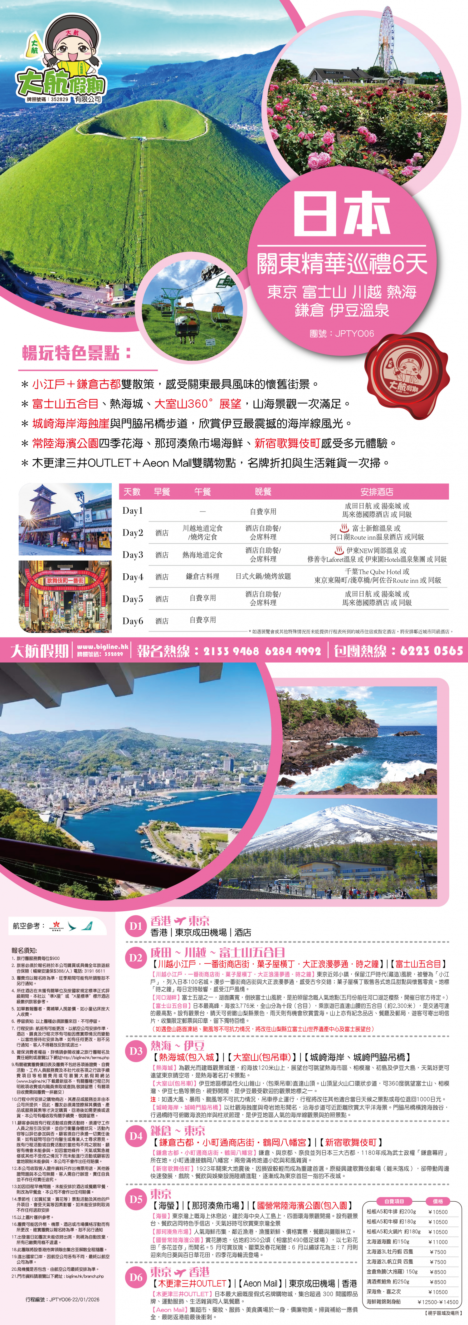*團員繳付退票費後 (如適用): 1) 已繳款項可保留半年; 或 2) 選擇轉團後, 餘款則保留半年; 或 3) 可繳付『迫不得已理由』之手續費後, 取回已付餘款。 *個別機票+酒店套票產品如因『迫不得已理由』取消外遊行程, 處理旅客退款時亦按以上訂列收取每位退票費及手續費, 並以行程表 (套票單張) 所列為準。 責任細則: 1. 本公司保留合併團隊出發的權利。 2. 行程書或單張內所列費用根據當時機票價格及國際貨幣兌換率而訂立。外幣浮動等情況之下, 本公司保留在出發前調整各項費用的權利及徵收額外費用。 3. 所有列出的交通服務資料只供參考, 如有更改概不負責, 一切須以出票時為準。 4. 除本公司直接提供之服務外, 本公司及其職員或附屬公司或與本公司有經營關係之公司代理人身份在香港或外地安排其他獨立機構所提供之交通工具 (如飛機、輪船、火車、或遊覽巴士等) 、住宿、膳食或娛樂觀光項目等 (“委託機構”), 團員如遇交通延誤、行李遺失、意外傷亡或財物損失等, 該依照當地法律向擁有、管理或操作之委託機構直接交涉或追討賠償, 通常該等機構均各訂位不同條例, 以對客人負責。在此情況下, 本公司概不對該等損失或傷亡負責。 5. 除因由本公司之員工或其他直接管理或操作之機構之疏忽而引致團員之個人傷亡外, 本公司對團員在任何意外中之個人傷亡、經濟、娛樂或精神損失概不負責。 6. 除經本公司同意及安排, 如團員自行更改由其他人士代為參團, 本公司或其委託機構之職員有權取消其隨團之資格, 而無須發還任何團費, 而該人士在隨團期間之保險、責任賠償、行為後果等均由該人仕自行承擔。 7. 如因天氣、罷工、戰爭、怠工或安全情況影響而引致有關交通工具暫停服務, 停航或其他事故, 而必須將行程更改或取消部份行程, 本公司則將團員所繳交之費用扣除因以上事故而引致之損失後, 退回差額給團員。 8. 有關住宿、膳食、遊覽節目等問題, 均依據行程表安排, 行程先後次序有可能需要更改, 一切以當地安排為準。若遇特殊情況, 如簽證受阻, 當地酒店突告客滿或航機改變飛行時間或地點, 以及非本公司或其委託機構所能控制之因素, 令旅行團節目有增減, 或臨時更改交通工具、班機時間、機種及更換酒店等等, 本公司或其委託機構得依當時情況全權盡力處理, 團員不得藉故反對或退出, 因故取消之節目, 將不獲退還款項, 任何因延期而引致之額外支出, 本公司或其委託機構概不負責。 9. 所有酒店及住宿根據行程安排, 本公司視乎當時情形作出更改, 但不限於遇展覽會或特殊情況下, 將住宿鄰近城市之同等級酒店及住宿代替。本公司如因『迫不得已理由(外遊)』(即指戰爭、政治動盪、恐怖襲擊、天災、疫症、惡劣天氣、交通工具發生技術問題、載運機構臨時更改班次或取消服務、罷工、工業行動、旅遊目的地政府或世界衛生組織發出旅遊警示(警告)、香港特別行政區政府發出紅色或黑色外遊警示、不可抗力事件,以及業界不能控制的其他不利離開香港或在香港境外旅遊的情況)於外遊旅行團出發後更改任何項目而引致成本增加,可向顧客徵收額外費用。 10. 【已成團】代表該團號之指定出發日期預訂機位或已有足夠人數報名參加。但出發與否還受其他因素影響, 本公司保留最終決定權。 11. 任何團員在參與各項活動時, 如經常不遵守服飾人員之指引或安排, 在行動或言語上侮辱或滋擾其他團員或工作人員, 本公司或其委託機構職員有權視具體情況而取消其隨團資格而母須發任何團費, 而受該旅客監護之18歲以下同行團員亦須一併離開, 有關旅客離團後一切活動, 概與本公司或其委託機構無關。 12. 團員如欲於旅程完畢後延期返港, 須於出發前十四天提出, 以便本公司代為預定返港機位, 延期返港之機位, 未能即時作實, 團員不得藉此理由要求退出, 旅程完畢後延期逗留之費用, 概由團員自負。 13. 延期返港之團友, 必須在離境前七十二小時向航空公司確實回程機位, 任何機位如有變更, 概與本公司無關。 14. 團員如在旅途中自行離團或放棄行程, 離團後之責任自負, 一切後果與本公司或其委託機構無關。 15. 參團者須切實遵守各國及各地法例, 包括但不限於防疫防控條例, 並嚴禁攜帶違例物品出入境, 並照實申報攜帶之物品及現金。 16. 任何種類的簽證審批權及出入境批准權一律由該國或地區之領事館及/或出入境部門全權決定, 出入境如有問題, 責任旅客自負, 本公司或其委託機構母須負任何責任。如簽證已代辦, 簽證費恕不退還。 17. 即使團員持有效之入境簽證及旅遊證件, 而於入境時被當值之移民局海關人員拒絕入境, 本公司或其委託機構亦無須負任何責任。所需額外安排之食宿、交通費用、全部由其本人負責, 其餘下的行程亦將不會獲得任何補償, 亦不得要求退款或改團。 18. 中國內地相關法規規定, 即日起旅客入住中國內地境內酒店時, 公安機關會透過酒店前台向旅客一併採集人像信息資訊。 19. 如出現一些非本公司能力範圍可控制之問題 (如花卉、紅葉提早凋謝或景觀、自然現象、景點活動或戶外項目) 會受天氣等因素影響, 如未能安排則取消不作任何退款安排。 20. 旅客如在旅程中確診 COVID-19或其他傳染病,無論受到當地政府隔離或其他檢疫要求影響與否,為確保其他旅客之安全,確診旅