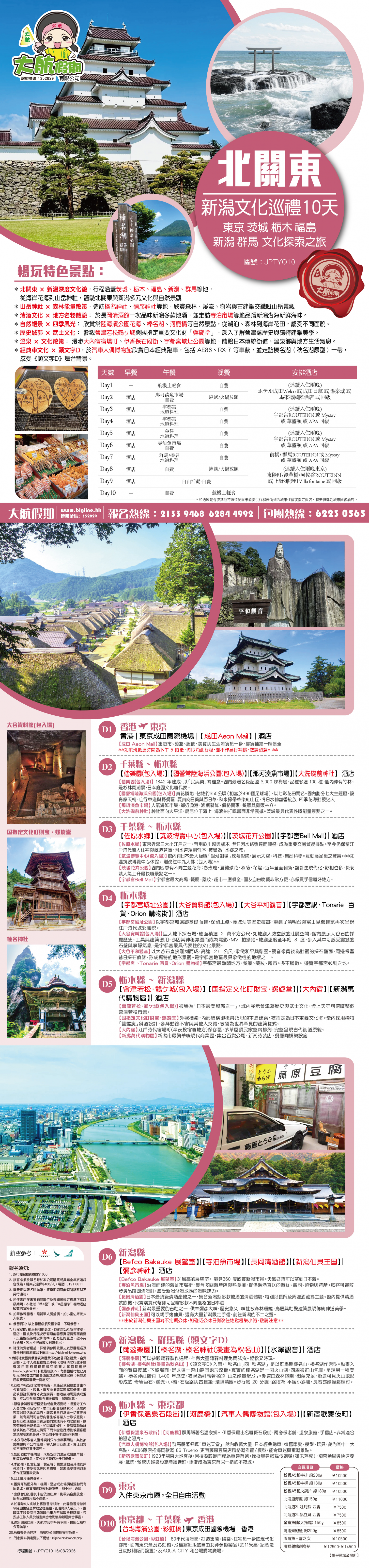 【会津若松.鶴ケ城(包入場)】│【国指定文化盯財宝.螺旋堂】│【大內宿】│【新潟萬代購物区】│酒店