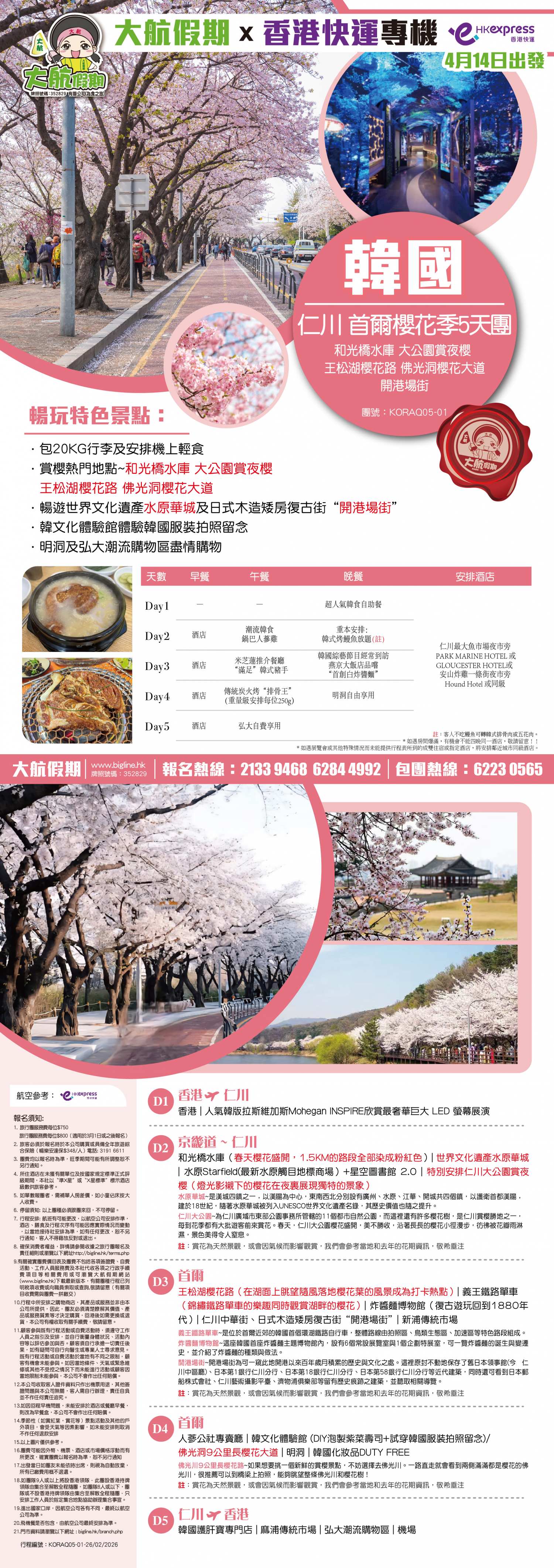 *團員繳付退票費後 (如適用): 1) 已繳款項可保留半年; 或 2) 選擇轉團後, 餘款則保留半年; 或 3) 可繳付『迫不得已理由』之手續費後, 取回已付餘款。 *個別機票+酒店套票產品如因『迫不得已理由』取消外遊行程, 處理旅客退款時亦按以上訂列收取每位退票費及手續費, 並以行程表 (套票單張) 所列為準。 責任細則: 1. 本公司保留合併團隊出發的權利。 2. 行程書或單張內所列費用根據當時機票價格及國際貨幣兌換率而訂立。外幣浮動等情況之下, 本公司保留在出發前調整各項費用的權利及徵收額外費用。 3. 所有列出的交通服務資料只供參考, 如有更改概不負責, 一切須以出票時為準。 4. 除本公司直接提供之服務外, 本公司及其職員或附屬公司或與本公司有經營關係之公司代理人身份在香港或外地安排其他獨立機構所提供之交通工具 (如飛機、輪船、火車、或遊覽巴士等) 、住宿、膳食或娛樂觀光項目等 (“委託機構”), 團員如遇交通延誤、行李遺失、意外傷亡或財物損失等, 該依照當地法律向擁有、管理或操作之委託機構直接交涉或追討賠償, 通常該等機構均各訂位不同條例, 以對客人負責。在此情況下, 本公司概不對該等損失或傷亡負責。 5. 除因由本公司之員工或其他直接管理或操作之機構之疏忽而引致團員之個人傷亡外, 本公司對團員在任何意外中之個人傷亡、經濟、娛樂或精神損失概不負責。 6. 除經本公司同意及安排, 如團員自行更改由其他人士代為參團, 本公司或其委託機構之職員有權取消其隨團之資格, 而無須發還任何團費, 而該人士在隨團期間之保險、責任賠償、行為後果等均由該人仕自行承擔。 7. 如因天氣、罷工、戰爭、怠工或安全情況影響而引致有關交通工具暫停服務, 停航或其他事故, 而必須將行程更改或取消部份行程, 本公司則將團員所繳交之費用扣除因以上事故而引致之損失後, 退回差額給團員。 8. 有關住宿、膳食、遊覽節目等問題, 均依據行程表安排, 行程先後次序有可能需要更改, 一切以當地安排為準。若遇特殊情況, 如簽證受阻, 當地酒店突告客滿或航機改變飛行時間或地點, 以及非本公司或其委託機構所能控制之因素, 令旅行團節目有增減, 或臨時更改交通工具、班機時間、機種及更換酒店等等, 本公司或其委託機構得依當時情況全權盡力處理, 團員不得藉故反對或退出, 因故取消之節目, 將不獲退還款項, 任何因延期而引致之額外支出, 本公司或其委託機構概不負責。 9. 所有酒店及住宿根據行程安排, 本公司視乎當時情形作出更改, 但不限於遇展覽會或特殊情況下, 將住宿鄰近城市之同等級酒店及住宿代替。本公司如因『迫不得已理由(外遊)』(即指戰爭、政治動盪、恐怖襲擊、天災、疫症、惡劣天氣、交通工具發生技術問題、載運機構臨時更改班次或取消服務、罷工、工業行動、旅遊目的地政府或世界衛生組織發出旅遊警示(警告)、香港特別行政區政府發出紅色或黑色外遊警示、不可抗力事件,以及業界不能控制的其他不利離開香港或在香港境外旅遊的情況)於外遊旅行團出發後更改任何項目而引致成本增加,可向顧客徵收額外費用。 10. 【已成團】代表該團號之指定出發日期預訂機位或已有足夠人數報名參加。但出發與否還受其他因素影響, 本公司保留最終決定權。 11. 任何團員在參與各項活動時, 如經常不遵守服飾人員之指引或安排, 在行動或言語上侮辱或滋擾其他團員或工作人員, 本公司或其委託機構職員有權視具體情況而取消其隨團資格而母須發任何團費, 而受該旅客監護之18歲以下同行團員亦須一併離開, 有關旅客離團後一切活動, 概與本公司或其委託機構無關。 12. 團員如欲於旅程完畢後延期返港, 須於出發前十四天提出, 以便本公司代為預定返港機位, 延期返港之機位, 未能即時作實, 團員不得藉此理由要求退出, 旅程完畢後延期逗留之費用, 概由團員自負。 13. 延期返港之團友, 必須在離境前七十二小時向航空公司確實回程機位, 任何機位如有變更, 概與本公司無關。 14. 團員如在旅途中自行離團或放棄行程, 離團後之責任自負, 一切後果與本公司或其委託機構無關。 15. 參團者須切實遵守各國及各地法例, 包括但不限於防疫防控條例, 並嚴禁攜帶違例物品出入境, 並照實申報攜帶之物品及現金。 16. 任何種類的簽證審批權及出入境批准權一律由該國或地區之領事館及/或出入境部門全權決定, 出入境如有問題, 責任旅客自負, 本公司或其委託機構母須負任何責任。如簽證已代辦, 簽證費恕不退還。 17. 即使團員持有效之入境簽證及旅遊證件, 而於入境時被當值之移民局海關人員拒絕入境, 本公司或其委託機構亦無須負任何責任。所需額外安排之食宿、交通費用、全部由其本人負責, 其餘下的行程亦將不會獲得任何補償, 亦不得要求退款或改團。 18. 中國內地相關法規規定, 即日起旅客入住中國內地境內酒店時, 公安機關會透過酒店前台向旅客一併採集人像信息資訊。 19. 如出現一些非本公司能力範圍可控制之問題 (如花卉、紅葉提早凋謝或景觀、自然現象、景點活動或戶外項目) 會受天氣等因素影響, 如未能安排則取消不作任何退款安排。 20. 旅客如在旅程中確診 COVID-19或其他傳染病,無論受到當地政府隔離或其他檢疫要求影響與否,為確保其他旅客之安全,確診旅