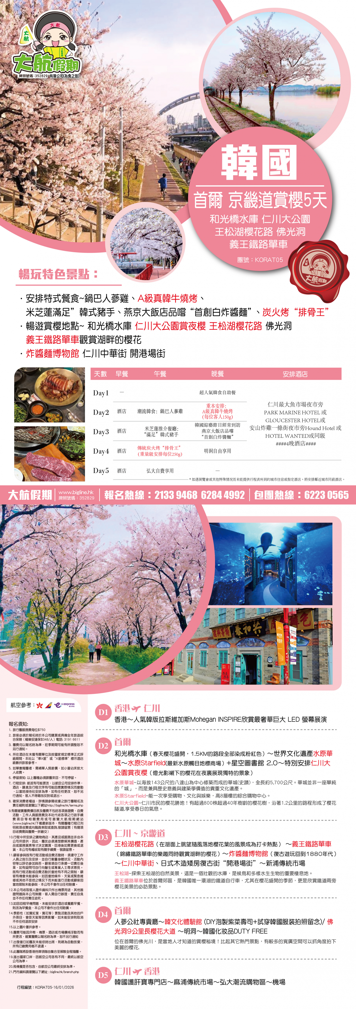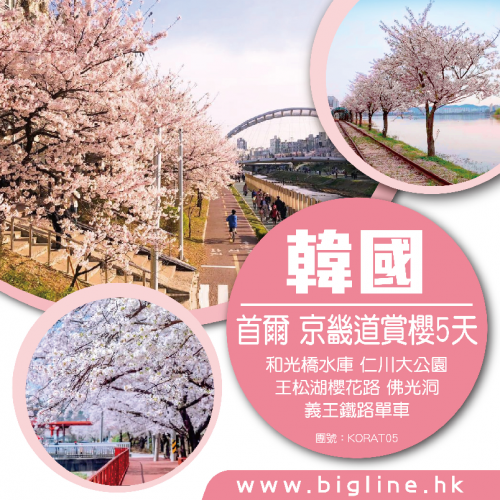 王松湖櫻花路 (在湖面上眺望隨風落地櫻花葉的風景成為打卡熱點) ~義王鐵路單車(錦繡鐵路單車的樂趣同時觀賞湖畔的櫻花)~炸醬麵博物館(復古遊玩回到1880年代)~仁川中華街、日式木造矮房復古街“開港場街”~新浦傳統市場