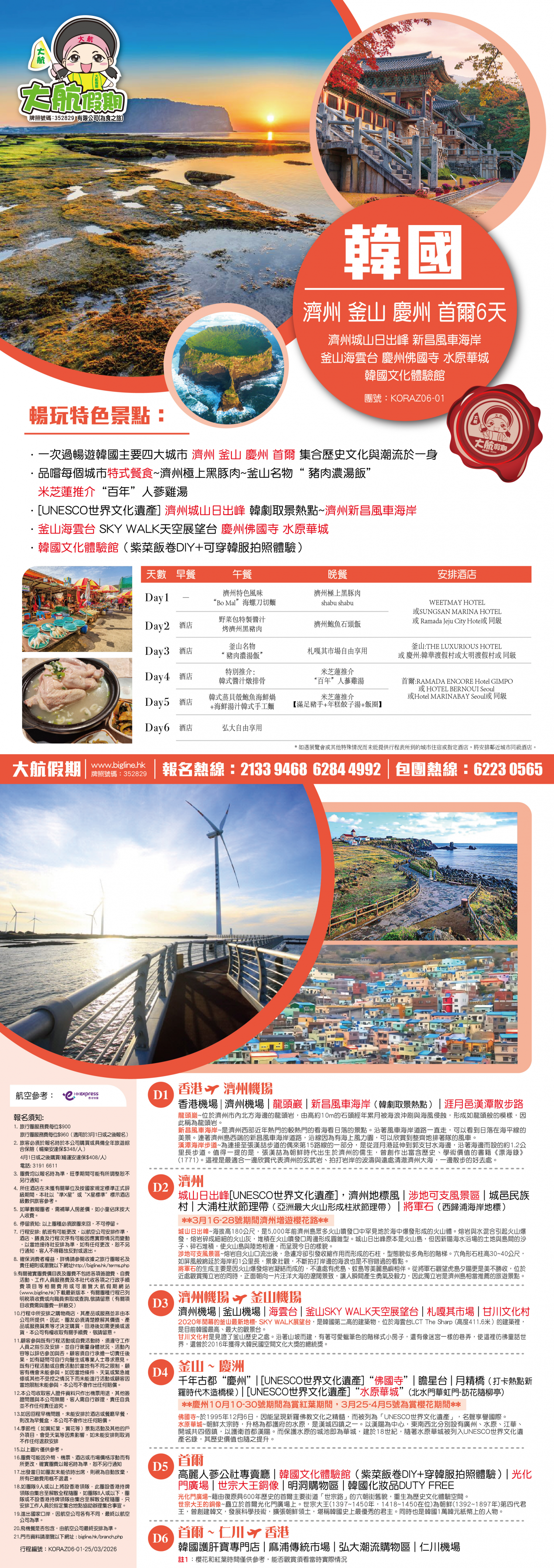 *團員繳付退票費後 (如適用): 1) 已繳款項可保留半年; 或 2) 選擇轉團後, 餘款則保留半年; 或 3) 可繳付『迫不得已理由』之手續費後, 取回已付餘款。 *個別機票+酒店套票產品如因『迫不得已理由』取消外遊行程, 處理旅客退款時亦按以上訂列收取每位退票費及手續費, 並以行程表 (套票單張) 所列為準。 責任細則: 1. 本公司保留合併團隊出發的權利。 2. 行程書或單張內所列費用根據當時機票價格及國際貨幣兌換率而訂立。外幣浮動等情況之下, 本公司保留在出發前調整各項費用的權利及徵收額外費用。 3. 所有列出的交通服務資料只供參考, 如有更改概不負責, 一切須以出票時為準。 4. 除本公司直接提供之服務外, 本公司及其職員或附屬公司或與本公司有經營關係之公司代理人身份在香港或外地安排其他獨立機構所提供之交通工具 (如飛機、輪船、火車、或遊覽巴士等) 、住宿、膳食或娛樂觀光項目等 (“委託機構”), 團員如遇交通延誤、行李遺失、意外傷亡或財物損失等, 該依照當地法律向擁有、管理或操作之委託機構直接交涉或追討賠償, 通常該等機構均各訂位不同條例, 以對客人負責。在此情況下, 本公司概不對該等損失或傷亡負責。 5. 除因由本公司之員工或其他直接管理或操作之機構之疏忽而引致團員之個人傷亡外, 本公司對團員在任何意外中之個人傷亡、經濟、娛樂或精神損失概不負責。 6. 除經本公司同意及安排, 如團員自行更改由其他人士代為參團, 本公司或其委託機構之職員有權取消其隨團之資格, 而無須發還任何團費, 而該人士在隨團期間之保險、責任賠償、行為後果等均由該人仕自行承擔。 7. 如因天氣、罷工、戰爭、怠工或安全情況影響而引致有關交通工具暫停服務, 停航或其他事故, 而必須將行程更改或取消部份行程, 本公司則將團員所繳交之費用扣除因以上事故而引致之損失後, 退回差額給團員。 8. 有關住宿、膳食、遊覽節目等問題, 均依據行程表安排, 行程先後次序有可能需要更改, 一切以當地安排為準。若遇特殊情況, 如簽證受阻, 當地酒店突告客滿或航機改變飛行時間或地點, 以及非本公司或其委託機構所能控制之因素, 令旅行團節目有增減, 或臨時更改交通工具、班機時間、機種及更換酒店等等, 本公司或其委託機構得依當時情況全權盡力處理, 團員不得藉故反對或退出, 因故取消之節目, 將不獲退還款項, 任何因延期而引致之額外支出, 本公司或其委託機構概不負責。 9. 所有酒店及住宿根據行程安排, 本公司視乎當時情形作出更改, 但不限於遇展覽會或特殊情況下, 將住宿鄰近城市之同等級酒店及住宿代替。本公司如因『迫不得已理由(外遊)』(即指戰爭、政治動盪、恐怖襲擊、天災、疫症、惡劣天氣、交通工具發生技術問題、載運機構臨時更改班次或取消服務、罷工、工業行動、旅遊目的地政府或世界衛生組織發出旅遊警示(警告)、香港特別行政區政府發出紅色或黑色外遊警示、不可抗力事件,以及業界不能控制的其他不利離開香港或在香港境外旅遊的情況)於外遊旅行團出發後更改任何項目而引致成本增加,可向顧客徵收額外費用。 10. 【已成團】代表該團號之指定出發日期預訂機位或已有足夠人數報名參加。但出發與否還受其他因素影響, 本公司保留最終決定權。 11. 任何團員在參與各項活動時, 如經常不遵守服飾人員之指引或安排, 在行動或言語上侮辱或滋擾其他團員或工作人員, 本公司或其委託機構職員有權視具體情況而取消其隨團資格而母須發任何團費, 而受該旅客監護之18歲以下同行團員亦須一併離開, 有關旅客離團後一切活動, 概與本公司或其委託機構無關。 12. 團員如欲於旅程完畢後延期返港, 須於出發前十四天提出, 以便本公司代為預定返港機位, 延期返港之機位, 未能即時作實, 團員不得藉此理由要求退出, 旅程完畢後延期逗留之費用, 概由團員自負。 13. 延期返港之團友, 必須在離境前七十二小時向航空公司確實回程機位, 任何機位如有變更, 概與本公司無關。 14. 團員如在旅途中自行離團或放棄行程, 離團後之責任自負, 一切後果與本公司或其委託機構無關。 15. 參團者須切實遵守各國及各地法例, 包括但不限於防疫防控條例, 並嚴禁攜帶違例物品出入境, 並照實申報攜帶之物品及現金。 16. 任何種類的簽證審批權及出入境批准權一律由該國或地區之領事館及/或出入境部門全權決定, 出入境如有問題, 責任旅客自負, 本公司或其委託機構母須負任何責任。如簽證已代辦, 簽證費恕不退還。 17. 即使團員持有效之入境簽證及旅遊證件, 而於入境時被當值之移民局海關人員拒絕入境, 本公司或其委託機構亦無須負任何責任。所需額外安排之食宿、交通費用、全部由其本人負責, 其餘下的行程亦將不會獲得任何補償, 亦不得要求退款或改團。 18. 中國內地相關法規規定, 即日起旅客入住中國內地境內酒店時, 公安機關會透過酒店前台向旅客一併採集人像信息資訊。 19. 如出現一些非本公司能力範圍可控制之問題 (如花卉、紅葉提早凋謝或景觀、自然現象、景點活動或戶外項目) 會受天氣等因素影響, 如未能安排則取消不作任何退款安排。 20. 旅客如在旅程中確診 COVID-19或其他傳染病,無論受到當地政府隔離或其他檢疫要求影響與否,為確保其他旅客之安全,確診旅