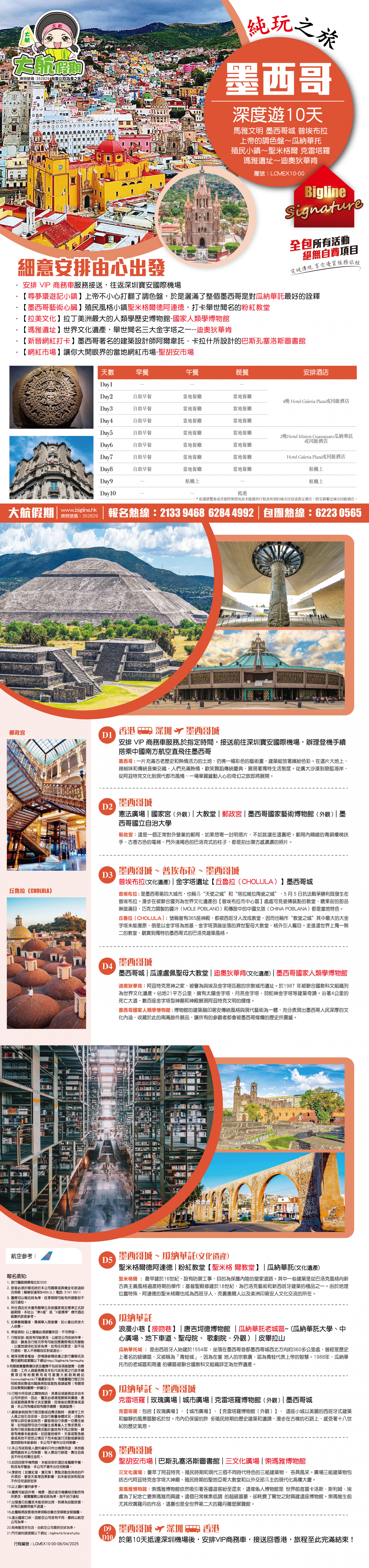 *團員繳付退票費後 (如適用): 1) 已繳款項可保留半年; 或 2) 選擇轉團後, 餘款則保留半年; 或 3) 可繳付『迫不得已理由』之手續費後, 取回已付餘款。 *個別機票+酒店套票產品如因『迫不得已理由』取消外遊行程, 處理旅客退款時亦按以上訂列收取每位退票費及手續費, 並以行程表 (套票單張) 所列為準。 責任細則: 1. 本公司保留合併團隊出發的權利。 2. 行程書或單張內所列費用根據當時機票價格及國際貨幣兌換率而訂立。外幣浮動等情況之下, 本公司保留在出發前調整各項費用的權利及徵收額外費用。 3. 所有列出的交通服務資料只供參考, 如有更改概不負責, 一切須以出票時為準。 4. 除本公司直接提供之服務外, 本公司及其職員或附屬公司或與本公司有經營關係之公司代理人身份在香港或外地安排其他獨立機構所提供之交通工具 (如飛機、輪船、火車、或遊覽巴士等) 、住宿、膳食或娛樂觀光項目等 (“委託機構”), 團員如遇交通延誤、行李遺失、意外傷亡或財物損失等, 該依照當地法律向擁有、管理或操作之委託機構直接交涉或追討賠償, 通常該等機構均各訂位不同條例, 以對客人負責。在此情況下, 本公司概不對該等損失或傷亡負責。 5. 除因由本公司之員工或其他直接管理或操作之機構之疏忽而引致團員之個人傷亡外, 本公司對團員在任何意外中之個人傷亡、經濟、娛樂或精神損失概不負責。 6. 除經本公司同意及安排, 如團員自行更改由其他人士代為參團, 本公司或其委託機構之職員有權取消其隨團之資格, 而無須發還任何團費, 而該人士在隨團期間之保險、責任賠償、行為後果等均由該人仕自行承擔。 7. 如因天氣、罷工、戰爭、怠工或安全情況影響而引致有關交通工具暫停服務, 停航或其他事故, 而必須將行程更改或取消部份行程, 本公司則將團員所繳交之費用扣除因以上事故而引致之損失後, 退回差額給團員。 8. 有關住宿、膳食、遊覽節目等問題, 均依據行程表安排, 行程先後次序有可能需要更改, 一切以當地安排為準。若遇特殊情況, 如簽證受阻, 當地酒店突告客滿或航機改變飛行時間或地點, 以及非本公司或其委託機構所能控制之因素, 令旅行團節目有增減, 或臨時更改交通工具、班機時間、機種及更換酒店等等, 本公司或其委託機構得依當時情況全權盡力處理, 團員不得藉故反對或退出, 因故取消之節目, 將不獲退還款項, 任何因延期而引致之額外支出, 本公司或其委託機構概不負責。 9. 所有酒店及住宿根據行程安排, 本公司視乎當時情形作出更改, 但不限於遇展覽會或特殊情況下, 將住宿鄰近城市之同等級酒店及住宿代替。本公司如因『迫不得已理由(外遊)』(即指戰爭、政治動盪、恐怖襲擊、天災、疫症、惡劣天氣、交通工具發生技術問題、載運機構臨時更改班次或取消服務、罷工、工業行動、旅遊目的地政府或世界衛生組織發出旅遊警示(警告)、香港特別行政區政府發出紅色或黑色外遊警示、不可抗力事件,以及業界不能控制的其他不利離開香港或在香港境外旅遊的情況)於外遊旅行團出發後更改任何項目而引致成本增加,可向顧客徵收額外費用。 10. 【已成團】代表該團號之指定出發日期預訂機位或已有足夠人數報名參加。但出發與否還受其他因素影響, 本公司保留最終決定權。 11. 任何團員在參與各項活動時, 如經常不遵守服飾人員之指引或安排, 在行動或言語上侮辱或滋擾其他團員或工作人員, 本公司或其委託機構職員有權視具體情況而取消其隨團資格而母須發任何團費, 而受該旅客監護之18歲以下同行團員亦須一併離開, 有關旅客離團後一切活動, 概與本公司或其委託機構無關。 12. 團員如欲於旅程完畢後延期返港, 須於出發前十四天提出, 以便本公司代為預定返港機位, 延期返港之機位, 未能即時作實, 團員不得藉此理由要求退出, 旅程完畢後延期逗留之費用, 概由團員自負。 13. 延期返港之團友, 必須在離境前七十二小時向航空公司確實回程機位, 任何機位如有變更, 概與本公司無關。 14. 團員如在旅途中自行離團或放棄行程, 離團後之責任自負, 一切後果與本公司或其委託機構無關。 15. 參團者須切實遵守各國及各地法例, 包括但不限於防疫防控條例, 並嚴禁攜帶違例物品出入境, 並照實申報攜帶之物品及現金。 16. 任何種類的簽證審批權及出入境批准權一律由該國或地區之領事館及/或出入境部門全權決定, 出入境如有問題, 責任旅客自負, 本公司或其委託機構母須負任何責任。如簽證已代辦, 簽證費恕不退還。 17. 即使團員持有效之入境簽證及旅遊證件, 而於入境時被當值之移民局海關人員拒絕入境, 本公司或其委託機構亦無須負任何責任。所需額外安排之食宿、交通費用、全部由其本人負責, 其餘下的行程亦將不會獲得任何補償, 亦不得要求退款或改團。 18. 中國內地相關法規規定, 即日起旅客入住中國內地境內酒店時, 公安機關會透過酒店前台向旅客一併採集人像信息資訊。 19. 如出現一些非本公司能力範圍可控制之問題 (如花卉、紅葉提早凋謝或景觀、自然現象、景點活動或戶外項目) 會受天氣等因素影響, 如未能安排則取消不作任何退款安排。 20. 旅客如在旅程中確診 COVID-19或其他傳染病,無論受到當地政府隔離或其他檢疫要求影響與否,為確保其他旅客之安全,確診旅