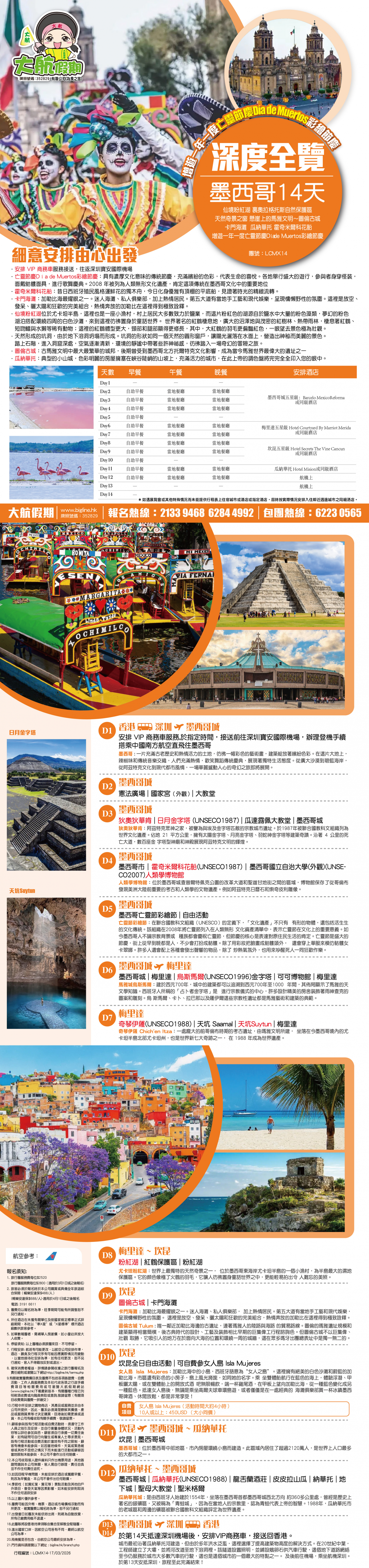 *團員繳付退票費後 (如適用): 1) 已繳款項可保留半年; 或 2) 選擇轉團後, 餘款則保留半年; 或 3) 可繳付『迫不得已理由』之手續費後, 取回已付餘款。 *個別機票+酒店套票產品如因『迫不得已理由』取消外遊行程, 處理旅客退款時亦按以上訂列收取每位退票費及手續費, 並以行程表 (套票單張) 所列為準。 責任細則: 1. 本公司保留合併團隊出發的權利。 2. 行程書或單張內所列費用根據當時機票價格及國際貨幣兌換率而訂立。外幣浮動等情況之下, 本公司保留在出發前調整各項費用的權利及徵收額外費用。 3. 所有列出的交通服務資料只供參考, 如有更改概不負責, 一切須以出票時為準。 4. 除本公司直接提供之服務外, 本公司及其職員或附屬公司或與本公司有經營關係之公司代理人身份在香港或外地安排其他獨立機構所提供之交通工具 (如飛機、輪船、火車、或遊覽巴士等) 、住宿、膳食或娛樂觀光項目等 (“委託機構”), 團員如遇交通延誤、行李遺失、意外傷亡或財物損失等, 該依照當地法律向擁有、管理或操作之委託機構直接交涉或追討賠償, 通常該等機構均各訂位不同條例, 以對客人負責。在此情況下, 本公司概不對該等損失或傷亡負責。 5. 除因由本公司之員工或其他直接管理或操作之機構之疏忽而引致團員之個人傷亡外, 本公司對團員在任何意外中之個人傷亡、經濟、娛樂或精神損失概不負責。 6. 除經本公司同意及安排, 如團員自行更改由其他人士代為參團, 本公司或其委託機構之職員有權取消其隨團之資格, 而無須發還任何團費, 而該人士在隨團期間之保險、責任賠償、行為後果等均由該人仕自行承擔。 7. 如因天氣、罷工、戰爭、怠工或安全情況影響而引致有關交通工具暫停服務, 停航或其他事故, 而必須將行程更改或取消部份行程, 本公司則將團員所繳交之費用扣除因以上事故而引致之損失後, 退回差額給團員。 8. 有關住宿、膳食、遊覽節目等問題, 均依據行程表安排, 行程先後次序有可能需要更改, 一切以當地安排為準。若遇特殊情況, 如簽證受阻, 當地酒店突告客滿或航機改變飛行時間或地點, 以及非本公司或其委託機構所能控制之因素, 令旅行團節目有增減, 或臨時更改交通工具、班機時間、機種及更換酒店等等, 本公司或其委託機構得依當時情況全權盡力處理, 團員不得藉故反對或退出, 因故取消之節目, 將不獲退還款項, 任何因延期而引致之額外支出, 本公司或其委託機構概不負責。 9. 所有酒店及住宿根據行程安排, 本公司視乎當時情形作出更改, 但不限於遇展覽會或特殊情況下, 將住宿鄰近城市之同等級酒店及住宿代替。本公司如因『迫不得已理由(外遊)』(即指戰爭、政治動盪、恐怖襲擊、天災、疫症、惡劣天氣、交通工具發生技術問題、載運機構臨時更改班次或取消服務、罷工、工業行動、旅遊目的地政府或世界衛生組織發出旅遊警示(警告)、香港特別行政區政府發出紅色或黑色外遊警示、不可抗力事件,以及業界不能控制的其他不利離開香港或在香港境外旅遊的情況)於外遊旅行團出發後更改任何項目而引致成本增加,可向顧客徵收額外費用。 10. 【已成團】代表該團號之指定出發日期預訂機位或已有足夠人數報名參加。但出發與否還受其他因素影響, 本公司保留最終決定權。 11. 任何團員在參與各項活動時, 如經常不遵守服飾人員之指引或安排, 在行動或言語上侮辱或滋擾其他團員或工作人員, 本公司或其委託機構職員有權視具體情況而取消其隨團資格而母須發任何團費, 而受該旅客監護之18歲以下同行團員亦須一併離開, 有關旅客離團後一切活動, 概與本公司或其委託機構無關。 12. 團員如欲於旅程完畢後延期返港, 須於出發前十四天提出, 以便本公司代為預定返港機位, 延期返港之機位, 未能即時作實, 團員不得藉此理由要求退出, 旅程完畢後延期逗留之費用, 概由團員自負。 13. 延期返港之團友, 必須在離境前七十二小時向航空公司確實回程機位, 任何機位如有變更, 概與本公司無關。 14. 團員如在旅途中自行離團或放棄行程, 離團後之責任自負, 一切後果與本公司或其委託機構無關。 15. 參團者須切實遵守各國及各地法例, 包括但不限於防疫防控條例, 並嚴禁攜帶違例物品出入境, 並照實申報攜帶之物品及現金。 16. 任何種類的簽證審批權及出入境批准權一律由該國或地區之領事館及/或出入境部門全權決定, 出入境如有問題, 責任旅客自負, 本公司或其委託機構母須負任何責任。如簽證已代辦, 簽證費恕不退還。 17. 即使團員持有效之入境簽證及旅遊證件, 而於入境時被當值之移民局海關人員拒絕入境, 本公司或其委託機構亦無須負任何責任。所需額外安排之食宿、交通費用、全部由其本人負責, 其餘下的行程亦將不會獲得任何補償, 亦不得要求退款或改團。 18. 中國內地相關法規規定, 即日起旅客入住中國內地境內酒店時, 公安機關會透過酒店前台向旅客一併採集人像信息資訊。 19. 如出現一些非本公司能力範圍可控制之問題 (如花卉、紅葉提早凋謝或景觀、自然現象、景點活動或戶外項目) 會受天氣等因素影響, 如未能安排則取消不作任何退款安排。 20. 旅客如在旅程中確診 COVID-19或其他傳染病,無論受到當地政府隔離或其他檢疫要求影響與否,為確保其他旅客之安全,確診旅
