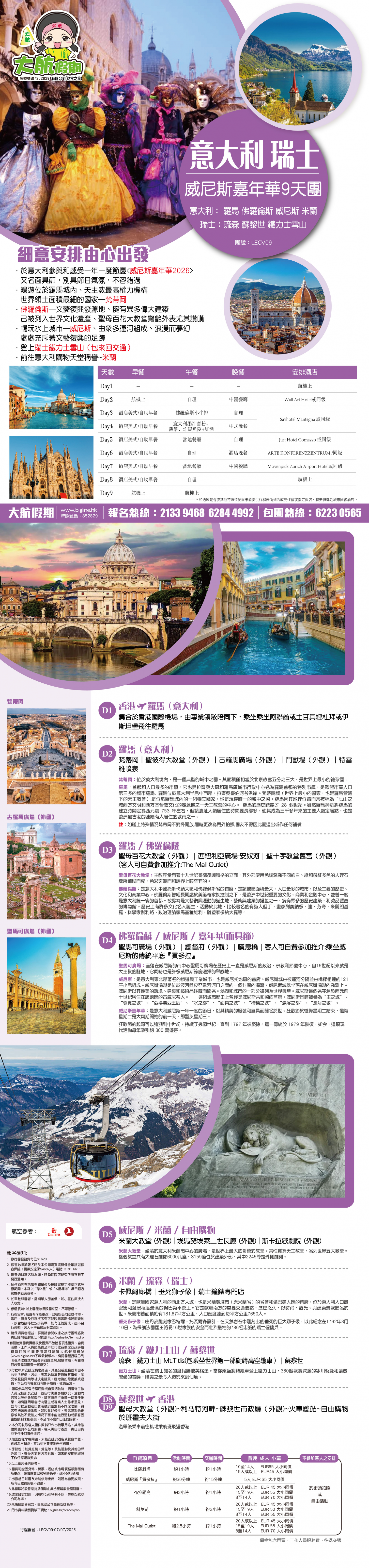 *團員繳付退票費後 (如適用): 1) 已繳款項可保留半年; 或 2) 選擇轉團後, 餘款則保留半年; 或 3) 可繳付『迫不得已理由』之手續費後, 取回已付餘款。 *個別機票+酒店套票產品如因『迫不得已理由』取消外遊行程, 處理旅客退款時亦按以上訂列收取每位退票費及手續費, 並以行程表 (套票單張) 所列為準。 責任細則: 1. 本公司保留合併團隊出發的權利。 2. 行程書或單張內所列費用根據當時機票價格及國際貨幣兌換率而訂立。外幣浮動等情況之下, 本公司保留在出發前調整各項費用的權利及徵收額外費用。 3. 所有列出的交通服務資料只供參考, 如有更改概不負責, 一切須以出票時為準。 4. 除本公司直接提供之服務外, 本公司及其職員或附屬公司或與本公司有經營關係之公司代理人身份在香港或外地安排其他獨立機構所提供之交通工具 (如飛機、輪船、火車、或遊覽巴士等) 、住宿、膳食或娛樂觀光項目等 (“委託機構”), 團員如遇交通延誤、行李遺失、意外傷亡或財物損失等, 該依照當地法律向擁有、管理或操作之委託機構直接交涉或追討賠償, 通常該等機構均各訂位不同條例, 以對客人負責。在此情況下, 本公司概不對該等損失或傷亡負責。 5. 除因由本公司之員工或其他直接管理或操作之機構之疏忽而引致團員之個人傷亡外, 本公司對團員在任何意外中之個人傷亡、經濟、娛樂或精神損失概不負責。 6. 除經本公司同意及安排, 如團員自行更改由其他人士代為參團, 本公司或其委託機構之職員有權取消其隨團之資格, 而無須發還任何團費, 而該人士在隨團期間之保險、責任賠償、行為後果等均由該人仕自行承擔。 7. 如因天氣、罷工、戰爭、怠工或安全情況影響而引致有關交通工具暫停服務, 停航或其他事故, 而必須將行程更改或取消部份行程, 本公司則將團員所繳交之費用扣除因以上事故而引致之損失後, 退回差額給團員。 8. 有關住宿、膳食、遊覽節目等問題, 均依據行程表安排, 行程先後次序有可能需要更改, 一切以當地安排為準。若遇特殊情況, 如簽證受阻, 當地酒店突告客滿或航機改變飛行時間或地點, 以及非本公司或其委託機構所能控制之因素, 令旅行團節目有增減, 或臨時更改交通工具、班機時間、機種及更換酒店等等, 本公司或其委託機構得依當時情況全權盡力處理, 團員不得藉故反對或退出, 因故取消之節目, 將不獲退還款項, 任何因延期而引致之額外支出, 本公司或其委託機構概不負責。 9. 所有酒店及住宿根據行程安排, 本公司視乎當時情形作出更改, 但不限於遇展覽會或特殊情況下, 將住宿鄰近城市之同等級酒店及住宿代替。本公司如因『迫不得已理由(外遊)』(即指戰爭、政治動盪、恐怖襲擊、天災、疫症、惡劣天氣、交通工具發生技術問題、載運機構臨時更改班次或取消服務、罷工、工業行動、旅遊目的地政府或世界衛生組織發出旅遊警示(警告)、香港特別行政區政府發出紅色或黑色外遊警示、不可抗力事件,以及業界不能控制的其他不利離開香港或在香港境外旅遊的情況)於外遊旅行團出發後更改任何項目而引致成本增加,可向顧客徵收額外費用。 10. 【已成團】代表該團號之指定出發日期預訂機位或已有足夠人數報名參加。但出發與否還受其他因素影響, 本公司保留最終決定權。 11. 任何團員在參與各項活動時, 如經常不遵守服飾人員之指引或安排, 在行動或言語上侮辱或滋擾其他團員或工作人員, 本公司或其委託機構職員有權視具體情況而取消其隨團資格而母須發任何團費, 而受該旅客監護之18歲以下同行團員亦須一併離開, 有關旅客離團後一切活動, 概與本公司或其委託機構無關。 12. 團員如欲於旅程完畢後延期返港, 須於出發前十四天提出, 以便本公司代為預定返港機位, 延期返港之機位, 未能即時作實, 團員不得藉此理由要求退出, 旅程完畢後延期逗留之費用, 概由團員自負。 13. 延期返港之團友, 必須在離境前七十二小時向航空公司確實回程機位, 任何機位如有變更, 概與本公司無關。 14. 團員如在旅途中自行離團或放棄行程, 離團後之責任自負, 一切後果與本公司或其委託機構無關。 15. 參團者須切實遵守各國及各地法例, 包括但不限於防疫防控條例, 並嚴禁攜帶違例物品出入境, 並照實申報攜帶之物品及現金。 16. 任何種類的簽證審批權及出入境批准權一律由該國或地區之領事館及/或出入境部門全權決定, 出入境如有問題, 責任旅客自負, 本公司或其委託機構母須負任何責任。如簽證已代辦, 簽證費恕不退還。 17. 即使團員持有效之入境簽證及旅遊證件, 而於入境時被當值之移民局海關人員拒絕入境, 本公司或其委託機構亦無須負任何責任。所需額外安排之食宿、交通費用、全部由其本人負責, 其餘下的行程亦將不會獲得任何補償, 亦不得要求退款或改團。 18. 中國內地相關法規規定, 即日起旅客入住中國內地境內酒店時, 公安機關會透過酒店前台向旅客一併採集人像信息資訊。 19. 如出現一些非本公司能力範圍可控制之問題 (如花卉、紅葉提早凋謝或景觀、自然現象、景點活動或戶外項目) 會受天氣等因素影響, 如未能安排則取消不作任何退款安排。 20. 旅客如在旅程中確診 COVID-19或其他傳染病,無論受到當地政府隔離或其他檢疫要求影響與否,為確保其他旅客之安全,確診旅