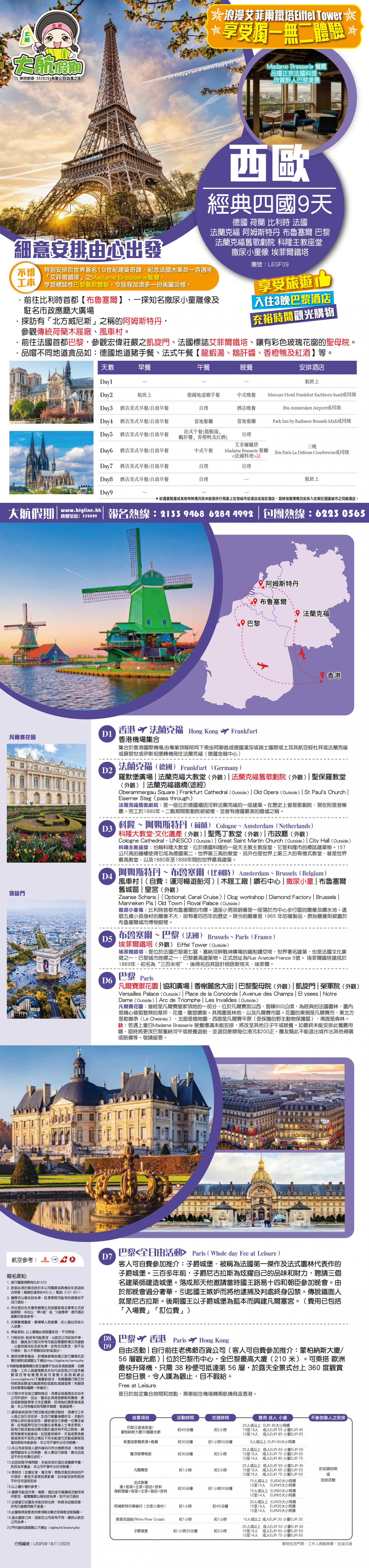 *團員繳付退票費後 (如適用): 1) 已繳款項可保留半年; 或 2) 選擇轉團後, 餘款則保留半年; 或 3) 可繳付『迫不得已理由』之手續費後, 取回已付餘款。 *個別機票+酒店套票產品如因『迫不得已理由』取消外遊行程, 處理旅客退款時亦按以上訂列收取每位退票費及手續費, 並以行程表 (套票單張) 所列為準。 責任細則: 1. 本公司保留合併團隊出發的權利。 2. 行程書或單張內所列費用根據當時機票價格及國際貨幣兌換率而訂立。外幣浮動等情況之下, 本公司保留在出發前調整各項費用的權利及徵收額外費用。 3. 所有列出的交通服務資料只供參考, 如有更改概不負責, 一切須以出票時為準。 4. 除本公司直接提供之服務外, 本公司及其職員或附屬公司或與本公司有經營關係之公司代理人身份在香港或外地安排其他獨立機構所提供之交通工具 (如飛機、輪船、火車、或遊覽巴士等) 、住宿、膳食或娛樂觀光項目等 (“委託機構”), 團員如遇交通延誤、行李遺失、意外傷亡或財物損失等, 該依照當地法律向擁有、管理或操作之委託機構直接交涉或追討賠償, 通常該等機構均各訂位不同條例, 以對客人負責。在此情況下, 本公司概不對該等損失或傷亡負責。 5. 除因由本公司之員工或其他直接管理或操作之機構之疏忽而引致團員之個人傷亡外, 本公司對團員在任何意外中之個人傷亡、經濟、娛樂或精神損失概不負責。 6. 除經本公司同意及安排, 如團員自行更改由其他人士代為參團, 本公司或其委託機構之職員有權取消其隨團之資格, 而無須發還任何團費, 而該人士在隨團期間之保險、責任賠償、行為後果等均由該人仕自行承擔。 7. 如因天氣、罷工、戰爭、怠工或安全情況影響而引致有關交通工具暫停服務, 停航或其他事故, 而必須將行程更改或取消部份行程, 本公司則將團員所繳交之費用扣除因以上事故而引致之損失後, 退回差額給團員。 8. 有關住宿、膳食、遊覽節目等問題, 均依據行程表安排, 行程先後次序有可能需要更改, 一切以當地安排為準。若遇特殊情況, 如簽證受阻, 當地酒店突告客滿或航機改變飛行時間或地點, 以及非本公司或其委託機構所能控制之因素, 令旅行團節目有增減, 或臨時更改交通工具、班機時間、機種及更換酒店等等, 本公司或其委託機構得依當時情況全權盡力處理, 團員不得藉故反對或退出, 因故取消之節目, 將不獲退還款項, 任何因延期而引致之額外支出, 本公司或其委託機構概不負責。 9. 所有酒店及住宿根據行程安排, 本公司視乎當時情形作出更改, 但不限於遇展覽會或特殊情況下, 將住宿鄰近城市之同等級酒店及住宿代替。本公司如因『迫不得已理由(外遊)』(即指戰爭、政治動盪、恐怖襲擊、天災、疫症、惡劣天氣、交通工具發生技術問題、載運機構臨時更改班次或取消服務、罷工、工業行動、旅遊目的地政府或世界衛生組織發出旅遊警示(警告)、香港特別行政區政府發出紅色或黑色外遊警示、不可抗力事件,以及業界不能控制的其他不利離開香港或在香港境外旅遊的情況)於外遊旅行團出發後更改任何項目而引致成本增加,可向顧客徵收額外費用。 10. 【已成團】代表該團號之指定出發日期預訂機位或已有足夠人數報名參加。但出發與否還受其他因素影響, 本公司保留最終決定權。 11. 任何團員在參與各項活動時, 如經常不遵守服飾人員之指引或安排, 在行動或言語上侮辱或滋擾其他團員或工作人員, 本公司或其委託機構職員有權視具體情況而取消其隨團資格而母須發任何團費, 而受該旅客監護之18歲以下同行團員亦須一併離開, 有關旅客離團後一切活動, 概與本公司或其委託機構無關。 12. 團員如欲於旅程完畢後延期返港, 須於出發前十四天提出, 以便本公司代為預定返港機位, 延期返港之機位, 未能即時作實, 團員不得藉此理由要求退出, 旅程完畢後延期逗留之費用, 概由團員自負。 13. 延期返港之團友, 必須在離境前七十二小時向航空公司確實回程機位, 任何機位如有變更, 概與本公司無關。 14. 團員如在旅途中自行離團或放棄行程, 離團後之責任自負, 一切後果與本公司或其委託機構無關。 15. 參團者須切實遵守各國及各地法例, 包括但不限於防疫防控條例, 並嚴禁攜帶違例物品出入境, 並照實申報攜帶之物品及現金。 16. 任何種類的簽證審批權及出入境批准權一律由該國或地區之領事館及/或出入境部門全權決定, 出入境如有問題, 責任旅客自負, 本公司或其委託機構母須負任何責任。如簽證已代辦, 簽證費恕不退還。 17. 即使團員持有效之入境簽證及旅遊證件, 而於入境時被當值之移民局海關人員拒絕入境, 本公司或其委託機構亦無須負任何責任。所需額外安排之食宿、交通費用、全部由其本人負責, 其餘下的行程亦將不會獲得任何補償, 亦不得要求退款或改團。 18. 中國內地相關法規規定, 即日起旅客入住中國內地境內酒店時, 公安機關會透過酒店前台向旅客一併採集人像信息資訊。 19. 如出現一些非本公司能力範圍可控制之問題 (如花卉、紅葉提早凋謝或景觀、自然現象、景點活動或戶外項目) 會受天氣等因素影響, 如未能安排則取消不作任何退款安排。 20. 旅客如在旅程中確診 COVID-19或其他傳染病,無論受到當地政府隔離或其他檢疫要求影響與否,為確保其他旅客之安全,確診旅