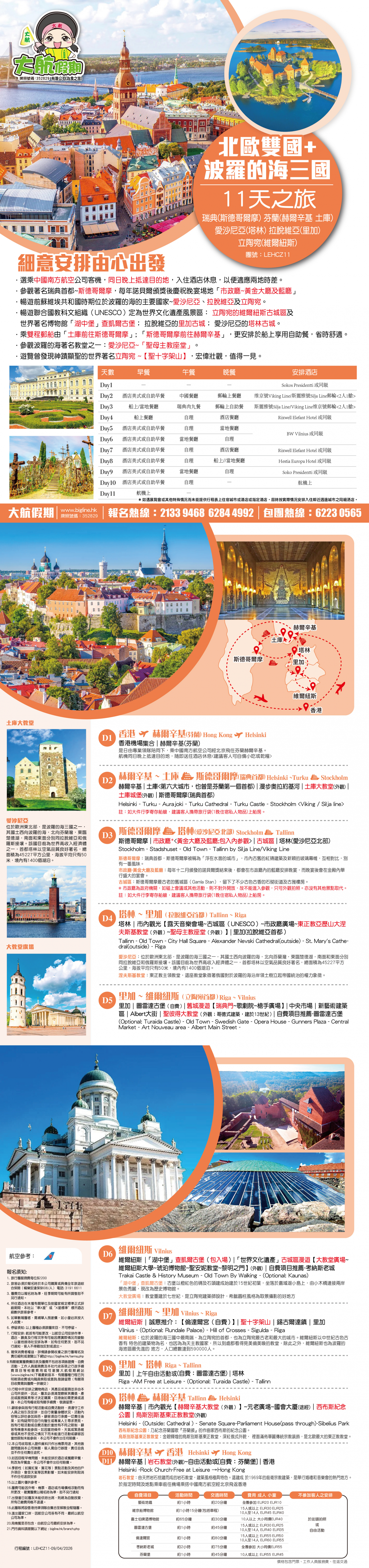 *團員繳付退票費後 (如適用): 1) 已繳款項可保留半年; 或 2) 選擇轉團後, 餘款則保留半年; 或 3) 可繳付『迫不得已理由』之手續費後, 取回已付餘款。 *個別機票+酒店套票產品如因『迫不得已理由』取消外遊行程, 處理旅客退款時亦按以上訂列收取每位退票費及手續費, 並以行程表 (套票單張) 所列為準。 責任細則: 1. 本公司保留合併團隊出發的權利。 2. 行程書或單張內所列費用根據當時機票價格及國際貨幣兌換率而訂立。外幣浮動等情況之下, 本公司保留在出發前調整各項費用的權利及徵收額外費用。 3. 所有列出的交通服務資料只供參考, 如有更改概不負責, 一切須以出票時為準。 4. 除本公司直接提供之服務外, 本公司及其職員或附屬公司或與本公司有經營關係之公司代理人身份在香港或外地安排其他獨立機構所提供之交通工具 (如飛機、輪船、火車、或遊覽巴士等) 、住宿、膳食或娛樂觀光項目等 (“委託機構”), 團員如遇交通延誤、行李遺失、意外傷亡或財物損失等, 該依照當地法律向擁有、管理或操作之委託機構直接交涉或追討賠償, 通常該等機構均各訂位不同條例, 以對客人負責。在此情況下, 本公司概不對該等損失或傷亡負責。 5. 除因由本公司之員工或其他直接管理或操作之機構之疏忽而引致團員之個人傷亡外, 本公司對團員在任何意外中之個人傷亡、經濟、娛樂或精神損失概不負責。 6. 除經本公司同意及安排, 如團員自行更改由其他人士代為參團, 本公司或其委託機構之職員有權取消其隨團之資格, 而無須發還任何團費, 而該人士在隨團期間之保險、責任賠償、行為後果等均由該人仕自行承擔。 7. 如因天氣、罷工、戰爭、怠工或安全情況影響而引致有關交通工具暫停服務, 停航或其他事故, 而必須將行程更改或取消部份行程, 本公司則將團員所繳交之費用扣除因以上事故而引致之損失後, 退回差額給團員。 8. 有關住宿、膳食、遊覽節目等問題, 均依據行程表安排, 行程先後次序有可能需要更改, 一切以當地安排為準。若遇特殊情況, 如簽證受阻, 當地酒店突告客滿或航機改變飛行時間或地點, 以及非本公司或其委託機構所能控制之因素, 令旅行團節目有增減, 或臨時更改交通工具、班機時間、機種及更換酒店等等, 本公司或其委託機構得依當時情況全權盡力處理, 團員不得藉故反對或退出, 因故取消之節目, 將不獲退還款項, 任何因延期而引致之額外支出, 本公司或其委託機構概不負責。 9. 所有酒店及住宿根據行程安排, 本公司視乎當時情形作出更改, 但不限於遇展覽會或特殊情況下, 將住宿鄰近城市之同等級酒店及住宿代替。本公司如因『迫不得已理由(外遊)』(即指戰爭、政治動盪、恐怖襲擊、天災、疫症、惡劣天氣、交通工具發生技術問題、載運機構臨時更改班次或取消服務、罷工、工業行動、旅遊目的地政府或世界衛生組織發出旅遊警示(警告)、香港特別行政區政府發出紅色或黑色外遊警示、不可抗力事件,以及業界不能控制的其他不利離開香港或在香港境外旅遊的情況)於外遊旅行團出發後更改任何項目而引致成本增加,可向顧客徵收額外費用。 10. 【已成團】代表該團號之指定出發日期預訂機位或已有足夠人數報名參加。但出發與否還受其他因素影響, 本公司保留最終決定權。 11. 任何團員在參與各項活動時, 如經常不遵守服飾人員之指引或安排, 在行動或言語上侮辱或滋擾其他團員或工作人員, 本公司或其委託機構職員有權視具體情況而取消其隨團資格而母須發任何團費, 而受該旅客監護之18歲以下同行團員亦須一併離開, 有關旅客離團後一切活動, 概與本公司或其委託機構無關。 12. 團員如欲於旅程完畢後延期返港, 須於出發前十四天提出, 以便本公司代為預定返港機位, 延期返港之機位, 未能即時作實, 團員不得藉此理由要求退出, 旅程完畢後延期逗留之費用, 概由團員自負。 13. 延期返港之團友, 必須在離境前七十二小時向航空公司確實回程機位, 任何機位如有變更, 概與本公司無關。 14. 團員如在旅途中自行離團或放棄行程, 離團後之責任自負, 一切後果與本公司或其委託機構無關。 15. 參團者須切實遵守各國及各地法例, 包括但不限於防疫防控條例, 並嚴禁攜帶違例物品出入境, 並照實申報攜帶之物品及現金。 16. 任何種類的簽證審批權及出入境批准權一律由該國或地區之領事館及/或出入境部門全權決定, 出入境如有問題, 責任旅客自負, 本公司或其委託機構母須負任何責任。如簽證已代辦, 簽證費恕不退還。 17. 即使團員持有效之入境簽證及旅遊證件, 而於入境時被當值之移民局海關人員拒絕入境, 本公司或其委託機構亦無須負任何責任。所需額外安排之食宿、交通費用、全部由其本人負責, 其餘下的行程亦將不會獲得任何補償, 亦不得要求退款或改團。 18. 中國內地相關法規規定, 即日起旅客入住中國內地境內酒店時, 公安機關會透過酒店前台向旅客一併採集人像信息資訊。 19. 如出現一些非本公司能力範圍可控制之問題 (如花卉、紅葉提早凋謝或景觀、自然現象、景點活動或戶外項目) 會受天氣等因素影響, 如未能安排則取消不作任何退款安排。 20. 旅客如在旅程中確診 COVID-19或其他傳染病,無論受到當地政府隔離或其他檢疫要求影響與否,為確保其他旅客之安全,確診旅