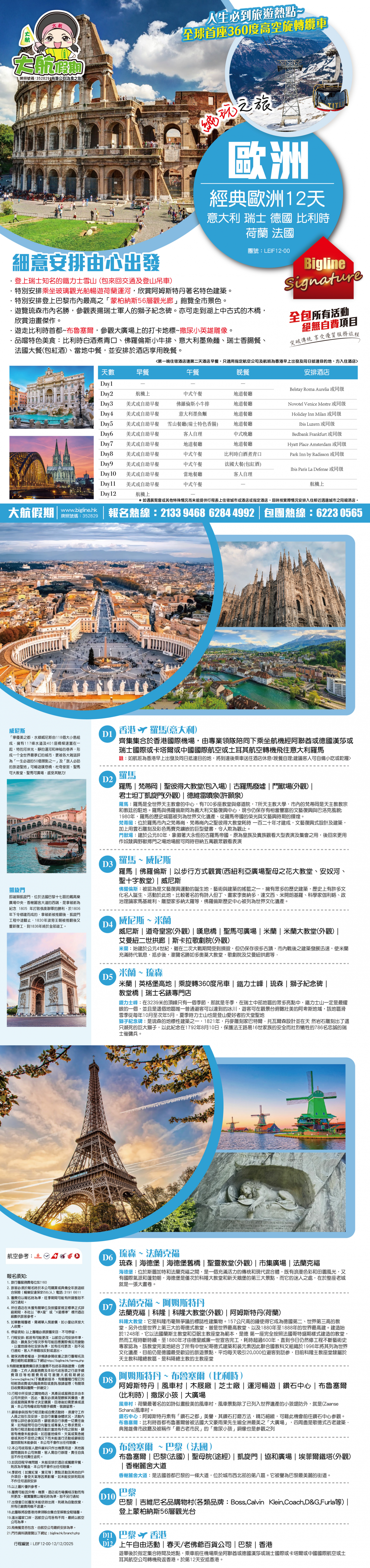 6. 團費及其他相關費用包括但不限於:稅項、機場保安費、旅行團服務費、郵輪服務費、旅遊保險的保費、有關簽證及其相關費用(包括但不限於簽證費及代辦簽證的服務費/手續費)須在出發前21天繳清, 長線則為30天前 (旺季期間須在出發前30天繳付, 長線則為 45天前), 個別線路亦將因應不同供應商之經營條件而作出調整,以該團的單張資料為準; 逾期未清繳費用者, 本公司得將訂位作廢, 所繳訂金例不發還, 亦不得將訂金轉予他人或轉用於其他日子出發及其他旅行團。 7. 付款方式以各訂購渠道之系統可接受為準。 8. 所有一切代收之款項,包括但不限於燃油附加費、香港及各地機場稅和機場建設稅等, 本公司只接受以現金或易辦事繳付所有代收費用。 - 信用卡/分期付款計劃或銀聯卡付款, 以銀行確認成功過賬, 方可作實。 - 請保留收據, 以作退款之憑據, 如以信用卡免息分期或銀聯卡付款, 則退款必須經由銀行辦理手續, 退回該信用卡/銀行戶口, 需時最少約三十五個工作天, 退款時間及一切有關條款均由信用卡公司決定。 9. 鑑於外幣浮動、因燃油附加費的浮動以致機票成本增加、或因事前未能預見的情況(包括但不限於交通票、酒店、保險等方面)導致成本上升, 本公司保留權利在顧客繳付全部團費及其他相關費用前向有關顧客徵收額外費用。價格如有更改, 將會另行通知。燃油附加費價格以航空公司最後公佈為準。一切費用必須於出發前全數繳付。受影響的顧客在無損其法律權利和責任的原則下,可選擇支付該額外費用以繼續參加該旅行團,或於該旅行團出發前選擇退出。如屬後者,本公司將於發出徵收額外費用通知後的七個工作日內(發出通知當日不計)或於顧客選擇退出該旅行團後的七個工作日內(顧客退出當日不計)(以較後發生者為準)退還或(如顧客以信用卡繳付款項)安排退還顧客所付的款項。 10. 減免折扣優惠, 必須於報名時申請及提供證明予本公司, 概不補發。 11. 當地參團之團費不設任何優惠。團員亦須自備國際機票、所有內陸機票及個別路線之部份交通安排。 12. 本公司收費上的年齡定義 : 0至23 個月為嬰兒; 2至11歲為小童 (根據不同線路釐定小童的年齡定義) ; 12歲或以上為成人。 13. 對未滿 18歲的顧客須符合下列報名要求: - 15 歲以下, 必須與父母及監護人同行 - 滿 15歲而未滿 18歲; 如非與父母或監護人同行, 則必須由父母及監護人同意並於報名表簽署作實及具備一份合適的旅遊綜合保險。 14. 各項交通服務供應商對乘載最高懷孕週數之孕婦或最低參加年齡之嬰兒各有所不同, 詳情請向本公司職員查詢。 15. 交通服務供應商可視乎顧客健康狀況, 要求醫療證明及或有效期內的新冠病毒陰性證明以示適合乘搭該交通, 並保留拒絕顧客登乘之權利。 16. 本公司保留接受報名與否之最終權利。 17. 所有團隊不包旅遊保險,本公司要求客人報名時須同時購買個人旅遊保險(廣東省旅行團除外),如客人自備個人全年旅遊保險則可豁免。廣東省旅行團如客人選擇不購買旅遊保險,閣下之人生及財物安全必須自理,責任概與旅行社無關。如客人非透過本公司購買個人旅遊保險而又要求本公司發出有關保險證明,則須收取港幣$100/人作為手續費。 費用包括: 1. 機票:來回經濟客位機票。(飛機線適用) 2. 酒店:根據行程表內所列之酒店或同級,以兩人共用一房為標準。單人房附加費則以一人佔一房為準。 3. 膳食:行程表內所列之團餐,交通服務供應商所提供之膳食則以其最終安排為準。 4. 鐵路 : 行程表所列之鐵路車票。 5. 交通:採用空氣調節遊覽車,開關冷暖氣需根據當地條例執行。 6. 觀光:各項遊覽節目均按照行程表內所列之遊覽節目及入場費用為根據。 7. 導遊 : 專業領隊/導遊隨團出發, 沿途安排及介紹。本公司於特殊情況下, 保留派領隊隨團出發之最終決定權, 團員不得籍故反對或退出。 8. 行李 : 每位限攜帶手提行李一件, 規格以交通服務供應商為準。寄艙行李數量及重量需視乎交通服務供應商而定, 如行李額外超重, 費用需由客人承擔。 9. 嬰兒收費只包括交通服務供應商出票費,不包括機位或座位、酒店、膳食及其他佔用座位之交通等安排。為免生疑問,本公司將不會為嬰兒額外提供團餐、酒店床位及任何交通公具(包括但不限於旅遊巴)的座位。如旅客要求提供嬰兒床,本公司將協助旅客向酒店要求安排,但酒店方面保留最終決定權。 費用不包括: 1. 旅遊證件及各國入境簽證費用。 2. 給予導遊/領隊/司機/工作人員之旅行團服務費。 3. 各地機場稅、額外附加費及指定稅項。 4. 行李超重費用。 5. 旅遊業監管印花成本。 6. 酒店、機場及各類交通工具之行李生服務費。 7. 自費項目或行程表以外之觀光節目。 8. 因交通阻延、罷工、颱風或其他突發情況而非本公司所能控制而引致之額外費用。 9. 綜合旅遊保險。為使各旅客獲得完善的旅遊保障,本公司建議必須自行購買綜合旅遊保險。 臨時取消及退款細則: 1. 本公司有權在旅行團出發前取消旅行團 (如參加人數不足 15人) 。在此等情況下, 本公司將按照下列規定處理:(取消3天或以下的旅行團)最少於出發前一日通知顧客;(取消4至9天的旅行團)最少於出發前七日通知顧客;(取消10天或以上的旅行團)最少於出發前14日通知顧客(通知顧客及出發當日均不計),以上不包括旺季及大假期的取