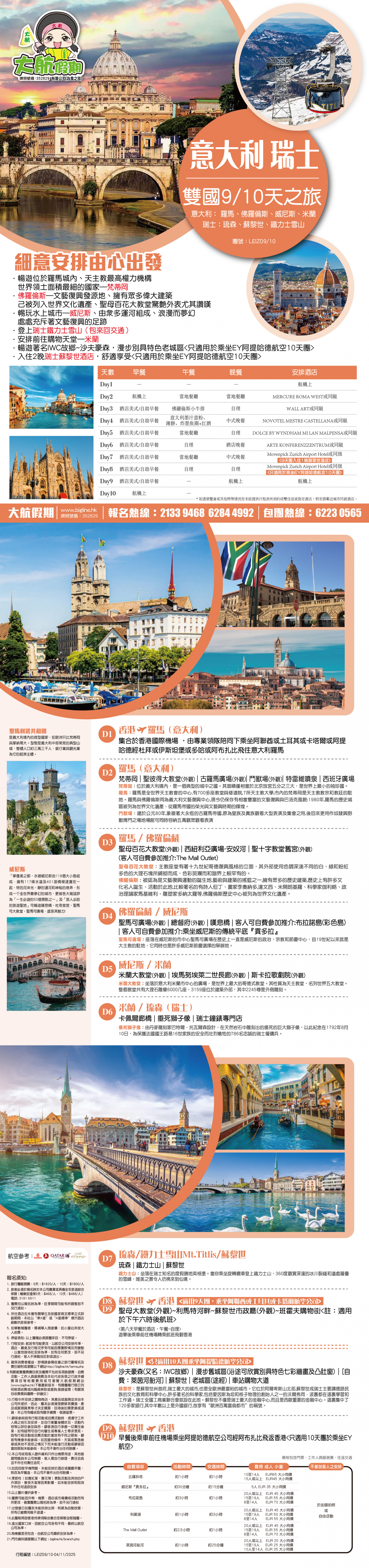 6. 團費及其他相關費用包括但不限於:稅項、機場保安費、旅行團服務費、郵輪服務費、旅遊保險的保費、有關簽證及其相關費用(包括但不限於簽證費及代辦簽證的服務費/手續費)須在出發前21天繳清, 長線則為30天前 (旺季期間須在出發前30天繳付, 長線則為 45天前), 個別線路亦將因應不同供應商之經營條件而作出調整,以該團的單張資料為準; 逾期未清繳費用者, 本公司得將訂位作廢, 所繳訂金例不發還, 亦不得將訂金轉予他人或轉用於其他日子出發及其他旅行團。 7. 付款方式以各訂購渠道之系統可接受為準。 8. 所有一切代收之款項,包括但不限於燃油附加費、香港及各地機場稅和機場建設稅等, 本公司只接受以現金或易辦事繳付所有代收費用。 - 信用卡/分期付款計劃或銀聯卡付款, 以銀行確認成功過賬, 方可作實。 - 請保留收據, 以作退款之憑據, 如以信用卡免息分期或銀聯卡付款, 則退款必須經由銀行辦理手續, 退回該信用卡/銀行戶口, 需時最少約三十五個工作天, 退款時間及一切有關條款均由信用卡公司決定。 9. 鑑於外幣浮動、因燃油附加費的浮動以致機票成本增加、或因事前未能預見的情況(包括但不限於交通票、酒店、保險等方面)導致成本上升, 本公司保留權利在顧客繳付全部團費及其他相關費用前向有關顧客徵收額外費用。價格如有更改, 將會另行通知。燃油附加費價格以航空公司最後公佈為準。一切費用必須於出發前全數繳付。受影響的顧客在無損其法律權利和責任的原則下,可選擇支付該額外費用以繼續參加該旅行團,或於該旅行團出發前選擇退出。如屬後者,本公司將於發出徵收額外費用通知後的七個工作日內(發出通知當日不計)或於顧客選擇退出該旅行團後的七個工作日內(顧客退出當日不計)(以較後發生者為準)退還或(如顧客以信用卡繳付款項)安排退還顧客所付的款項。 10. 減免折扣優惠, 必須於報名時申請及提供證明予本公司, 概不補發。 11. 當地參團之團費不設任何優惠。團員亦須自備國際機票、所有內陸機票及個別路線之部份交通安排。 12. 本公司收費上的年齡定義 : 0至23 個月為嬰兒; 2至11歲為小童 (根據不同線路釐定小童的年齡定義) ; 12歲或以上為成人。 13. 對未滿 18歲的顧客須符合下列報名要求: - 15 歲以下, 必須與父母及監護人同行 - 滿 15歲而未滿 18歲; 如非與父母或監護人同行, 則必須由父母及監護人同意並於報名表簽署作實及具備一份合適的旅遊綜合保險。 14. 各項交通服務供應商對乘載最高懷孕週數之孕婦或最低參加年齡之嬰兒各有所不同, 詳情請向本公司職員查詢。 15. 交通服務供應商可視乎顧客健康狀況, 要求醫療證明及或有效期內的新冠病毒陰性證明以示適合乘搭該交通, 並保留拒絕顧客登乘之權利。 16. 本公司保留接受報名與否之最終權利。 17. 所有團隊不包旅遊保險,本公司要求客人報名時須同時購買個人旅遊保險(廣東省旅行團除外),如客人自備個人全年旅遊保險則可豁免。廣東省旅行團如客人選擇不購買旅遊保險,閣下之人生及財物安全必須自理,責任概與旅行社無關。如客人非透過本公司購買個人旅遊保險而又要求本公司發出有關保險證明,則須收取港幣$100/人作為手續費。 費用包括: 1. 機票:來回經濟客位機票。(飛機線適用) 2. 酒店:根據行程表內所列之酒店或同級,以兩人共用一房為標準。單人房附加費則以一人佔一房為準。 3. 膳食:行程表內所列之團餐,交通服務供應商所提供之膳食則以其最終安排為準。 4. 鐵路 : 行程表所列之鐵路車票。 5. 交通:採用空氣調節遊覽車,開關冷暖氣需根據當地條例執行。 6. 觀光:各項遊覽節目均按照行程表內所列之遊覽節目及入場費用為根據。 7. 導遊 : 專業領隊/導遊隨團出發, 沿途安排及介紹。本公司於特殊情況下, 保留派領隊隨團出發之最終決定權, 團員不得籍故反對或退出。 8. 行李 : 每位限攜帶手提行李一件, 規格以交通服務供應商為準。寄艙行李數量及重量需視乎交通服務供應商而定, 如行李額外超重, 費用需由客人承擔。 9. 嬰兒收費只包括交通服務供應商出票費,不包括機位或座位、酒店、膳食及其他佔用座位之交通等安排。為免生疑問,本公司將不會為嬰兒額外提供團餐、酒店床位及任何交通公具(包括但不限於旅遊巴)的座位。如旅客要求提供嬰兒床,本公司將協助旅客向酒店要求安排,但酒店方面保留最終決定權。 費用不包括: 1. 旅遊證件及各國入境簽證費用。 2. 給予導遊/領隊/司機/工作人員之旅行團服務費。 3. 各地機場稅、額外附加費及指定稅項。 4. 行李超重費用。 5. 旅遊業監管印花成本。 6. 酒店、機場及各類交通工具之行李生服務費。 7. 自費項目或行程表以外之觀光節目。 8. 因交通阻延、罷工、颱風或其他突發情況而非本公司所能控制而引致之額外費用。 9. 綜合旅遊保險。為使各旅客獲得完善的旅遊保障,本公司建議必須自行購買綜合旅遊保險。 臨時取消及退款細則: 1. 本公司有權在旅行團出發前取消旅行團 (如參加人數不足 15人) 。在此等情況下, 本公司將按照下列規定處理:(取消3天或以下的旅行團)最少於出發前一日通知顧客;(取消4至9天的旅行團)最少於出發前七日通知顧客;(取消10天或以上的旅行團)最少於出發前14日通知顧客(通知顧客及出發當日均不計),以上不包括旺季及大假期的取