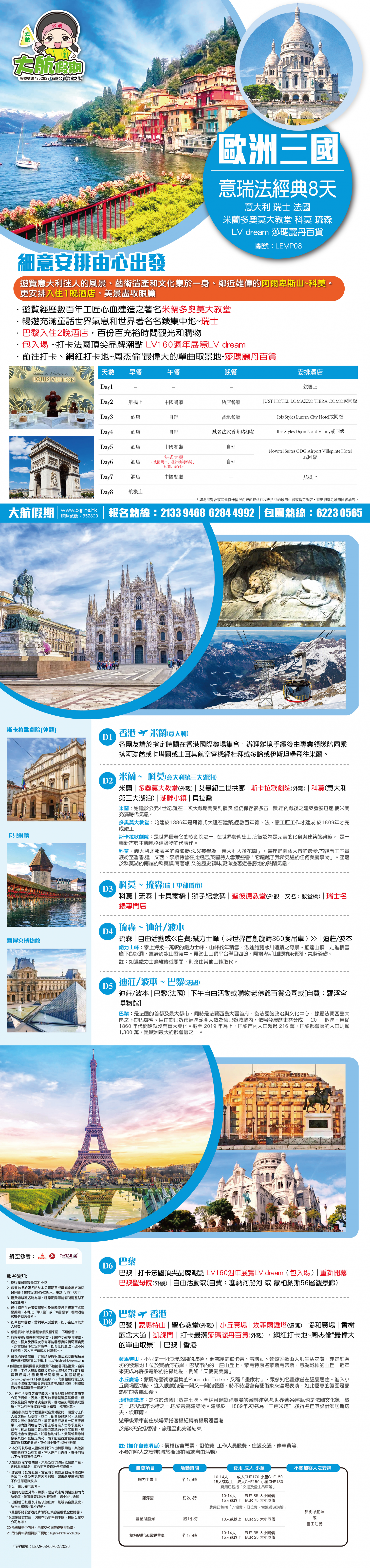 *團員繳付退票費後 (如適用): 1) 已繳款項可保留半年; 或 2) 選擇轉團後, 餘款則保留半年; 或 3) 可繳付『迫不得已理由』之手續費後, 取回已付餘款。 *個別機票+酒店套票產品如因『迫不得已理由』取消外遊行程, 處理旅客退款時亦按以上訂列收取每位退票費及手續費, 並以行程表 (套票單張) 所列為準。 責任細則: 1. 本公司保留合併團隊出發的權利。 2. 行程書或單張內所列費用根據當時機票價格及國際貨幣兌換率而訂立。外幣浮動等情況之下, 本公司保留在出發前調整各項費用的權利及徵收額外費用。 3. 所有列出的交通服務資料只供參考, 如有更改概不負責, 一切須以出票時為準。 4. 除本公司直接提供之服務外, 本公司及其職員或附屬公司或與本公司有經營關係之公司代理人身份在香港或外地安排其他獨立機構所提供之交通工具 (如飛機、輪船、火車、或遊覽巴士等) 、住宿、膳食或娛樂觀光項目等 (“委託機構”), 團員如遇交通延誤、行李遺失、意外傷亡或財物損失等, 該依照當地法律向擁有、管理或操作之委託機構直接交涉或追討賠償, 通常該等機構均各訂位不同條例, 以對客人負責。在此情況下, 本公司概不對該等損失或傷亡負責。 5. 除因由本公司之員工或其他直接管理或操作之機構之疏忽而引致團員之個人傷亡外, 本公司對團員在任何意外中之個人傷亡、經濟、娛樂或精神損失概不負責。 6. 除經本公司同意及安排, 如團員自行更改由其他人士代為參團, 本公司或其委託機構之職員有權取消其隨團之資格, 而無須發還任何團費, 而該人士在隨團期間之保險、責任賠償、行為後果等均由該人仕自行承擔。 7. 如因天氣、罷工、戰爭、怠工或安全情況影響而引致有關交通工具暫停服務, 停航或其他事故, 而必須將行程更改或取消部份行程, 本公司則將團員所繳交之費用扣除因以上事故而引致之損失後, 退回差額給團員。 8. 有關住宿、膳食、遊覽節目等問題, 均依據行程表安排, 行程先後次序有可能需要更改, 一切以當地安排為準。若遇特殊情況, 如簽證受阻, 當地酒店突告客滿或航機改變飛行時間或地點, 以及非本公司或其委託機構所能控制之因素, 令旅行團節目有增減, 或臨時更改交通工具、班機時間、機種及更換酒店等等, 本公司或其委託機構得依當時情況全權盡力處理, 團員不得藉故反對或退出, 因故取消之節目, 將不獲退還款項, 任何因延期而引致之額外支出, 本公司或其委託機構概不負責。 9. 所有酒店及住宿根據行程安排, 本公司視乎當時情形作出更改, 但不限於遇展覽會或特殊情況下, 將住宿鄰近城市之同等級酒店及住宿代替。本公司如因『迫不得已理由(外遊)』(即指戰爭、政治動盪、恐怖襲擊、天災、疫症、惡劣天氣、交通工具發生技術問題、載運機構臨時更改班次或取消服務、罷工、工業行動、旅遊目的地政府或世界衛生組織發出旅遊警示(警告)、香港特別行政區政府發出紅色或黑色外遊警示、不可抗力事件,以及業界不能控制的其他不利離開香港或在香港境外旅遊的情況)於外遊旅行團出發後更改任何項目而引致成本增加,可向顧客徵收額外費用。 10. 【已成團】代表該團號之指定出發日期預訂機位或已有足夠人數報名參加。但出發與否還受其他因素影響, 本公司保留最終決定權。 11. 任何團員在參與各項活動時, 如經常不遵守服飾人員之指引或安排, 在行動或言語上侮辱或滋擾其他團員或工作人員, 本公司或其委託機構職員有權視具體情況而取消其隨團資格而母須發任何團費, 而受該旅客監護之18歲以下同行團員亦須一併離開, 有關旅客離團後一切活動, 概與本公司或其委託機構無關。 12. 團員如欲於旅程完畢後延期返港, 須於出發前十四天提出, 以便本公司代為預定返港機位, 延期返港之機位, 未能即時作實, 團員不得藉此理由要求退出, 旅程完畢後延期逗留之費用, 概由團員自負。 13. 延期返港之團友, 必須在離境前七十二小時向航空公司確實回程機位, 任何機位如有變更, 概與本公司無關。 14. 團員如在旅途中自行離團或放棄行程, 離團後之責任自負, 一切後果與本公司或其委託機構無關。 15. 參團者須切實遵守各國及各地法例, 包括但不限於防疫防控條例, 並嚴禁攜帶違例物品出入境, 並照實申報攜帶之物品及現金。 16. 任何種類的簽證審批權及出入境批准權一律由該國或地區之領事館及/或出入境部門全權決定, 出入境如有問題, 責任旅客自負, 本公司或其委託機構母須負任何責任。如簽證已代辦, 簽證費恕不退還。 17. 即使團員持有效之入境簽證及旅遊證件, 而於入境時被當值之移民局海關人員拒絕入境, 本公司或其委託機構亦無須負任何責任。所需額外安排之食宿、交通費用、全部由其本人負責, 其餘下的行程亦將不會獲得任何補償, 亦不得要求退款或改團。 18. 中國內地相關法規規定, 即日起旅客入住中國內地境內酒店時, 公安機關會透過酒店前台向旅客一併採集人像信息資訊。 19. 如出現一些非本公司能力範圍可控制之問題 (如花卉、紅葉提早凋謝或景觀、自然現象、景點活動或戶外項目) 會受天氣等因素影響, 如未能安排則取消不作任何退款安排。 20. 旅客如在旅程中確診 COVID-19或其他傳染病,無論受到當地政府隔離或其他檢疫要求影響與否,為確保其他旅客之安全,確診旅