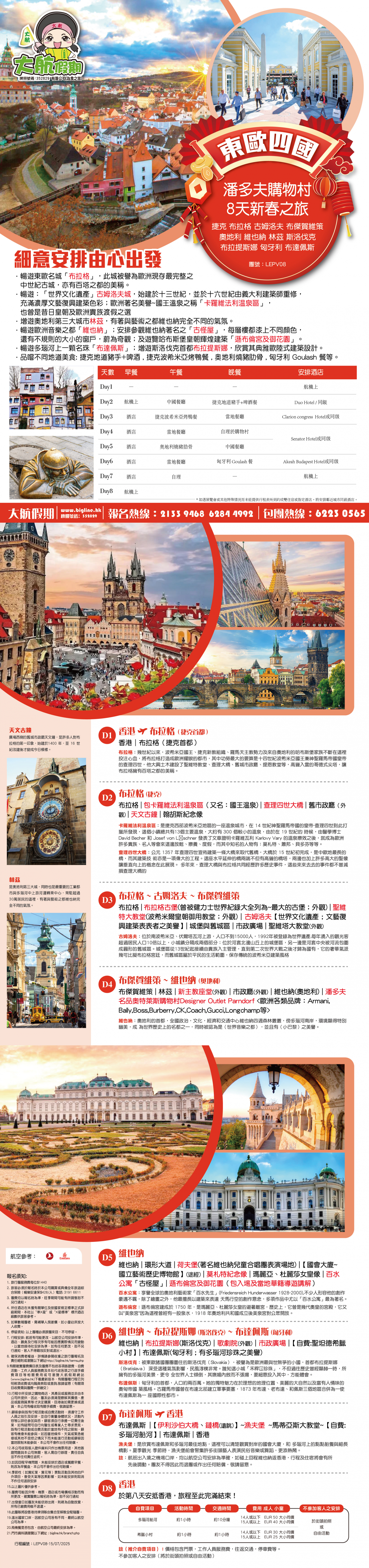 *團員繳付退票費後 (如適用): 1) 已繳款項可保留半年; 或 2) 選擇轉團後, 餘款則保留半年; 或 3) 可繳付『迫不得已理由』之手續費後, 取回已付餘款。 *個別機票+酒店套票產品如因『迫不得已理由』取消外遊行程, 處理旅客退款時亦按以上訂列收取每位退票費及手續費, 並以行程表 (套票單張) 所列為準。 責任細則: 1. 本公司保留合併團隊出發的權利。 2. 行程書或單張內所列費用根據當時機票價格及國際貨幣兌換率而訂立。外幣浮動等情況之下, 本公司保留在出發前調整各項費用的權利及徵收額外費用。 3. 所有列出的交通服務資料只供參考, 如有更改概不負責, 一切須以出票時為準。 4. 除本公司直接提供之服務外, 本公司及其職員或附屬公司或與本公司有經營關係之公司代理人身份在香港或外地安排其他獨立機構所提供之交通工具 (如飛機、輪船、火車、或遊覽巴士等) 、住宿、膳食或娛樂觀光項目等 (“委託機構”), 團員如遇交通延誤、行李遺失、意外傷亡或財物損失等, 該依照當地法律向擁有、管理或操作之委託機構直接交涉或追討賠償, 通常該等機構均各訂位不同條例, 以對客人負責。在此情況下, 本公司概不對該等損失或傷亡負責。 5. 除因由本公司之員工或其他直接管理或操作之機構之疏忽而引致團員之個人傷亡外, 本公司對團員在任何意外中之個人傷亡、經濟、娛樂或精神損失概不負責。 6. 除經本公司同意及安排, 如團員自行更改由其他人士代為參團, 本公司或其委託機構之職員有權取消其隨團之資格, 而無須發還任何團費, 而該人士在隨團期間之保險、責任賠償、行為後果等均由該人仕自行承擔。 7. 如因天氣、罷工、戰爭、怠工或安全情況影響而引致有關交通工具暫停服務, 停航或其他事故, 而必須將行程更改或取消部份行程, 本公司則將團員所繳交之費用扣除因以上事故而引致之損失後, 退回差額給團員。 8. 有關住宿、膳食、遊覽節目等問題, 均依據行程表安排, 行程先後次序有可能需要更改, 一切以當地安排為準。若遇特殊情況, 如簽證受阻, 當地酒店突告客滿或航機改變飛行時間或地點, 以及非本公司或其委託機構所能控制之因素, 令旅行團節目有增減, 或臨時更改交通工具、班機時間、機種及更換酒店等等, 本公司或其委託機構得依當時情況全權盡力處理, 團員不得藉故反對或退出, 因故取消之節目, 將不獲退還款項, 任何因延期而引致之額外支出, 本公司或其委託機構概不負責。 9. 所有酒店及住宿根據行程安排, 本公司視乎當時情形作出更改, 但不限於遇展覽會或特殊情況下, 將住宿鄰近城市之同等級酒店及住宿代替。本公司如因『迫不得已理由(外遊)』(即指戰爭、政治動盪、恐怖襲擊、天災、疫症、惡劣天氣、交通工具發生技術問題、載運機構臨時更改班次或取消服務、罷工、工業行動、旅遊目的地政府或世界衛生組織發出旅遊警示(警告)、香港特別行政區政府發出紅色或黑色外遊警示、不可抗力事件,以及業界不能控制的其他不利離開香港或在香港境外旅遊的情況)於外遊旅行團出發後更改任何項目而引致成本增加,可向顧客徵收額外費用。 10. 【已成團】代表該團號之指定出發日期預訂機位或已有足夠人數報名參加。但出發與否還受其他因素影響, 本公司保留最終決定權。 11. 任何團員在參與各項活動時, 如經常不遵守服飾人員之指引或安排, 在行動或言語上侮辱或滋擾其他團員或工作人員, 本公司或其委託機構職員有權視具體情況而取消其隨團資格而母須發任何團費, 而受該旅客監護之18歲以下同行團員亦須一併離開, 有關旅客離團後一切活動, 概與本公司或其委託機構無關。 12. 團員如欲於旅程完畢後延期返港, 須於出發前十四天提出, 以便本公司代為預定返港機位, 延期返港之機位, 未能即時作實, 團員不得藉此理由要求退出, 旅程完畢後延期逗留之費用, 概由團員自負。 13. 延期返港之團友, 必須在離境前七十二小時向航空公司確實回程機位, 任何機位如有變更, 概與本公司無關。 14. 團員如在旅途中自行離團或放棄行程, 離團後之責任自負, 一切後果與本公司或其委託機構無關。 15. 參團者須切實遵守各國及各地法例, 包括但不限於防疫防控條例, 並嚴禁攜帶違例物品出入境, 並照實申報攜帶之物品及現金。 16. 任何種類的簽證審批權及出入境批准權一律由該國或地區之領事館及/或出入境部門全權決定, 出入境如有問題, 責任旅客自負, 本公司或其委託機構母須負任何責任。如簽證已代辦, 簽證費恕不退還。 17. 即使團員持有效之入境簽證及旅遊證件, 而於入境時被當值之移民局海關人員拒絕入境, 本公司或其委託機構亦無須負任何責任。所需額外安排之食宿、交通費用、全部由其本人負責, 其餘下的行程亦將不會獲得任何補償, 亦不得要求退款或改團。 18. 中國內地相關法規規定, 即日起旅客入住中國內地境內酒店時, 公安機關會透過酒店前台向旅客一併採集人像信息資訊。 19. 如出現一些非本公司能力範圍可控制之問題 (如花卉、紅葉提早凋謝或景觀、自然現象、景點活動或戶外項目) 會受天氣等因素影響, 如未能安排則取消不作任何退款安排。 20. 旅客如在旅程中確診 COVID-19或其他傳染病,無論受到當地政府隔離或其他檢疫要求影響與否,為確保其他旅客之安全,確診旅