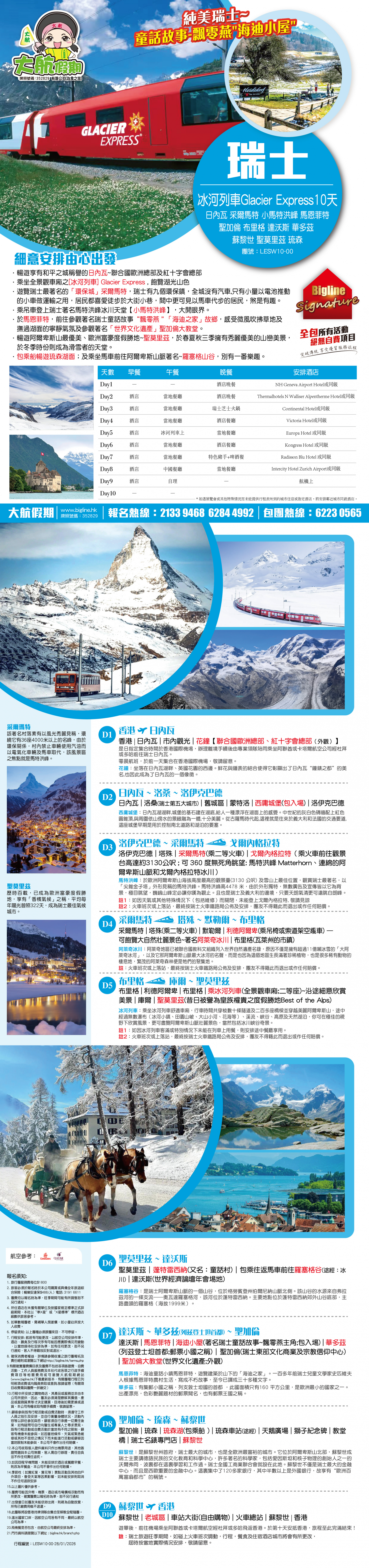 *團員繳付退票費後 (如適用): 1) 已繳款項可保留半年; 或 2) 選擇轉團後, 餘款則保留半年; 或 3) 可繳付『迫不得已理由』之手續費後, 取回已付餘款。 *個別機票+酒店套票產品如因『迫不得已理由』取消外遊行程, 處理旅客退款時亦按以上訂列收取每位退票費及手續費, 並以行程表 (套票單張) 所列為準。 責任細則: 1. 本公司保留合併團隊出發的權利。 2. 行程書或單張內所列費用根據當時機票價格及國際貨幣兌換率而訂立。外幣浮動等情況之下, 本公司保留在出發前調整各項費用的權利及徵收額外費用。 3. 所有列出的交通服務資料只供參考, 如有更改概不負責, 一切須以出票時為準。 4. 除本公司直接提供之服務外, 本公司及其職員或附屬公司或與本公司有經營關係之公司代理人身份在香港或外地安排其他獨立機構所提供之交通工具 (如飛機、輪船、火車、或遊覽巴士等) 、住宿、膳食或娛樂觀光項目等 (“委託機構”), 團員如遇交通延誤、行李遺失、意外傷亡或財物損失等, 該依照當地法律向擁有、管理或操作之委託機構直接交涉或追討賠償, 通常該等機構均各訂位不同條例, 以對客人負責。在此情況下, 本公司概不對該等損失或傷亡負責。 5. 除因由本公司之員工或其他直接管理或操作之機構之疏忽而引致團員之個人傷亡外, 本公司對團員在任何意外中之個人傷亡、經濟、娛樂或精神損失概不負責。 6. 除經本公司同意及安排, 如團員自行更改由其他人士代為參團, 本公司或其委託機構之職員有權取消其隨團之資格, 而無須發還任何團費, 而該人士在隨團期間之保險、責任賠償、行為後果等均由該人仕自行承擔。 7. 如因天氣、罷工、戰爭、怠工或安全情況影響而引致有關交通工具暫停服務, 停航或其他事故, 而必須將行程更改或取消部份行程, 本公司則將團員所繳交之費用扣除因以上事故而引致之損失後, 退回差額給團員。 8. 有關住宿、膳食、遊覽節目等問題, 均依據行程表安排, 行程先後次序有可能需要更改, 一切以當地安排為準。若遇特殊情況, 如簽證受阻, 當地酒店突告客滿或航機改變飛行時間或地點, 以及非本公司或其委託機構所能控制之因素, 令旅行團節目有增減, 或臨時更改交通工具、班機時間、機種及更換酒店等等, 本公司或其委託機構得依當時情況全權盡力處理, 團員不得藉故反對或退出, 因故取消之節目, 將不獲退還款項, 任何因延期而引致之額外支出, 本公司或其委託機構概不負責。 9. 所有酒店及住宿根據行程安排, 本公司視乎當時情形作出更改, 但不限於遇展覽會或特殊情況下, 將住宿鄰近城市之同等級酒店及住宿代替。本公司如因『迫不得已理由(外遊)』(即指戰爭、政治動盪、恐怖襲擊、天災、疫症、惡劣天氣、交通工具發生技術問題、載運機構臨時更改班次或取消服務、罷工、工業行動、旅遊目的地政府或世界衛生組織發出旅遊警示(警告)、香港特別行政區政府發出紅色或黑色外遊警示、不可抗力事件,以及業界不能控制的其他不利離開香港或在香港境外旅遊的情況)於外遊旅行團出發後更改任何項目而引致成本增加,可向顧客徵收額外費用。 10. 【已成團】代表該團號之指定出發日期預訂機位或已有足夠人數報名參加。但出發與否還受其他因素影響, 本公司保留最終決定權。 11. 任何團員在參與各項活動時, 如經常不遵守服飾人員之指引或安排, 在行動或言語上侮辱或滋擾其他團員或工作人員, 本公司或其委託機構職員有權視具體情況而取消其隨團資格而母須發任何團費, 而受該旅客監護之18歲以下同行團員亦須一併離開, 有關旅客離團後一切活動, 概與本公司或其委託機構無關。 12. 團員如欲於旅程完畢後延期返港, 須於出發前十四天提出, 以便本公司代為預定返港機位, 延期返港之機位, 未能即時作實, 團員不得藉此理由要求退出, 旅程完畢後延期逗留之費用, 概由團員自負。 13. 延期返港之團友, 必須在離境前七十二小時向航空公司確實回程機位, 任何機位如有變更, 概與本公司無關。 14. 團員如在旅途中自行離團或放棄行程, 離團後之責任自負, 一切後果與本公司或其委託機構無關。 15. 參團者須切實遵守各國及各地法例, 包括但不限於防疫防控條例, 並嚴禁攜帶違例物品出入境, 並照實申報攜帶之物品及現金。 16. 任何種類的簽證審批權及出入境批准權一律由該國或地區之領事館及/或出入境部門全權決定, 出入境如有問題, 責任旅客自負, 本公司或其委託機構母須負任何責任。如簽證已代辦, 簽證費恕不退還。 17. 即使團員持有效之入境簽證及旅遊證件, 而於入境時被當值之移民局海關人員拒絕入境, 本公司或其委託機構亦無須負任何責任。所需額外安排之食宿、交通費用、全部由其本人負責, 其餘下的行程亦將不會獲得任何補償, 亦不得要求退款或改團。 18. 中國內地相關法規規定, 即日起旅客入住中國內地境內酒店時, 公安機關會透過酒店前台向旅客一併採集人像信息資訊。 19. 如出現一些非本公司能力範圍可控制之問題 (如花卉、紅葉提早凋謝或景觀、自然現象、景點活動或戶外項目) 會受天氣等因素影響, 如未能安排則取消不作任何退款安排。 20. 旅客如在旅程中確診 COVID-19或其他傳染病,無論受到當地政府隔離或其他檢疫要求影響與否,為確保其他旅客之安全,確診旅