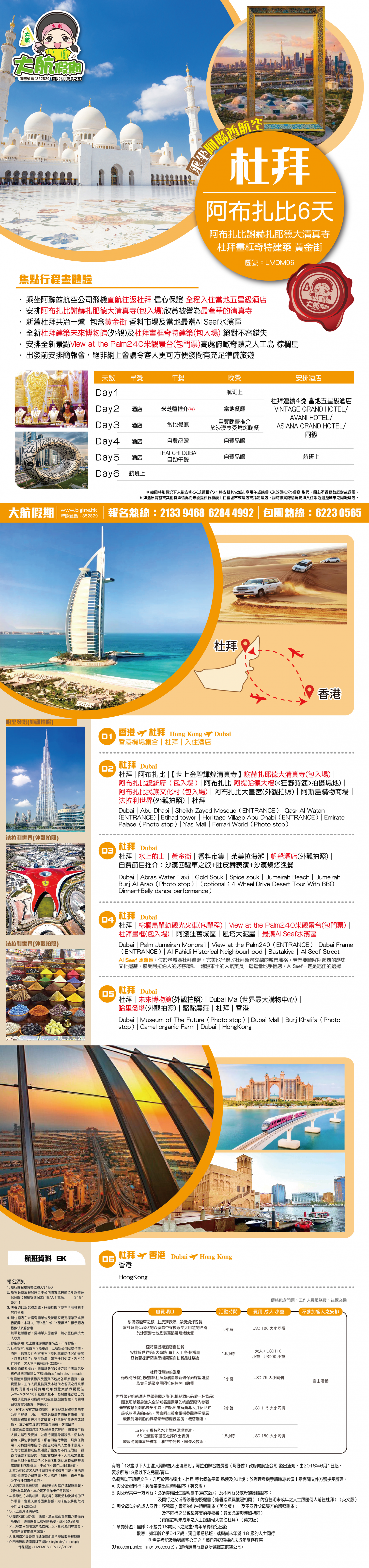 *團員繳付退票費後 (如適用): 1) 已繳款項可保留半年; 或 2) 選擇轉團後, 餘款則保留半年; 或 3) 可繳付『迫不得已理由』之手續費後, 取回已付餘款。 *個別機票+酒店套票產品如因『迫不得已理由』取消外遊行程, 處理旅客退款時亦按以上訂列收取每位退票費及手續費, 並以行程表 (套票單張) 所列為準。 責任細則: 1. 本公司保留合併團隊出發的權利。 2. 行程書或單張內所列費用根據當時機票價格及國際貨幣兌換率而訂立。外幣浮動等情況之下, 本公司保留在出發前調整各項費用的權利及徵收額外費用。 3. 所有列出的交通服務資料只供參考, 如有更改概不負責, 一切須以出票時為準。 4. 除本公司直接提供之服務外, 本公司及其職員或附屬公司或與本公司有經營關係之公司代理人身份在香港或外地安排其他獨立機構所提供之交通工具 (如飛機、輪船、火車、或遊覽巴士等) 、住宿、膳食或娛樂觀光項目等 (“委託機構”), 團員如遇交通延誤、行李遺失、意外傷亡或財物損失等, 該依照當地法律向擁有、管理或操作之委託機構直接交涉或追討賠償, 通常該等機構均各訂位不同條例, 以對客人負責。在此情況下, 本公司概不對該等損失或傷亡負責。 5. 除因由本公司之員工或其他直接管理或操作之機構之疏忽而引致團員之個人傷亡外, 本公司對團員在任何意外中之個人傷亡、經濟、娛樂或精神損失概不負責。 6. 除經本公司同意及安排, 如團員自行更改由其他人士代為參團, 本公司或其委託機構之職員有權取消其隨團之資格, 而無須發還任何團費, 而該人士在隨團期間之保險、責任賠償、行為後果等均由該人仕自行承擔。 7. 如因天氣、罷工、戰爭、怠工或安全情況影響而引致有關交通工具暫停服務, 停航或其他事故, 而必須將行程更改或取消部份行程, 本公司則將團員所繳交之費用扣除因以上事故而引致之損失後, 退回差額給團員。 8. 有關住宿、膳食、遊覽節目等問題, 均依據行程表安排, 行程先後次序有可能需要更改, 一切以當地安排為準。若遇特殊情況, 如簽證受阻, 當地酒店突告客滿或航機改變飛行時間或地點, 以及非本公司或其委託機構所能控制之因素, 令旅行團節目有增減, 或臨時更改交通工具、班機時間、機種及更換酒店等等, 本公司或其委託機構得依當時情況全權盡力處理, 團員不得藉故反對或退出, 因故取消之節目, 將不獲退還款項, 任何因延期而引致之額外支出, 本公司或其委託機構概不負責。 9. 所有酒店及住宿根據行程安排, 本公司視乎當時情形作出更改, 但不限於遇展覽會或特殊情況下, 將住宿鄰近城市之同等級酒店及住宿代替。本公司如因『迫不得已理由(外遊)』(即指戰爭、政治動盪、恐怖襲擊、天災、疫症、惡劣天氣、交通工具發生技術問題、載運機構臨時更改班次或取消服務、罷工、工業行動、旅遊目的地政府或世界衛生組織發出旅遊警示(警告)、香港特別行政區政府發出紅色或黑色外遊警示、不可抗力事件,以及業界不能控制的其他不利離開香港或在香港境外旅遊的情況)於外遊旅行團出發後更改任何項目而引致成本增加,可向顧客徵收額外費用。 10. 【已成團】代表該團號之指定出發日期預訂機位或已有足夠人數報名參加。但出發與否還受其他因素影響, 本公司保留最終決定權。 11. 任何團員在參與各項活動時, 如經常不遵守服飾人員之指引或安排, 在行動或言語上侮辱或滋擾其他團員或工作人員, 本公司或其委託機構職員有權視具體情況而取消其隨團資格而母須發任何團費, 而受該旅客監護之18歲以下同行團員亦須一併離開, 有關旅客離團後一切活動, 概與本公司或其委託機構無關。 12. 團員如欲於旅程完畢後延期返港, 須於出發前十四天提出, 以便本公司代為預定返港機位, 延期返港之機位, 未能即時作實, 團員不得藉此理由要求退出, 旅程完畢後延期逗留之費用, 概由團員自負。 13. 延期返港之團友, 必須在離境前七十二小時向航空公司確實回程機位, 任何機位如有變更, 概與本公司無關。 14. 團員如在旅途中自行離團或放棄行程, 離團後之責任自負, 一切後果與本公司或其委託機構無關。 15. 參團者須切實遵守各國及各地法例, 包括但不限於防疫防控條例, 並嚴禁攜帶違例物品出入境, 並照實申報攜帶之物品及現金。 16. 任何種類的簽證審批權及出入境批准權一律由該國或地區之領事館及/或出入境部門全權決定, 出入境如有問題, 責任旅客自負, 本公司或其委託機構母須負任何責任。如簽證已代辦, 簽證費恕不退還。 17. 即使團員持有效之入境簽證及旅遊證件, 而於入境時被當值之移民局海關人員拒絕入境, 本公司或其委託機構亦無須負任何責任。所需額外安排之食宿、交通費用、全部由其本人負責, 其餘下的行程亦將不會獲得任何補償, 亦不得要求退款或改團。 18. 中國內地相關法規規定, 即日起旅客入住中國內地境內酒店時, 公安機關會透過酒店前台向旅客一併採集人像信息資訊。 19. 如出現一些非本公司能力範圍可控制之問題 (如花卉、紅葉提早凋謝或景觀、自然現象、景點活動或戶外項目) 會受天氣等因素影響, 如未能安排則取消不作任何退款安排。 20. 旅客如在旅程中確診 COVID-19或其他傳染病,無論受到當地政府隔離或其他檢疫要求影響與否,為確保其他旅客之安全,確診旅