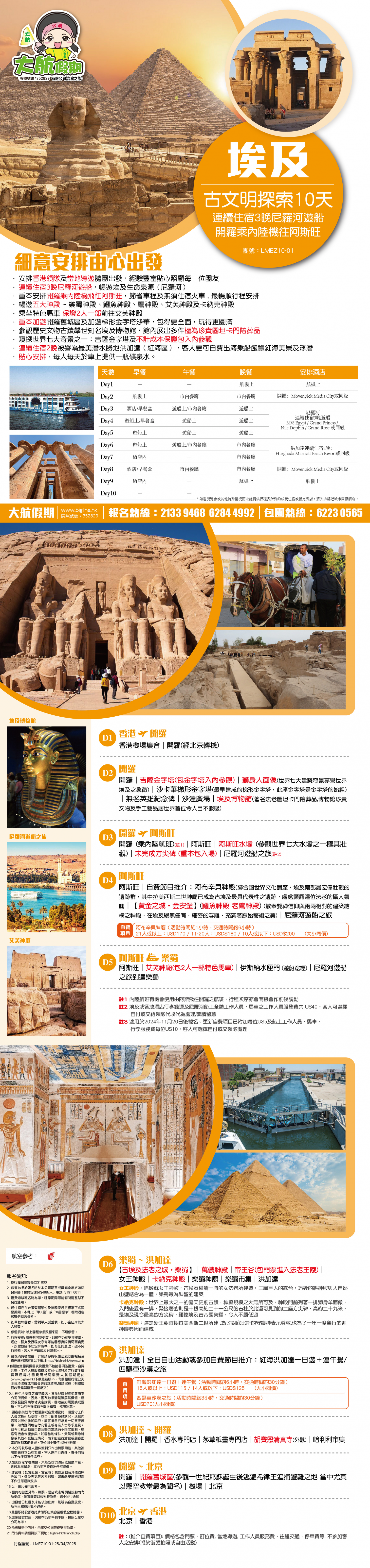 6. 團費及其他相關費用包括但不限於:稅項、機場保安費、旅行團服務費、郵輪服務費、旅遊保險的保費、有關簽證及其相關費用(包括但不限於簽證費及代辦簽證的服務費/手續費)須在出發前21天繳清, 長線則為30天前 (旺季期間須在出發前30天繳付, 長線則為 45天前), 個別線路亦將因應不同供應商之經營條件而作出調整,以該團的單張資料為準; 逾期未清繳費用者, 本公司得將訂位作廢, 所繳訂金例不發還, 亦不得將訂金轉予他人或轉用於其他日子出發及其他旅行團。 7. 付款方式以各訂購渠道之系統可接受為準。 8. 所有一切代收之款項,包括但不限於燃油附加費、香港及各地機場稅和機場建設稅等, 本公司只接受以現金或易辦事繳付所有代收費用。 - 信用卡/分期付款計劃或銀聯卡付款, 以銀行確認成功過賬, 方可作實。 - 請保留收據, 以作退款之憑據, 如以信用卡免息分期或銀聯卡付款, 則退款必須經由銀行辦理手續, 退回該信用卡/銀行戶口, 需時最少約三十五個工作天, 退款時間及一切有關條款均由信用卡公司決定。 9. 鑑於外幣浮動、因燃油附加費的浮動以致機票成本增加、或因事前未能預見的情況(包括但不限於交通票、酒店、保險等方面)導致成本上升, 本公司保留權利在顧客繳付全部團費及其他相關費用前向有關顧客徵收額外費用。價格如有更改, 將會另行通知。燃油附加費價格以航空公司最後公佈為準。一切費用必須於出發前全數繳付。受影響的顧客在無損其法律權利和責任的原則下,可選擇支付該額外費用以繼續參加該旅行團,或於該旅行團出發前選擇退出。如屬後者,本公司將於發出徵收額外費用通知後的七個工作日內(發出通知當日不計)或於顧客選擇退出該旅行團後的七個工作日內(顧客退出當日不計)(以較後發生者為準)退還或(如顧客以信用卡繳付款項)安排退還顧客所付的款項。 10. 減免折扣優惠, 必須於報名時申請及提供證明予本公司, 概不補發。 11. 當地參團之團費不設任何優惠。團員亦須自備國際機票、所有內陸機票及個別路線之部份交通安排。 12. 本公司收費上的年齡定義 : 0至23 個月為嬰兒; 2至11歲為小童 (根據不同線路釐定小童的年齡定義) ; 12歲或以上為成人。 13. 對未滿 18歲的顧客須符合下列報名要求: - 15 歲以下, 必須與父母及監護人同行 - 滿 15歲而未滿 18歲; 如非與父母或監護人同行, 則必須由父母及監護人同意並於報名表簽署作實及具備一份合適的旅遊綜合保險。 14. 各項交通服務供應商對乘載最高懷孕週數之孕婦或最低參加年齡之嬰兒各有所不同, 詳情請向本公司職員查詢。 15. 交通服務供應商可視乎顧客健康狀況, 要求醫療證明及或有效期內的新冠病毒陰性證明以示適合乘搭該交通, 並保留拒絕顧客登乘之權利。 16. 本公司保留接受報名與否之最終權利。 17. 所有團隊不包旅遊保險,本公司要求客人報名時須同時購買個人旅遊保險(廣東省旅行團除外),如客人自備個人全年旅遊保險則可豁免。廣東省旅行團如客人選擇不購買旅遊保險,閣下之人生及財物安全必須自理,責任概與旅行社無關。如客人非透過本公司購買個人旅遊保險而又要求本公司發出有關保險證明,則須收取港幣$100/人作為手續費。 費用包括: 1. 機票:來回經濟客位機票。(飛機線適用) 2. 酒店:根據行程表內所列之酒店或同級,以兩人共用一房為標準。單人房附加費則以一人佔一房為準。 3. 膳食:行程表內所列之團餐,交通服務供應商所提供之膳食則以其最終安排為準。 4. 鐵路 : 行程表所列之鐵路車票。 5. 交通:採用空氣調節遊覽車,開關冷暖氣需根據當地條例執行。 6. 觀光:各項遊覽節目均按照行程表內所列之遊覽節目及入場費用為根據。 7. 導遊 : 專業領隊/導遊隨團出發, 沿途安排及介紹。本公司於特殊情況下, 保留派領隊隨團出發之最終決定權, 團員不得籍故反對或退出。 8. 行李 : 每位限攜帶手提行李一件, 規格以交通服務供應商為準。寄艙行李數量及重量需視乎交通服務供應商而定, 如行李額外超重, 費用需由客人承擔。 9. 嬰兒收費只包括交通服務供應商出票費,不包括機位或座位、酒店、膳食及其他佔用座位之交通等安排。為免生疑問,本公司將不會為嬰兒額外提供團餐、酒店床位及任何交通公具(包括但不限於旅遊巴)的座位。如旅客要求提供嬰兒床,本公司將協助旅客向酒店要求安排,但酒店方面保留最終決定權。 費用不包括: 1. 旅遊證件及各國入境簽證費用。 2. 給予導遊/領隊/司機/工作人員之旅行團服務費。 3. 各地機場稅、額外附加費及指定稅項。 4. 行李超重費用。 5. 旅遊業監管印花成本。 6. 酒店、機場及各類交通工具之行李生服務費。 7. 自費項目或行程表以外之觀光節目。 8. 因交通阻延、罷工、颱風或其他突發情況而非本公司所能控制而引致之額外費用。 9. 綜合旅遊保險。為使各旅客獲得完善的旅遊保障,本公司建議必須自行購買綜合旅遊保險。 臨時取消及退款細則: 1. 本公司有權在旅行團出發前取消旅行團 (如參加人數不足 15人) 。在此等情況下, 本公司將按照下列規定處理:(取消3天或以下的旅行團)最少於出發前一日通知顧客;(取消4至9天的旅行團)最少於出發前七日通知顧客;(取消10天或以上的旅行團)最少於出發前14日通知顧客(通知顧客及出發當日均不計),以上不包括旺季及大假期的取