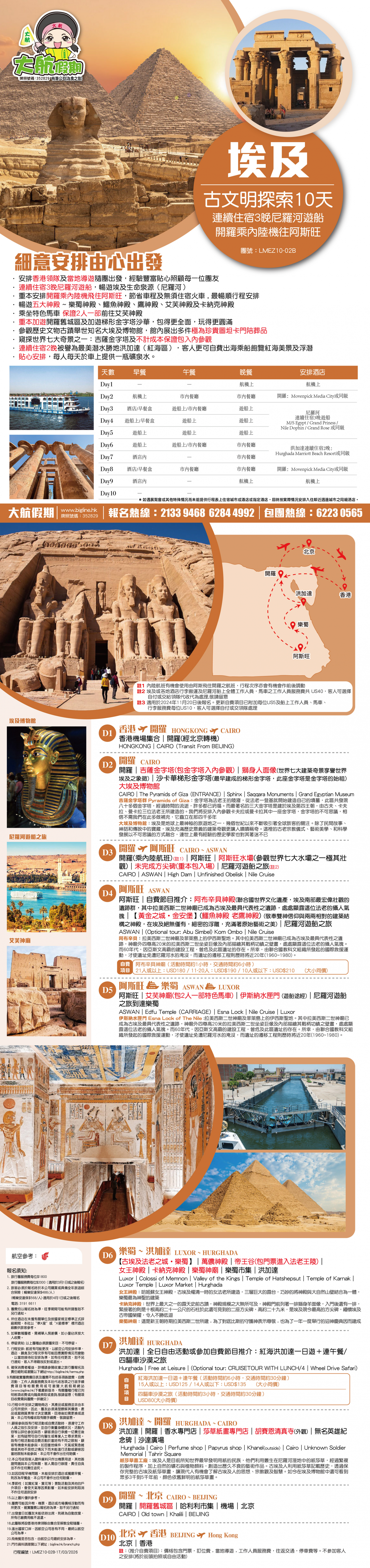 6. 團費及其他相關費用包括但不限於:稅項、機場保安費、旅行團服務費、郵輪服務費、旅遊保險的保費、有關簽證及其相關費用(包括但不限於簽證費及代辦簽證的服務費/手續費)須在出發前21天繳清, 長線則為30天前 (旺季期間須在出發前30天繳付, 長線則為 45天前), 個別線路亦將因應不同供應商之經營條件而作出調整,以該團的單張資料為準; 逾期未清繳費用者, 本公司得將訂位作廢, 所繳訂金例不發還, 亦不得將訂金轉予他人或轉用於其他日子出發及其他旅行團。 7. 付款方式以各訂購渠道之系統可接受為準。 8. 所有一切代收之款項,包括但不限於燃油附加費、香港及各地機場稅和機場建設稅等, 本公司只接受以現金或易辦事繳付所有代收費用。 - 信用卡/分期付款計劃或銀聯卡付款, 以銀行確認成功過賬, 方可作實。 - 請保留收據, 以作退款之憑據, 如以信用卡免息分期或銀聯卡付款, 則退款必須經由銀行辦理手續, 退回該信用卡/銀行戶口, 需時最少約三十五個工作天, 退款時間及一切有關條款均由信用卡公司決定。 9. 鑑於外幣浮動、因燃油附加費的浮動以致機票成本增加、或因事前未能預見的情況(包括但不限於交通票、酒店、保險等方面)導致成本上升, 本公司保留權利在顧客繳付全部團費及其他相關費用前向有關顧客徵收額外費用。價格如有更改, 將會另行通知。燃油附加費價格以航空公司最後公佈為準。一切費用必須於出發前全數繳付。 10. 減免折扣優惠, 必須於報名時申請及提供證明予本公司, 概不補發。 11. 當地參團之團費不設任何優惠。團員亦須自備國際機票、所有內陸機票及個別路線之部份交通安排。 12. 本公司收費上的年齡定義 : 0至23 個月為嬰兒; 2至11歲為小童 (根據不同線路釐定小童的年齡定義) ; 12歲或以上為成人。 13. 對未滿 18歲的顧客須符合下列報名要求: - 15 歲以下, 必須與父母及監護人同行 - 滿 15歲而未滿 18歲; 如非與父母或監護人同行, 則必須由父母及監護人同意並於報名表簽署作實及具備一份合適的旅遊綜合保險。 14. 各項交通服務供應商對乘載最高懷孕週數之孕婦或最低參加年齡之嬰兒各有所不同, 詳情請向本公司職員查詢。 15. 交通服務供應商可視乎顧客健康狀況, 要求醫療證明及或有效期內的新冠病毒陰性證明以示適合乘搭該交通, 並保留拒絕顧客登乘之權利。 16. 本公司保留接受報名與否之最終權利。 17. 所有團隊不包旅遊保險,本公司要求客人報名時須同時購買個人旅遊保險(廣東省旅行團除外),如客人自備個人全年旅遊保險則可豁免。廣東省旅行團如客人選擇不購買旅遊保險,閣下之人生及財物安全必須自理,責任概與旅行社無關。如客人非透過本公司購買個人旅遊保險而又要求本公司發出有關保險證明,則須收取港幣$100/人作為手續費。 費用包括: 1. 機票:來回經濟客位機票。(飛機線適用) 2. 酒店:根據行程表內所列之酒店或同級,以兩人共用一房為標準。單人房附加費則以一人佔一房為準。 3. 膳食:行程表內所列之團餐,交通服務供應商所提供之膳食則以其最終安排為準。 4. 鐵路 : 行程表所列之鐵路車票。 5. 交通:採用空氣調節遊覽車,開關冷暖氣需根據當地條例執行。 6. 觀光:各項遊覽節目均按照行程表內所列之遊覽節目及入場費用為根據。 7. 導遊 : 專業領隊/導遊隨團出發, 沿途安排及介紹。本公司於特殊情況下, 保留派領隊隨團出發之最終決定權, 團員不得籍故反對或退出。 8. 行李 : 每位限攜帶手提行李一件, 規格以交通服務供應商為準。寄艙行李數量及重量需視乎交通服務供應商而定, 如行李額外超重, 費用需由客人承擔。 9. 嬰兒收費只包括交通服務供應商出票費,不包括機位或座位、酒店、膳食及其他佔用座位之交通等安排。為免生疑問,本公司將不會為嬰兒額外提供團餐、酒店床位及任何交通公具(包括但不限於旅遊巴)的座位。如旅客要求提供嬰兒床,本公司將協助旅客向酒店要求安排,但酒店方面保留最終決定權。 費用不包括: 1. 旅遊證件及各國入境簽證費用。 2. 給予導遊/領隊/司機/工作人員之旅行團服務費。 3. 各地機場稅、額外附加費及指定稅項。 4. 行李超重費用。 5. 旅遊業監管印花成本。 6. 酒店、機場及各類交通工具之行李生服務費。 7. 自費項目或行程表以外之觀光節目。 8. 因交通阻延、罷工、颱風或其他突發情況而非本公司所能控制而引致之額外費用。 9. 綜合旅遊保險。為使各旅客獲得完善的旅遊保障,本公司建議必須自行購買綜合旅遊保險。 臨時取消及退款細則: 1. 本公司有權在旅行團出發前取消旅行團 (如參加人數不足 15人) 。在此等情況下, 本公司將按照下列規定處理:(取消3天或以下的旅行團)最少於出發前一日通知顧客;(取消4至9天的旅行團)最少於出發前七日通知顧客;(取消10天或以上的旅行團)最少於出發前14日通知顧客(通知顧客及出發當日均不計),以上不包括旺季及大假期的取消旅遊團安排,並於發出取消通知後的七個工作日內(發出通知當日不計)全數退還或安排退還團員所繳交之費用 (已獲領事館簽發之獨立簽證費用除外) 。如本公司沒有在按本段所述的期限內就取消旅行團通知顧客,本公司將於發出取消通知後的七個工作日內(發出通知當日不計),退還顧客所繳付的款項,及賠償團費的15%(以港幣1,000 元為上限)。為免生疑問,除