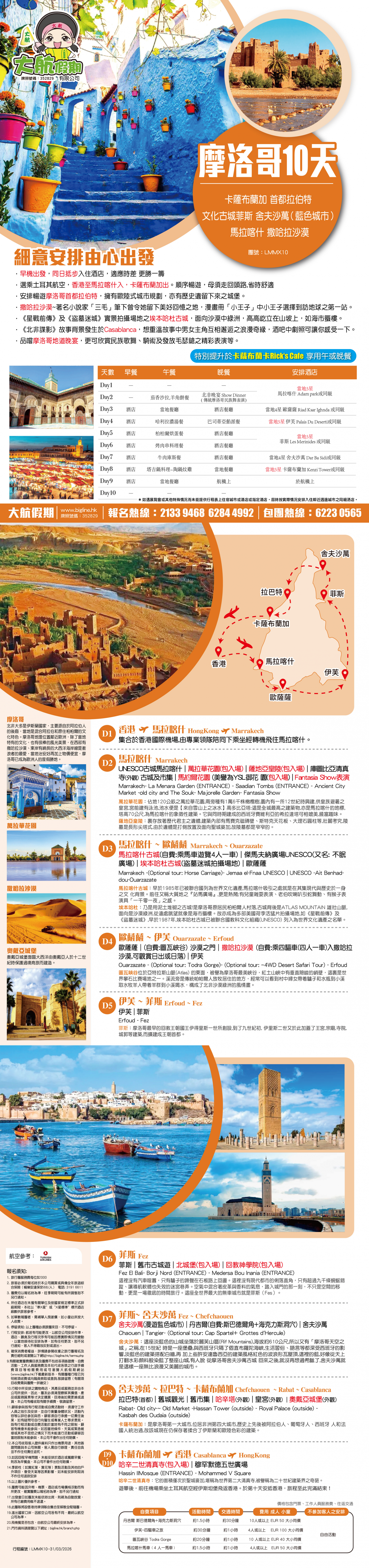 6. 團費及其他相關費用包括但不限於:稅項、機場保安費、旅行團服務費、郵輪服務費、旅遊保險的保費、有關簽證及其相關費用(包括但不限於簽證費及代辦簽證的服務費/手續費)須在出發前21天繳清, 長線則為30天前 (旺季期間須在出發前30天繳付, 長線則為 45天前), 個別線路亦將因應不同供應商之經營條件而作出調整,以該團的單張資料為準; 逾期未清繳費用者, 本公司得將訂位作廢, 所繳訂金例不發還, 亦不得將訂金轉予他人或轉用於其他日子出發及其他旅行團。 7. 付款方式以各訂購渠道之系統可接受為準。 8. 所有一切代收之款項,包括但不限於燃油附加費、香港及各地機場稅和機場建設稅等, 本公司只接受以現金或易辦事繳付所有代收費用。 - 信用卡/分期付款計劃或銀聯卡付款, 以銀行確認成功過賬, 方可作實。 - 請保留收據, 以作退款之憑據, 如以信用卡免息分期或銀聯卡付款, 則退款必須經由銀行辦理手續, 退回該信用卡/銀行戶口, 需時最少約三十五個工作天, 退款時間及一切有關條款均由信用卡公司決定。 9. 鑑於外幣浮動、因燃油附加費的浮動以致機票成本增加、或因事前未能預見的情況(包括但不限於交通票、酒店、保險等方面)導致成本上升, 本公司保留權利在顧客繳付全部團費及其他相關費用前向有關顧客徵收額外費用。價格如有更改, 將會另行通知。燃油附加費價格以航空公司最後公佈為準。一切費用必須於出發前全數繳付。 10. 減免折扣優惠, 必須於報名時申請及提供證明予本公司, 概不補發。 11. 當地參團之團費不設任何優惠。團員亦須自備國際機票、所有內陸機票及個別路線之部份交通安排。 12. 本公司收費上的年齡定義 : 0至23 個月為嬰兒; 2至11歲為小童 (根據不同線路釐定小童的年齡定義) ; 12歲或以上為成人。 13. 對未滿 18歲的顧客須符合下列報名要求: - 15 歲以下, 必須與父母及監護人同行 - 滿 15歲而未滿 18歲; 如非與父母或監護人同行, 則必須由父母及監護人同意並於報名表簽署作實及具備一份合適的旅遊綜合保險。 14. 各項交通服務供應商對乘載最高懷孕週數之孕婦或最低參加年齡之嬰兒各有所不同, 詳情請向本公司職員查詢。 15. 交通服務供應商可視乎顧客健康狀況, 要求醫療證明及或有效期內的新冠病毒陰性證明以示適合乘搭該交通, 並保留拒絕顧客登乘之權利。 16. 本公司保留接受報名與否之最終權利。 17. 所有團隊不包旅遊保險,本公司要求客人報名時須同時購買個人旅遊保險(廣東省旅行團除外),如客人自備個人全年旅遊保險則可豁免。廣東省旅行團如客人選擇不購買旅遊保險,閣下之人生及財物安全必須自理,責任概與旅行社無關。如客人非透過本公司購買個人旅遊保險而又要求本公司發出有關保險證明,則須收取港幣$100/人作為手續費。 費用包括: 1. 機票:來回經濟客位機票。(飛機線適用) 2. 酒店:根據行程表內所列之酒店或同級,以兩人共用一房為標準。單人房附加費則以一人佔一房為準。 3. 膳食:行程表內所列之團餐,交通服務供應商所提供之膳食則以其最終安排為準。 4. 鐵路 : 行程表所列之鐵路車票。 5. 交通:採用空氣調節遊覽車,開關冷暖氣需根據當地條例執行。 6. 觀光:各項遊覽節目均按照行程表內所列之遊覽節目及入場費用為根據。 7. 導遊 : 專業領隊/導遊隨團出發, 沿途安排及介紹。本公司於特殊情況下, 保留派領隊隨團出發之最終決定權, 團員不得籍故反對或退出。 8. 行李 : 每位限攜帶手提行李一件, 規格以交通服務供應商為準。寄艙行李數量及重量需視乎交通服務供應商而定, 如行李額外超重, 費用需由客人承擔。 9. 嬰兒收費只包括交通服務供應商出票費,不包括機位或座位、酒店、膳食及其他佔用座位之交通等安排。為免生疑問,本公司將不會為嬰兒額外提供團餐、酒店床位及任何交通公具(包括但不限於旅遊巴)的座位。如旅客要求提供嬰兒床,本公司將協助旅客向酒店要求安排,但酒店方面保留最終決定權。 費用不包括: 1. 旅遊證件及各國入境簽證費用。 2. 給予導遊/領隊/司機/工作人員之旅行團服務費。 3. 各地機場稅、額外附加費及指定稅項。 4. 行李超重費用。 5. 旅遊業監管印花成本。 6. 酒店、機場及各類交通工具之行李生服務費。 7. 自費項目或行程表以外之觀光節目。 8. 因交通阻延、罷工、颱風或其他突發情況而非本公司所能控制而引致之額外費用。 9. 綜合旅遊保險。為使各旅客獲得完善的旅遊保障,本公司建議必須自行購買綜合旅遊保險。 臨時取消及退款細則: 1. 本公司有權在旅行團出發前取消旅行團 (如參加人數不足 15人) 。在此等情況下, 本公司將按照下列規定處理:(取消3天或以下的旅行團)最少於出發前一日通知顧客;(取消4至9天的旅行團)最少於出發前七日通知顧客;(取消10天或以上的旅行團)最少於出發前14日通知顧客(通知顧客及出發當日均不計),以上不包括旺季及大假期的取消旅遊團安排,並於發出取消通知後的七個工作日內(發出通知當日不計)全數退還或安排退還團員所繳交之費用 (已獲領事館簽發之獨立簽證費用除外) 。如本公司沒有在按本段所述的期限內就取消旅行團通知顧客,本公司將於發出取消通知後的七個工作日內(發出通知當日不計),退還顧客所繳付的款項,及賠償團費的15%(以港幣1,000 元為上限)。為免生疑問,除