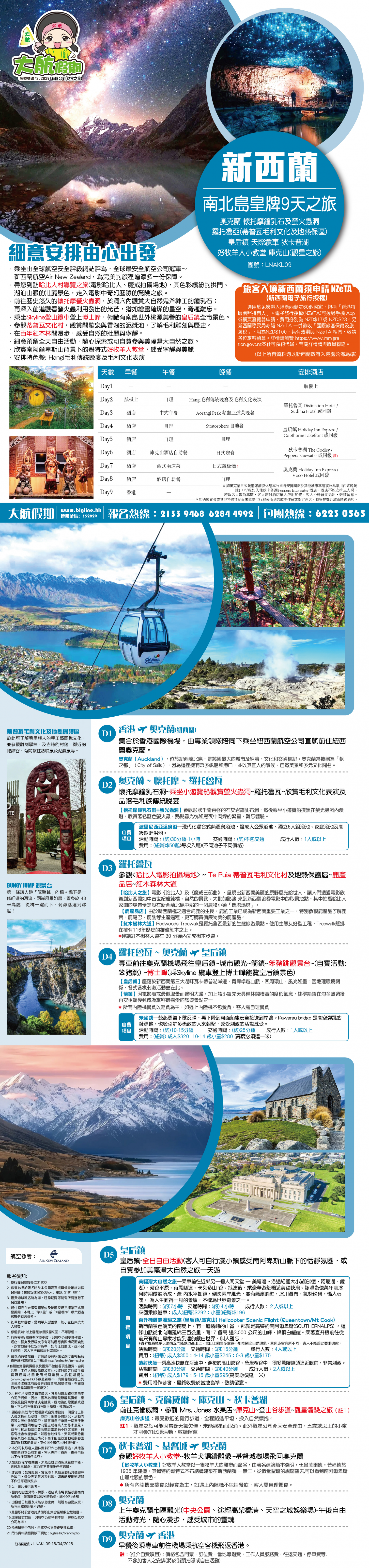 *團員繳付退票費後 (如適用): 1) 已繳款項可保留半年; 或 2) 選擇轉團後, 餘款則保留半年; 或 3) 可繳付『迫不得已理由』之手續費後, 取回已付餘款。 *個別機票+酒店套票產品如因『迫不得已理由』取消外遊行程, 處理旅客退款時亦按以上訂列收取每位退票費及手續費, 並以行程表 (套票單張) 所列為準。 責任細則: 1. 本公司保留合併團隊出發的權利。 2. 行程書或單張內所列費用根據當時機票價格及國際貨幣兌換率而訂立。外幣浮動等情況之下, 本公司保留在出發前調整各項費用的權利及徵收額外費用。 3. 所有列出的交通服務資料只供參考, 如有更改概不負責, 一切須以出票時為準。 4. 除本公司直接提供之服務外, 本公司及其職員或附屬公司或與本公司有經營關係之公司代理人身份在香港或外地安排其他獨立機構所提供之交通工具 (如飛機、輪船、火車、或遊覽巴士等) 、住宿、膳食或娛樂觀光項目等 (“委託機構”), 團員如遇交通延誤、行李遺失、意外傷亡或財物損失等, 該依照當地法律向擁有、管理或操作之委託機構直接交涉或追討賠償, 通常該等機構均各訂位不同條例, 以對客人負責。在此情況下, 本公司概不對該等損失或傷亡負責。 5. 除因由本公司之員工或其他直接管理或操作之機構之疏忽而引致團員之個人傷亡外, 本公司對團員在任何意外中之個人傷亡、經濟、娛樂或精神損失概不負責。 6. 除經本公司同意及安排, 如團員自行更改由其他人士代為參團, 本公司或其委託機構之職員有權取消其隨團之資格, 而無須發還任何團費, 而該人士在隨團期間之保險、責任賠償、行為後果等均由該人仕自行承擔。 7. 如因天氣、罷工、戰爭、怠工或安全情況影響而引致有關交通工具暫停服務, 停航或其他事故, 而必須將行程更改或取消部份行程, 本公司則將團員所繳交之費用扣除因以上事故而引致之損失後, 退回差額給團員。 8. 有關住宿、膳食、遊覽節目等問題, 均依據行程表安排, 行程先後次序有可能需要更改, 一切以當地安排為準。若遇特殊情況, 如簽證受阻, 當地酒店突告客滿或航機改變飛行時間或地點, 以及非本公司或其委託機構所能控制之因素, 令旅行團節目有增減, 或臨時更改交通工具、班機時間、機種及更換酒店等等, 本公司或其委託機構得依當時情況全權盡力處理, 團員不得藉故反對或退出, 因故取消之節目, 將不獲退還款項, 任何因延期而引致之額外支出, 本公司或其委託機構概不負責。 9. 所有酒店及住宿根據行程安排, 本公司視乎當時情形作出更改, 但不限於遇展覽會或特殊情況下, 將住宿鄰近城市之同等級酒店及住宿代替。本公司如因『迫不得已理由(外遊)』(即指戰爭、政治動盪、恐怖襲擊、天災、疫症、惡劣天氣、交通工具發生技術問題、載運機構臨時更改班次或取消服務、罷工、工業行動、旅遊目的地政府或世界衛生組織發出旅遊警示(警告)、香港特別行政區政府發出紅色或黑色外遊警示、不可抗力事件,以及業界不能控制的其他不利離開香港或在香港境外旅遊的情況)於外遊旅行團出發後更改任何項目而引致成本增加,可向顧客徵收額外費用。 10. 【已成團】代表該團號之指定出發日期預訂機位或已有足夠人數報名參加。但出發與否還受其他因素影響, 本公司保留最終決定權。 11. 任何團員在參與各項活動時, 如經常不遵守服飾人員之指引或安排, 在行動或言語上侮辱或滋擾其他團員或工作人員, 本公司或其委託機構職員有權視具體情況而取消其隨團資格而母須發任何團費, 而受該旅客監護之18歲以下同行團員亦須一併離開, 有關旅客離團後一切活動, 概與本公司或其委託機構無關。 12. 團員如欲於旅程完畢後延期返港, 須於出發前十四天提出, 以便本公司代為預定返港機位, 延期返港之機位, 未能即時作實, 團員不得藉此理由要求退出, 旅程完畢後延期逗留之費用, 概由團員自負。 13. 延期返港之團友, 必須在離境前七十二小時向航空公司確實回程機位, 任何機位如有變更, 概與本公司無關。 14. 團員如在旅途中自行離團或放棄行程, 離團後之責任自負, 一切後果與本公司或其委託機構無關。 15. 參團者須切實遵守各國及各地法例, 包括但不限於防疫防控條例, 並嚴禁攜帶違例物品出入境, 並照實申報攜帶之物品及現金。 16. 任何種類的簽證審批權及出入境批准權一律由該國或地區之領事館及/或出入境部門全權決定, 出入境如有問題, 責任旅客自負, 本公司或其委託機構母須負任何責任。如簽證已代辦, 簽證費恕不退還。 17. 即使團員持有效之入境簽證及旅遊證件, 而於入境時被當值之移民局海關人員拒絕入境, 本公司或其委託機構亦無須負任何責任。所需額外安排之食宿、交通費用、全部由其本人負責, 其餘下的行程亦將不會獲得任何補償, 亦不得要求退款或改團。 18. 中國內地相關法規規定, 即日起旅客入住中國內地境內酒店時, 公安機關會透過酒店前台向旅客一併採集人像信息資訊。 19. 如出現一些非本公司能力範圍可控制之問題 (如花卉、紅葉提早凋謝或景觀、自然現象、景點活動或戶外項目) 會受天氣等因素影響, 如未能安排則取消不作任何退款安排。 20. 旅客如在旅程中確診 COVID-19或其他傳染病,無論受到當地政府隔離或其他檢疫要求影響與否,為確保其他旅客之安全,確診旅