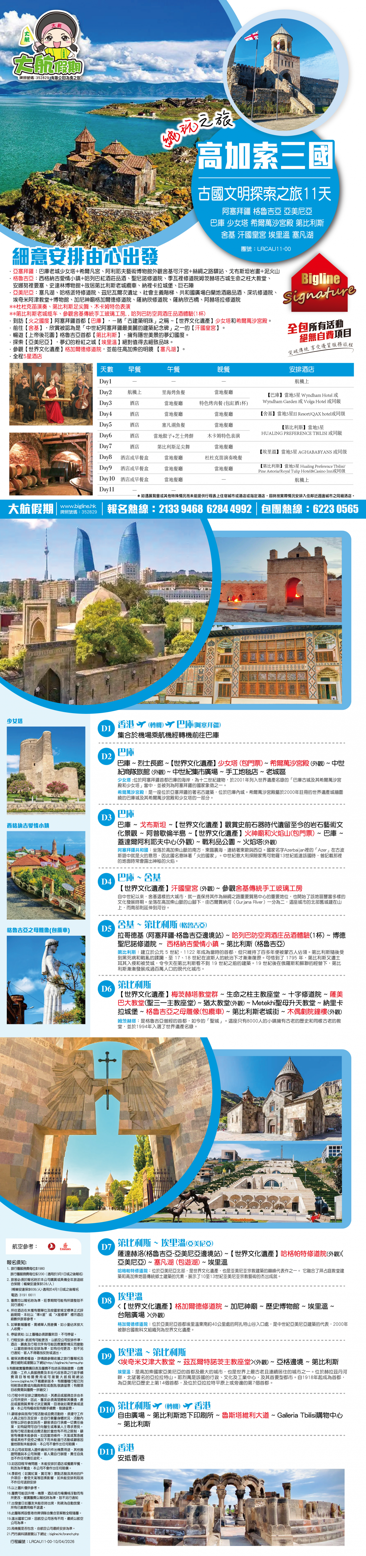 *團員繳付退票費後 (如適用): 1) 已繳款項可保留半年; 或 2) 選擇轉團後, 餘款則保留半年; 或 3) 可繳付『迫不得已理由』之手續費後, 取回已付餘款。 *個別機票+酒店套票產品如因『迫不得已理由』取消外遊行程, 處理旅客退款時亦按以上訂列收取每位退票費及手續費, 並以行程表 (套票單張) 所列為準。 責任細則: 1. 本公司保留合併團隊出發的權利。 2. 行程書或單張內所列費用根據當時機票價格及國際貨幣兌換率而訂立。外幣浮動等情況之下, 本公司保留在出發前調整各項費用的權利及徵收額外費用。 3. 所有列出的交通服務資料只供參考, 如有更改概不負責, 一切須以出票時為準。 4. 除本公司直接提供之服務外, 本公司及其職員或附屬公司或與本公司有經營關係之公司代理人身份在香港或外地安排其他獨立機構所提供之交通工具 (如飛機、輪船、火車、或遊覽巴士等) 、住宿、膳食或娛樂觀光項目等 (“委託機構”), 團員如遇交通延誤、行李遺失、意外傷亡或財物損失等, 該依照當地法律向擁有、管理或操作之委託機構直接交涉或追討賠償, 通常該等機構均各訂位不同條例, 以對客人負責。在此情況下, 本公司概不對該等損失或傷亡負責。 5. 除因由本公司之員工或其他直接管理或操作之機構之疏忽而引致團員之個人傷亡外, 本公司對團員在任何意外中之個人傷亡、經濟、娛樂或精神損失概不負責。 6. 除經本公司同意及安排, 如團員自行更改由其他人士代為參團, 本公司或其委託機構之職員有權取消其隨團之資格, 而無須發還任何團費, 而該人士在隨團期間之保險、責任賠償、行為後果等均由該人仕自行承擔。 7. 如因天氣、罷工、戰爭、怠工或安全情況影響而引致有關交通工具暫停服務, 停航或其他事故, 而必須將行程更改或取消部份行程, 本公司則將團員所繳交之費用扣除因以上事故而引致之損失後, 退回差額給團員。 8. 有關住宿、膳食、遊覽節目等問題, 均依據行程表安排, 行程先後次序有可能需要更改, 一切以當地安排為準。若遇特殊情況, 如簽證受阻, 當地酒店突告客滿或航機改變飛行時間或地點, 以及非本公司或其委託機構所能控制之因素, 令旅行團節目有增減, 或臨時更改交通工具、班機時間、機種及更換酒店等等, 本公司或其委託機構得依當時情況全權盡力處理, 團員不得藉故反對或退出, 因故取消之節目, 將不獲退還款項, 任何因延期而引致之額外支出, 本公司或其委託機構概不負責。 9. 所有酒店及住宿根據行程安排, 本公司視乎當時情形作出更改, 但不限於遇展覽會或特殊情況下, 將住宿鄰近城市之同等級酒店及住宿代替。本公司如因『迫不得已理由(外遊)』(即指戰爭、政治動盪、恐怖襲擊、天災、疫症、惡劣天氣、交通工具發生技術問題、載運機構臨時更改班次或取消服務、罷工、工業行動、旅遊目的地政府或世界衛生組織發出旅遊警示(警告)、香港特別行政區政府發出紅色或黑色外遊警示、不可抗力事件,以及業界不能控制的其他不利離開香港或在香港境外旅遊的情況)於外遊旅行團出發後更改任何項目而引致成本增加,可向顧客徵收額外費用。 10. 【已成團】代表該團號之指定出發日期預訂機位或已有足夠人數報名參加。但出發與否還受其他因素影響, 本公司保留最終決定權。 11. 任何團員在參與各項活動時, 如經常不遵守服飾人員之指引或安排, 在行動或言語上侮辱或滋擾其他團員或工作人員, 本公司或其委託機構職員有權視具體情況而取消其隨團資格而母須發任何團費, 而受該旅客監護之18歲以下同行團員亦須一併離開, 有關旅客離團後一切活動, 概與本公司或其委託機構無關。 12. 團員如欲於旅程完畢後延期返港, 須於出發前十四天提出, 以便本公司代為預定返港機位, 延期返港之機位, 未能即時作實, 團員不得藉此理由要求退出, 旅程完畢後延期逗留之費用, 概由團員自負。 13. 延期返港之團友, 必須在離境前七十二小時向航空公司確實回程機位, 任何機位如有變更, 概與本公司無關。 14. 團員如在旅途中自行離團或放棄行程, 離團後之責任自負, 一切後果與本公司或其委託機構無關。 15. 參團者須切實遵守各國及各地法例, 包括但不限於防疫防控條例, 並嚴禁攜帶違例物品出入境, 並照實申報攜帶之物品及現金。 16. 任何種類的簽證審批權及出入境批准權一律由該國或地區之領事館及/或出入境部門全權決定, 出入境如有問題, 責任旅客自負, 本公司或其委託機構母須負任何責任。如簽證已代辦, 簽證費恕不退還。 17. 即使團員持有效之入境簽證及旅遊證件, 而於入境時被當值之移民局海關人員拒絕入境, 本公司或其委託機構亦無須負任何責任。所需額外安排之食宿、交通費用、全部由其本人負責, 其餘下的行程亦將不會獲得任何補償, 亦不得要求退款或改團。 18. 中國內地相關法規規定, 即日起旅客入住中國內地境內酒店時, 公安機關會透過酒店前台向旅客一併採集人像信息資訊。 19. 如出現一些非本公司能力範圍可控制之問題 (如花卉、紅葉提早凋謝或景觀、自然現象、景點活動或戶外項目) 會受天氣等因素影響, 如未能安排則取消不作任何退款安排。 20. 旅客如在旅程中確診 COVID-19或其他傳染病,無論受到當地政府隔離或其他檢疫要求影響與否,為確保其他旅客之安全,確診旅