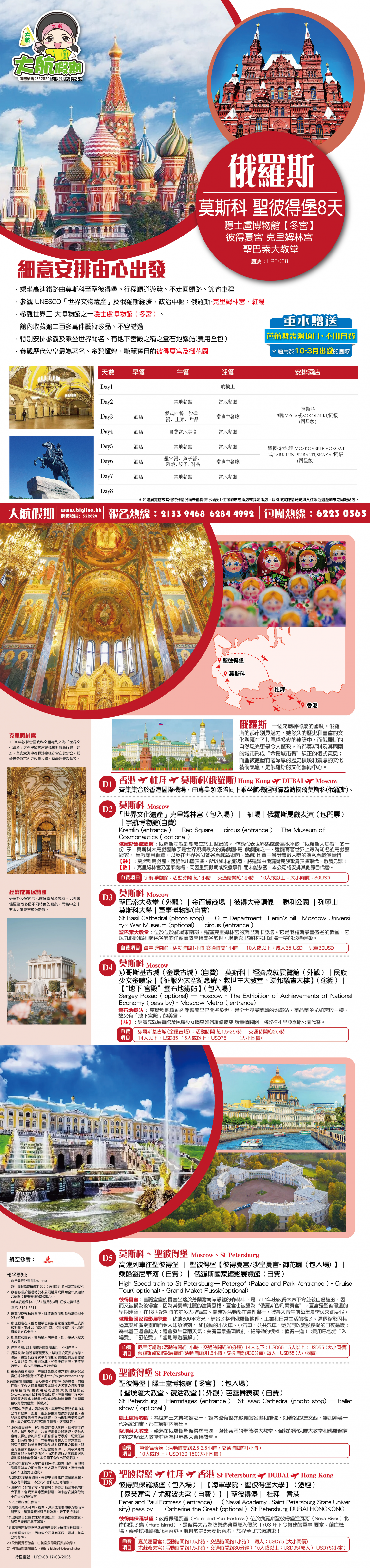 註1: 克里姆林宮乃國家機構,同因重要假期或突發事件而未能參觀,本公司將安排其他節目代替