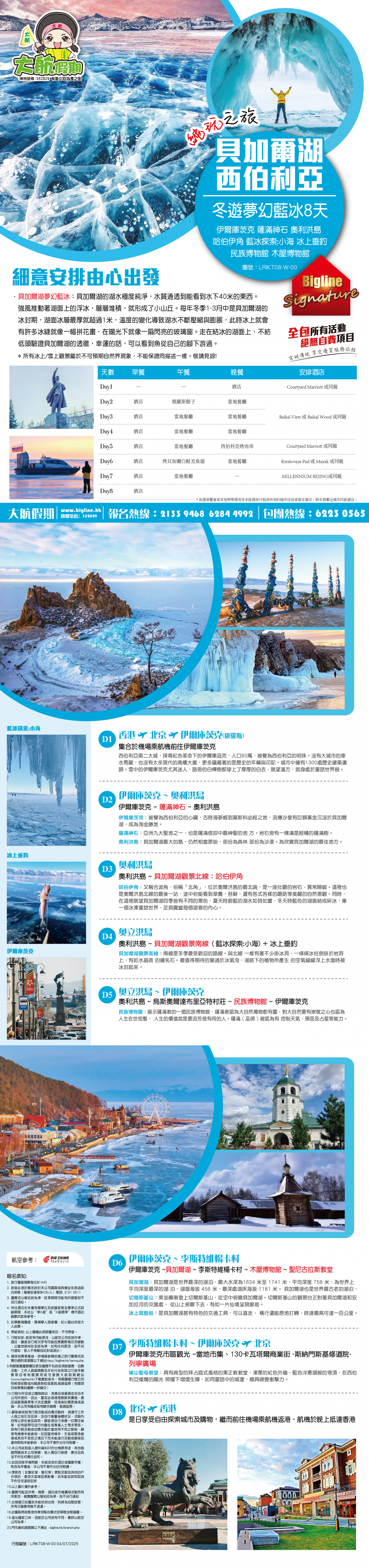 *團員繳付退票費後 (如適用): 1) 已繳款項可保留半年; 或 2) 選擇轉團後, 餘款則保留半年; 或 3) 可繳付『迫不得已理由』之手續費後, 取回已付餘款。 *個別機票+酒店套票產品如因『迫不得已理由』取消外遊行程, 處理旅客退款時亦按以上訂列收取每位退票費及手續費, 並以行程表 (套票單張) 所列為準。 責任細則: 1. 本公司保留合併團隊出發的權利。 2. 行程書或單張內所列費用根據當時機票價格及國際貨幣兌換率而訂立。外幣浮動等情況之下, 本公司保留在出發前調整各項費用的權利及徵收額外費用。 3. 所有列出的交通服務資料只供參考, 如有更改概不負責, 一切須以出票時為準。 4. 除本公司直接提供之服務外, 本公司及其職員或附屬公司或與本公司有經營關係之公司代理人身份在香港或外地安排其他獨立機構所提供之交通工具 (如飛機、輪船、火車、或遊覽巴士等) 、住宿、膳食或娛樂觀光項目等 (“委託機構”), 團員如遇交通延誤、行李遺失、意外傷亡或財物損失等, 該依照當地法律向擁有、管理或操作之委託機構直接交涉或追討賠償, 通常該等機構均各訂位不同條例, 以對客人負責。在此情況下, 本公司概不對該等損失或傷亡負責。 5. 除因由本公司之員工或其他直接管理或操作之機構之疏忽而引致團員之個人傷亡外, 本公司對團員在任何意外中之個人傷亡、經濟、娛樂或精神損失概不負責。 6. 除經本公司同意及安排, 如團員自行更改由其他人士代為參團, 本公司或其委託機構之職員有權取消其隨團之資格, 而無須發還任何團費, 而該人士在隨團期間之保險、責任賠償、行為後果等均由該人仕自行承擔。 7. 如因天氣、罷工、戰爭、怠工或安全情況影響而引致有關交通工具暫停服務, 停航或其他事故, 而必須將行程更改或取消部份行程, 本公司則將團員所繳交之費用扣除因以上事故而引致之損失後, 退回差額給團員。 8. 有關住宿、膳食、遊覽節目等問題, 均依據行程表安排, 行程先後次序有可能需要更改, 一切以當地安排為準。若遇特殊情況, 如簽證受阻, 當地酒店突告客滿或航機改變飛行時間或地點, 以及非本公司或其委託機構所能控制之因素, 令旅行團節目有增減, 或臨時更改交通工具、班機時間、機種及更換酒店等等, 本公司或其委託機構得依當時情況全權盡力處理, 團員不得藉故反對或退出, 因故取消之節目, 將不獲退還款項, 任何因延期而引致之額外支出, 本公司或其委託機構概不負責。 9. 所有酒店及住宿根據行程安排, 本公司視乎當時情形作出更改, 但不限於遇展覽會或特殊情況下, 將住宿鄰近城市之同等級酒店及住宿代替。本公司如因『迫不得已理由(外遊)』(即指戰爭、政治動盪、恐怖襲擊、天災、疫症、惡劣天氣、交通工具發生技術問題、載運機構臨時更改班次或取消服務、罷工、工業行動、旅遊目的地政府或世界衛生組織發出旅遊警示(警告)、香港特別行政區政府發出紅色或黑色外遊警示、不可抗力事件,以及業界不能控制的其他不利離開香港或在香港境外旅遊的情況)於外遊旅行團出發後更改任何項目而引致成本增加,可向顧客徵收額外費用。 10. 【已成團】代表該團號之指定出發日期預訂機位或已有足夠人數報名參加。但出發與否還受其他因素影響, 本公司保留最終決定權。 11. 任何團員在參與各項活動時, 如經常不遵守服飾人員之指引或安排, 在行動或言語上侮辱或滋擾其他團員或工作人員, 本公司或其委託機構職員有權視具體情況而取消其隨團資格而母須發任何團費, 而受該旅客監護之18歲以下同行團員亦須一併離開, 有關旅客離團後一切活動, 概與本公司或其委託機構無關。 12. 團員如欲於旅程完畢後延期返港, 須於出發前十四天提出, 以便本公司代為預定返港機位, 延期返港之機位, 未能即時作實, 團員不得藉此理由要求退出, 旅程完畢後延期逗留之費用, 概由團員自負。 13. 延期返港之團友, 必須在離境前七十二小時向航空公司確實回程機位, 任何機位如有變更, 概與本公司無關。 14. 團員如在旅途中自行離團或放棄行程, 離團後之責任自負, 一切後果與本公司或其委託機構無關。 15. 參團者須切實遵守各國及各地法例, 包括但不限於防疫防控條例, 並嚴禁攜帶違例物品出入境, 並照實申報攜帶之物品及現金。 16. 任何種類的簽證審批權及出入境批准權一律由該國或地區之領事館及/或出入境部門全權決定, 出入境如有問題, 責任旅客自負, 本公司或其委託機構母須負任何責任。如簽證已代辦, 簽證費恕不退還。 17. 即使團員持有效之入境簽證及旅遊證件, 而於入境時被當值之移民局海關人員拒絕入境, 本公司或其委託機構亦無須負任何責任。所需額外安排之食宿、交通費用、全部由其本人負責, 其餘下的行程亦將不會獲得任何補償, 亦不得要求退款或改團。 18. 中國內地相關法規規定, 即日起旅客入住中國內地境內酒店時, 公安機關會透過酒店前台向旅客一併採集人像信息資訊。 19. 如出現一些非本公司能力範圍可控制之問題 (如花卉、紅葉提早凋謝或景觀、自然現象、景點活動或戶外項目) 會受天氣等因素影響, 如未能安排則取消不作任何退款安排。 20. 旅客如在旅程中確診 COVID-19或其他傳染病,無論受到當地政府隔離或其他檢疫要求影響與否,為確保其他旅客之安全,確診旅