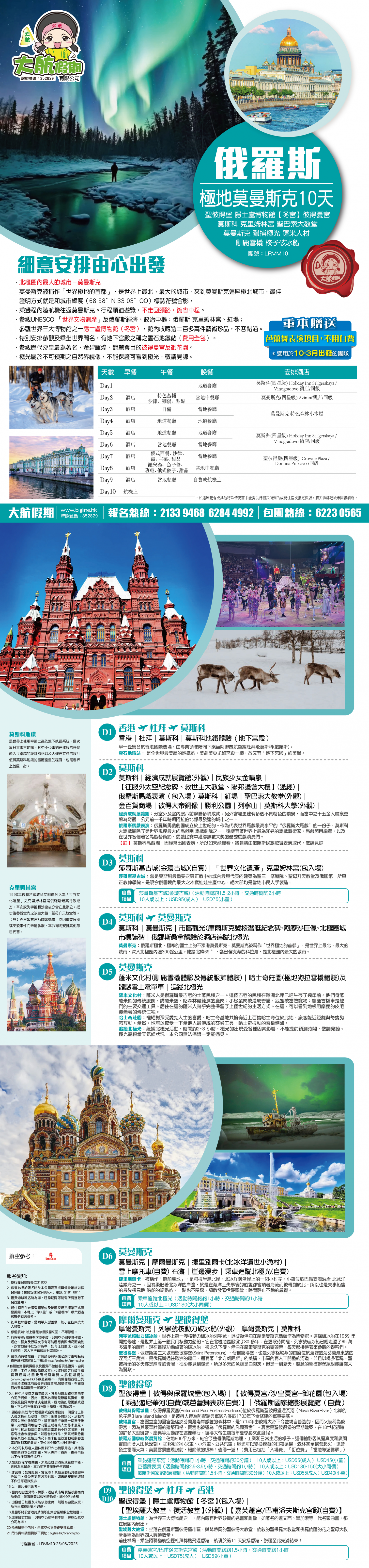 *團員繳付退票費後 (如適用): 1) 已繳款項可保留半年; 或 2) 選擇轉團後, 餘款則保留半年; 或 3) 可繳付『迫不得已理由』之手續費後, 取回已付餘款。 *個別機票+酒店套票產品如因『迫不得已理由』取消外遊行程, 處理旅客退款時亦按以上訂列收取每位退票費及手續費, 並以行程表 (套票單張) 所列為準。 責任細則: 1. 本公司保留合併團隊出發的權利。 2. 行程書或單張內所列費用根據當時機票價格及國際貨幣兌換率而訂立。外幣浮動等情況之下, 本公司保留在出發前調整各項費用的權利及徵收額外費用。 3. 所有列出的交通服務資料只供參考, 如有更改概不負責, 一切須以出票時為準。 4. 除本公司直接提供之服務外, 本公司及其職員或附屬公司或與本公司有經營關係之公司代理人身份在香港或外地安排其他獨立機構所提供之交通工具 (如飛機、輪船、火車、或遊覽巴士等) 、住宿、膳食或娛樂觀光項目等 (“委託機構”), 團員如遇交通延誤、行李遺失、意外傷亡或財物損失等, 該依照當地法律向擁有、管理或操作之委託機構直接交涉或追討賠償, 通常該等機構均各訂位不同條例, 以對客人負責。在此情況下, 本公司概不對該等損失或傷亡負責。 5. 除因由本公司之員工或其他直接管理或操作之機構之疏忽而引致團員之個人傷亡外, 本公司對團員在任何意外中之個人傷亡、經濟、娛樂或精神損失概不負責。 6. 除經本公司同意及安排, 如團員自行更改由其他人士代為參團, 本公司或其委託機構之職員有權取消其隨團之資格, 而無須發還任何團費, 而該人士在隨團期間之保險、責任賠償、行為後果等均由該人仕自行承擔。 7. 如因天氣、罷工、戰爭、怠工或安全情況影響而引致有關交通工具暫停服務, 停航或其他事故, 而必須將行程更改或取消部份行程, 本公司則將團員所繳交之費用扣除因以上事故而引致之損失後, 退回差額給團員。 8. 有關住宿、膳食、遊覽節目等問題, 均依據行程表安排, 行程先後次序有可能需要更改, 一切以當地安排為準。若遇特殊情況, 如簽證受阻, 當地酒店突告客滿或航機改變飛行時間或地點, 以及非本公司或其委託機構所能控制之因素, 令旅行團節目有增減, 或臨時更改交通工具、班機時間、機種及更換酒店等等, 本公司或其委託機構得依當時情況全權盡力處理, 團員不得藉故反對或退出, 因故取消之節目, 將不獲退還款項, 任何因延期而引致之額外支出, 本公司或其委託機構概不負責。 9. 所有酒店及住宿根據行程安排, 本公司視乎當時情形作出更改, 但不限於遇展覽會或特殊情況下, 將住宿鄰近城市之同等級酒店及住宿代替。本公司如因『迫不得已理由(外遊)』(即指戰爭、政治動盪、恐怖襲擊、天災、疫症、惡劣天氣、交通工具發生技術問題、載運機構臨時更改班次或取消服務、罷工、工業行動、旅遊目的地政府或世界衛生組織發出旅遊警示(警告)、香港特別行政區政府發出紅色或黑色外遊警示、不可抗力事件,以及業界不能控制的其他不利離開香港或在香港境外旅遊的情況)於外遊旅行團出發後更改任何項目而引致成本增加,可向顧客徵收額外費用。 10. 【已成團】代表該團號之指定出發日期預訂機位或已有足夠人數報名參加。但出發與否還受其他因素影響, 本公司保留最終決定權。 11. 任何團員在參與各項活動時, 如經常不遵守服飾人員之指引或安排, 在行動或言語上侮辱或滋擾其他團員或工作人員, 本公司或其委託機構職員有權視具體情況而取消其隨團資格而母須發任何團費, 而受該旅客監護之18歲以下同行團員亦須一併離開, 有關旅客離團後一切活動, 概與本公司或其委託機構無關。 12. 團員如欲於旅程完畢後延期返港, 須於出發前十四天提出, 以便本公司代為預定返港機位, 延期返港之機位, 未能即時作實, 團員不得藉此理由要求退出, 旅程完畢後延期逗留之費用, 概由團員自負。 13. 延期返港之團友, 必須在離境前七十二小時向航空公司確實回程機位, 任何機位如有變更, 概與本公司無關。 14. 團員如在旅途中自行離團或放棄行程, 離團後之責任自負, 一切後果與本公司或其委託機構無關。 15. 參團者須切實遵守各國及各地法例, 包括但不限於防疫防控條例, 並嚴禁攜帶違例物品出入境, 並照實申報攜帶之物品及現金。 16. 任何種類的簽證審批權及出入境批准權一律由該國或地區之領事館及/或出入境部門全權決定, 出入境如有問題, 責任旅客自負, 本公司或其委託機構母須負任何責任。如簽證已代辦, 簽證費恕不退還。 17. 即使團員持有效之入境簽證及旅遊證件, 而於入境時被當值之移民局海關人員拒絕入境, 本公司或其委託機構亦無須負任何責任。所需額外安排之食宿、交通費用、全部由其本人負責, 其餘下的行程亦將不會獲得任何補償, 亦不得要求退款或改團。 18. 中國內地相關法規規定, 即日起旅客入住中國內地境內酒店時, 公安機關會透過酒店前台向旅客一併採集人像信息資訊。 19. 如出現一些非本公司能力範圍可控制之問題 (如花卉、紅葉提早凋謝或景觀、自然現象、景點活動或戶外項目) 會受天氣等因素影響, 如未能安排則取消不作任何退款安排。 20. 旅客如在旅程中確診 COVID-19或其他傳染病,無論受到當地政府隔離或其他檢疫要求影響與否,為確保其他旅客之安全,確診旅