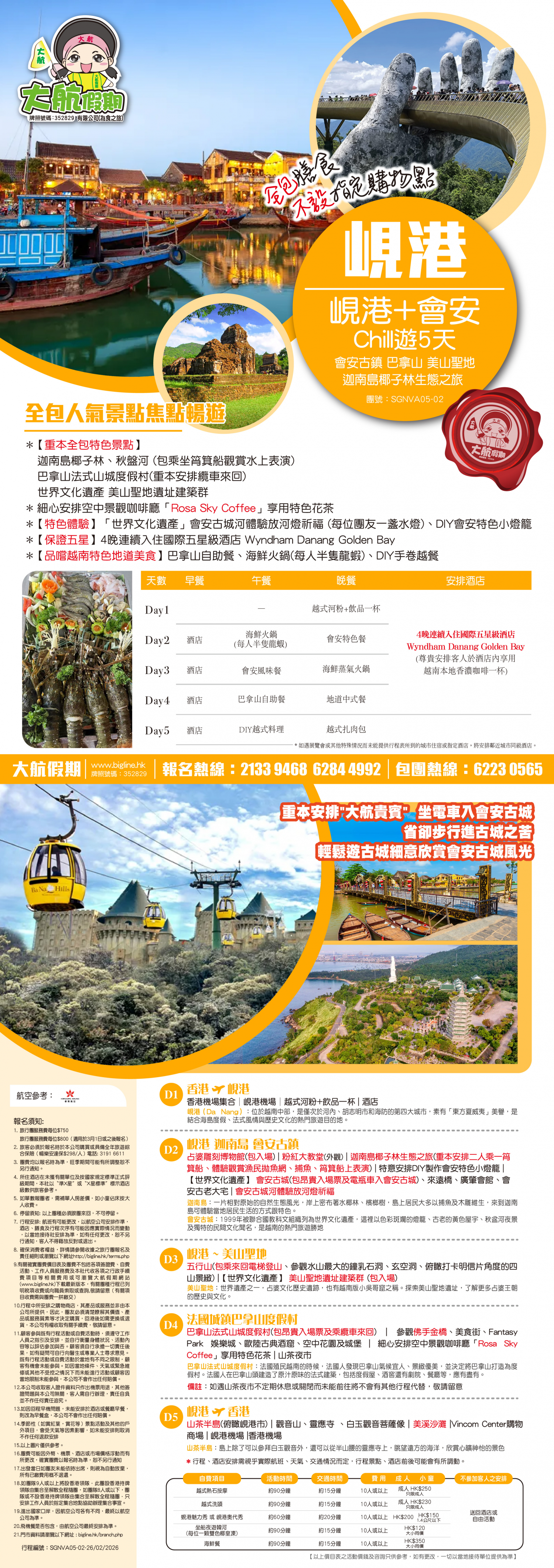 *團員繳付退票費後 (如適用): 1) 已繳款項可保留半年; 或 2) 選擇轉團後, 餘款則保留半年; 或 3) 可繳付『迫不得已理由』之手續費後, 取回已付餘款。 *個別機票+酒店套票產品如因『迫不得已理由』取消外遊行程, 處理旅客退款時亦按以上訂列收取每位退票費及手續費, 並以行程表 (套票單張) 所列為準。 責任細則: 1. 本公司保留合併團隊出發的權利。 2. 行程書或單張內所列費用根據當時機票價格及國際貨幣兌換率而訂立。外幣浮動等情況之下, 本公司保留在出發前調整各項費用的權利及徵收額外費用。 3. 所有列出的交通服務資料只供參考, 如有更改概不負責, 一切須以出票時為準。 4. 除本公司直接提供之服務外, 本公司及其職員或附屬公司或與本公司有經營關係之公司代理人身份在香港或外地安排其他獨立機構所提供之交通工具 (如飛機、輪船、火車、或遊覽巴士等) 、住宿、膳食或娛樂觀光項目等 (“委託機構”), 團員如遇交通延誤、行李遺失、意外傷亡或財物損失等, 該依照當地法律向擁有、管理或操作之委託機構直接交涉或追討賠償, 通常該等機構均各訂位不同條例, 以對客人負責。在此情況下, 本公司概不對該等損失或傷亡負責。 5. 除因由本公司之員工或其他直接管理或操作之機構之疏忽而引致團員之個人傷亡外, 本公司對團員在任何意外中之個人傷亡、經濟、娛樂或精神損失概不負責。 6. 除經本公司同意及安排, 如團員自行更改由其他人士代為參團, 本公司或其委託機構之職員有權取消其隨團之資格, 而無須發還任何團費, 而該人士在隨團期間之保險、責任賠償、行為後果等均由該人仕自行承擔。 7. 如因天氣、罷工、戰爭、怠工或安全情況影響而引致有關交通工具暫停服務, 停航或其他事故, 而必須將行程更改或取消部份行程, 本公司則將團員所繳交之費用扣除因以上事故而引致之損失後, 退回差額給團員。 8. 有關住宿、膳食、遊覽節目等問題, 均依據行程表安排, 行程先後次序有可能需要更改, 一切以當地安排為準。若遇特殊情況, 如簽證受阻, 當地酒店突告客滿或航機改變飛行時間或地點, 以及非本公司或其委託機構所能控制之因素, 令旅行團節目有增減, 或臨時更改交通工具、班機時間、機種及更換酒店等等, 本公司或其委託機構得依當時情況全權盡力處理, 團員不得藉故反對或退出, 因故取消之節目, 將不獲退還款項, 任何因延期而引致之額外支出, 本公司或其委託機構概不負責。 9. 所有酒店及住宿根據行程安排, 本公司視乎當時情形作出更改, 但不限於遇展覽會或特殊情況下, 將住宿鄰近城市之同等級酒店及住宿代替。本公司如因『迫不得已理由(外遊)』(即指戰爭、政治動盪、恐怖襲擊、天災、疫症、惡劣天氣、交通工具發生技術問題、載運機構臨時更改班次或取消服務、罷工、工業行動、旅遊目的地政府或世界衛生組織發出旅遊警示(警告)、香港特別行政區政府發出紅色或黑色外遊警示、不可抗力事件,以及業界不能控制的其他不利離開香港或在香港境外旅遊的情況)於外遊旅行團出發後更改任何項目而引致成本增加,可向顧客徵收額外費用。 10. 【已成團】代表該團號之指定出發日期預訂機位或已有足夠人數報名參加。但出發與否還受其他因素影響, 本公司保留最終決定權。 11. 任何團員在參與各項活動時, 如經常不遵守服飾人員之指引或安排, 在行動或言語上侮辱或滋擾其他團員或工作人員, 本公司或其委託機構職員有權視具體情況而取消其隨團資格而母須發任何團費, 而受該旅客監護之18歲以下同行團員亦須一併離開, 有關旅客離團後一切活動, 概與本公司或其委託機構無關。 12. 團員如欲於旅程完畢後延期返港, 須於出發前十四天提出, 以便本公司代為預定返港機位, 延期返港之機位, 未能即時作實, 團員不得藉此理由要求退出, 旅程完畢後延期逗留之費用, 概由團員自負。 13. 延期返港之團友, 必須在離境前七十二小時向航空公司確實回程機位, 任何機位如有變更, 概與本公司無關。 14. 團員如在旅途中自行離團或放棄行程, 離團後之責任自負, 一切後果與本公司或其委託機構無關。 15. 參團者須切實遵守各國及各地法例, 包括但不限於防疫防控條例, 並嚴禁攜帶違例物品出入境, 並照實申報攜帶之物品及現金。 16. 任何種類的簽證審批權及出入境批准權一律由該國或地區之領事館及/或出入境部門全權決定, 出入境如有問題, 責任旅客自負, 本公司或其委託機構母須負任何責任。如簽證已代辦, 簽證費恕不退還。 17. 即使團員持有效之入境簽證及旅遊證件, 而於入境時被當值之移民局海關人員拒絕入境, 本公司或其委託機構亦無須負任何責任。所需額外安排之食宿、交通費用、全部由其本人負責, 其餘下的行程亦將不會獲得任何補償, 亦不得要求退款或改團。 18. 中國內地相關法規規定, 即日起旅客入住中國內地境內酒店時, 公安機關會透過酒店前台向旅客一併採集人像信息資訊。 19. 如出現一些非本公司能力範圍可控制之問題 (如花卉、紅葉提早凋謝或景觀、自然現象、景點活動或戶外項目) 會受天氣等因素影響, 如未能安排則取消不作任何退款安排。 20. 旅客如在旅程中確診 COVID-19或其他傳染病,無論受到當地政府隔離或其他檢疫要求影響與否,為確保其他旅客之安全,確診旅