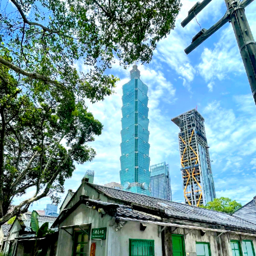 四四南村位於台北101旁,呈現低矮平房與信義區摩天大樓強烈對比的懷舊風情。