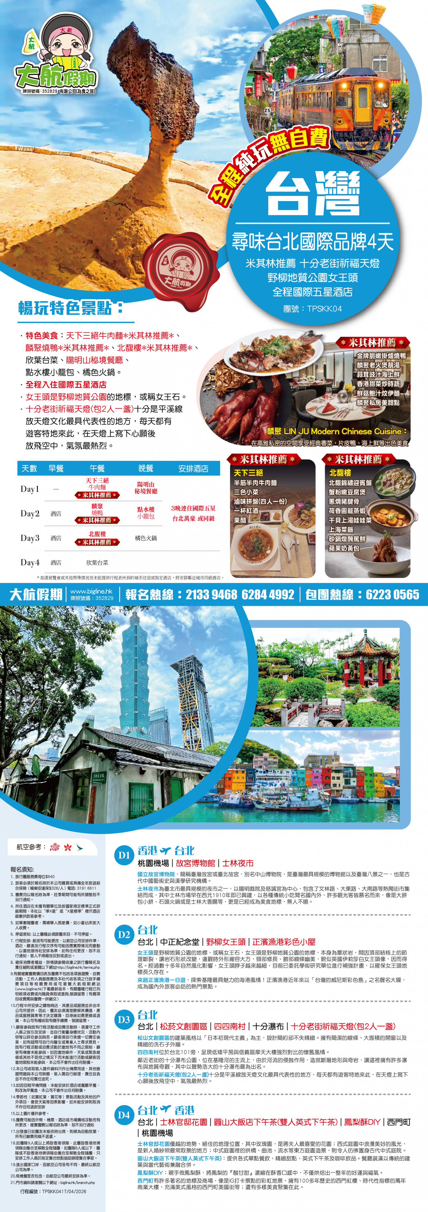 *團員繳付退票費後 (如適用): 1) 已繳款項可保留半年; 或 2) 選擇轉團後, 餘款則保留半年; 或 3) 可繳付『迫不得已理由』之手續費後, 取回已付餘款。 *個別機票+酒店套票產品如因『迫不得已理由』取消外遊行程, 處理旅客退款時亦按以上訂列收取每位退票費及手續費, 並以行程表 (套票單張) 所列為準。 責任細則: 1. 本公司保留合併團隊出發的權利。 2. 行程書或單張內所列費用根據當時機票價格及國際貨幣兌換率而訂立。外幣浮動等情況之下, 本公司保留在出發前調整各項費用的權利及徵收額外費用。 3. 所有列出的交通服務資料只供參考, 如有更改概不負責, 一切須以出票時為準。 4. 除本公司直接提供之服務外, 本公司及其職員或附屬公司或與本公司有經營關係之公司代理人身份在香港或外地安排其他獨立機構所提供之交通工具 (如飛機、輪船、火車、或遊覽巴士等) 、住宿、膳食或娛樂觀光項目等 (“委託機構”), 團員如遇交通延誤、行李遺失、意外傷亡或財物損失等, 該依照當地法律向擁有、管理或操作之委託機構直接交涉或追討賠償, 通常該等機構均各訂位不同條例, 以對客人負責。在此情況下, 本公司概不對該等損失或傷亡負責。 5. 除因由本公司之員工或其他直接管理或操作之機構之疏忽而引致團員之個人傷亡外, 本公司對團員在任何意外中之個人傷亡、經濟、娛樂或精神損失概不負責。 6. 除經本公司同意及安排, 如團員自行更改由其他人士代為參團, 本公司或其委託機構之職員有權取消其隨團之資格, 而無須發還任何團費, 而該人士在隨團期間之保險、責任賠償、行為後果等均由該人仕自行承擔。 7. 如因天氣、罷工、戰爭、怠工或安全情況影響而引致有關交通工具暫停服務, 停航或其他事故, 而必須將行程更改或取消部份行程, 本公司則將團員所繳交之費用扣除因以上事故而引致之損失後, 退回差額給團員。 8. 有關住宿、膳食、遊覽節目等問題, 均依據行程表安排, 行程先後次序有可能需要更改, 一切以當地安排為準。若遇特殊情況, 如簽證受阻, 當地酒店突告客滿或航機改變飛行時間或地點, 以及非本公司或其委託機構所能控制之因素, 令旅行團節目有增減, 或臨時更改交通工具、班機時間、機種及更換酒店等等, 本公司或其委託機構得依當時情況全權盡力處理, 團員不得藉故反對或退出, 因故取消之節目, 將不獲退還款項, 任何因延期而引致之額外支出, 本公司或其委託機構概不負責。 9. 所有酒店及住宿根據行程安排, 本公司視乎當時情形作出更改, 但不限於遇展覽會或特殊情況下, 將住宿鄰近城市之同等級酒店及住宿代替。本公司如因『迫不得已理由(外遊)』(即指戰爭、政治動盪、恐怖襲擊、天災、疫症、惡劣天氣、交通工具發生技術問題、載運機構臨時更改班次或取消服務、罷工、工業行動、旅遊目的地政府或世界衛生組織發出旅遊警示(警告)、香港特別行政區政府發出紅色或黑色外遊警示、不可抗力事件,以及業界不能控制的其他不利離開香港或在香港境外旅遊的情況)於外遊旅行團出發後更改任何項目而引致成本增加,可向顧客徵收額外費用。 10. 【已成團】代表該團號之指定出發日期預訂機位或已有足夠人數報名參加。但出發與否還受其他因素影響, 本公司保留最終決定權。 11. 任何團員在參與各項活動時, 如經常不遵守服飾人員之指引或安排, 在行動或言語上侮辱或滋擾其他團員或工作人員, 本公司或其委託機構職員有權視具體情況而取消其隨團資格而母須發任何團費, 而受該旅客監護之18歲以下同行團員亦須一併離開, 有關旅客離團後一切活動, 概與本公司或其委託機構無關。 12. 團員如欲於旅程完畢後延期返港, 須於出發前十四天提出, 以便本公司代為預定返港機位, 延期返港之機位, 未能即時作實, 團員不得藉此理由要求退出, 旅程完畢後延期逗留之費用, 概由團員自負。 13. 延期返港之團友, 必須在離境前七十二小時向航空公司確實回程機位, 任何機位如有變更, 概與本公司無關。 14. 團員如在旅途中自行離團或放棄行程, 離團後之責任自負, 一切後果與本公司或其委託機構無關。 15. 參團者須切實遵守各國及各地法例, 包括但不限於防疫防控條例, 並嚴禁攜帶違例物品出入境, 並照實申報攜帶之物品及現金。 16. 任何種類的簽證審批權及出入境批准權一律由該國或地區之領事館及/或出入境部門全權決定, 出入境如有問題, 責任旅客自負, 本公司或其委託機構母須負任何責任。如簽證已代辦, 簽證費恕不退還。 17. 即使團員持有效之入境簽證及旅遊證件, 而於入境時被當值之移民局海關人員拒絕入境, 本公司或其委託機構亦無須負任何責任。所需額外安排之食宿、交通費用、全部由其本人負責, 其餘下的行程亦將不會獲得任何補償, 亦不得要求退款或改團。 18. 中國內地相關法規規定, 即日起旅客入住中國內地境內酒店時, 公安機關會透過酒店前台向旅客一併採集人像信息資訊。 19. 如出現一些非本公司能力範圍可控制之問題 (如花卉、紅葉提早凋謝或景觀、自然現象、景點活動或戶外項目) 會受天氣等因素影響, 如未能安排則取消不作任何退款安排。 20. 旅客如在旅程中確診 COVID-19或其他傳染病,無論受到當地政府隔離或其他檢疫要求影響與否,為確保其他旅客之安全,確診旅