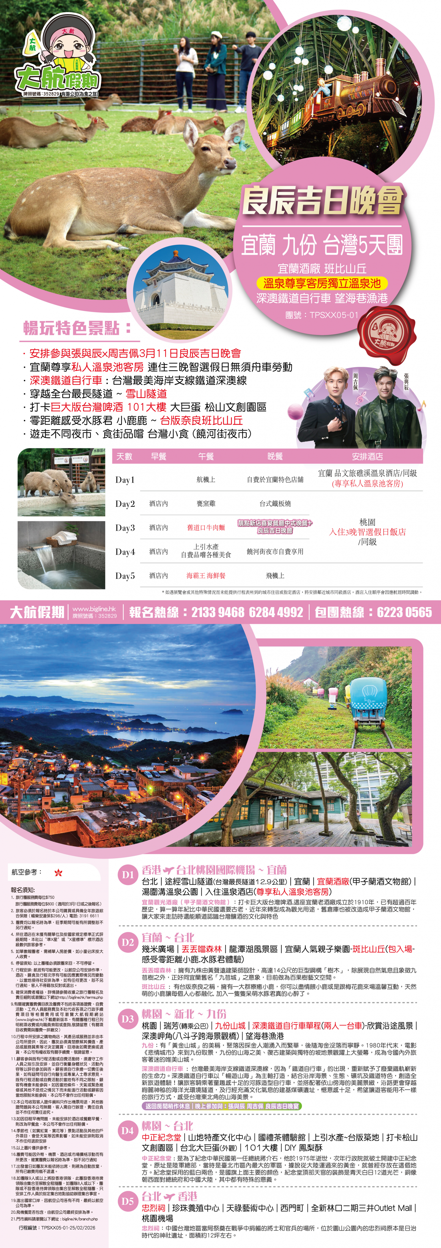 *團員繳付退票費後 (如適用): 1) 已繳款項可保留半年; 或 2) 選擇轉團後, 餘款則保留半年; 或 3) 可繳付『迫不得已理由』之手續費後, 取回已付餘款。 *個別機票+酒店套票產品如因『迫不得已理由』取消外遊行程, 處理旅客退款時亦按以上訂列收取每位退票費及手續費, 並以行程表 (套票單張) 所列為準。 責任細則: 1. 本公司保留合併團隊出發的權利。 2. 行程書或單張內所列費用根據當時機票價格及國際貨幣兌換率而訂立。外幣浮動等情況之下, 本公司保留在出發前調整各項費用的權利及徵收額外費用。 3. 所有列出的交通服務資料只供參考, 如有更改概不負責, 一切須以出票時為準。 4. 除本公司直接提供之服務外, 本公司及其職員或附屬公司或與本公司有經營關係之公司代理人身份在香港或外地安排其他獨立機構所提供之交通工具 (如飛機、輪船、火車、或遊覽巴士等) 、住宿、膳食或娛樂觀光項目等 (“委託機構”), 團員如遇交通延誤、行李遺失、意外傷亡或財物損失等, 該依照當地法律向擁有、管理或操作之委託機構直接交涉或追討賠償, 通常該等機構均各訂位不同條例, 以對客人負責。在此情況下, 本公司概不對該等損失或傷亡負責。 5. 除因由本公司之員工或其他直接管理或操作之機構之疏忽而引致團員之個人傷亡外, 本公司對團員在任何意外中之個人傷亡、經濟、娛樂或精神損失概不負責。 6. 除經本公司同意及安排, 如團員自行更改由其他人士代為參團, 本公司或其委託機構之職員有權取消其隨團之資格, 而無須發還任何團費, 而該人士在隨團期間之保險、責任賠償、行為後果等均由該人仕自行承擔。 7. 如因天氣、罷工、戰爭、怠工或安全情況影響而引致有關交通工具暫停服務, 停航或其他事故, 而必須將行程更改或取消部份行程, 本公司則將團員所繳交之費用扣除因以上事故而引致之損失後, 退回差額給團員。 8. 有關住宿、膳食、遊覽節目等問題, 均依據行程表安排, 行程先後次序有可能需要更改, 一切以當地安排為準。若遇特殊情況, 如簽證受阻, 當地酒店突告客滿或航機改變飛行時間或地點, 以及非本公司或其委託機構所能控制之因素, 令旅行團節目有增減, 或臨時更改交通工具、班機時間、機種及更換酒店等等, 本公司或其委託機構得依當時情況全權盡力處理, 團員不得藉故反對或退出, 因故取消之節目, 將不獲退還款項, 任何因延期而引致之額外支出, 本公司或其委託機構概不負責。 9. 所有酒店及住宿根據行程安排, 本公司視乎當時情形作出更改, 但不限於遇展覽會或特殊情況下, 將住宿鄰近城市之同等級酒店及住宿代替。本公司如因『迫不得已理由(外遊)』(即指戰爭、政治動盪、恐怖襲擊、天災、疫症、惡劣天氣、交通工具發生技術問題、載運機構臨時更改班次或取消服務、罷工、工業行動、旅遊目的地政府或世界衛生組織發出旅遊警示(警告)、香港特別行政區政府發出紅色或黑色外遊警示、不可抗力事件,以及業界不能控制的其他不利離開香港或在香港境外旅遊的情況)於外遊旅行團出發後更改任何項目而引致成本增加,可向顧客徵收額外費用。 10. 【已成團】代表該團號之指定出發日期預訂機位或已有足夠人數報名參加。但出發與否還受其他因素影響, 本公司保留最終決定權。 11. 任何團員在參與各項活動時, 如經常不遵守服飾人員之指引或安排, 在行動或言語上侮辱或滋擾其他團員或工作人員, 本公司或其委託機構職員有權視具體情況而取消其隨團資格而母須發任何團費, 而受該旅客監護之18歲以下同行團員亦須一併離開, 有關旅客離團後一切活動, 概與本公司或其委託機構無關。 12. 團員如欲於旅程完畢後延期返港, 須於出發前十四天提出, 以便本公司代為預定返港機位, 延期返港之機位, 未能即時作實, 團員不得藉此理由要求退出, 旅程完畢後延期逗留之費用, 概由團員自負。 13. 延期返港之團友, 必須在離境前七十二小時向航空公司確實回程機位, 任何機位如有變更, 概與本公司無關。 14. 團員如在旅途中自行離團或放棄行程, 離團後之責任自負, 一切後果與本公司或其委託機構無關。 15. 參團者須切實遵守各國及各地法例, 包括但不限於防疫防控條例, 並嚴禁攜帶違例物品出入境, 並照實申報攜帶之物品及現金。 16. 任何種類的簽證審批權及出入境批准權一律由該國或地區之領事館及/或出入境部門全權決定, 出入境如有問題, 責任旅客自負, 本公司或其委託機構母須負任何責任。如簽證已代辦, 簽證費恕不退還。 17. 即使團員持有效之入境簽證及旅遊證件, 而於入境時被當值之移民局海關人員拒絕入境, 本公司或其委託機構亦無須負任何責任。所需額外安排之食宿、交通費用、全部由其本人負責, 其餘下的行程亦將不會獲得任何補償, 亦不得要求退款或改團。 18. 中國內地相關法規規定, 即日起旅客入住中國內地境內酒店時, 公安機關會透過酒店前台向旅客一併採集人像信息資訊。 19. 如出現一些非本公司能力範圍可控制之問題 (如花卉、紅葉提早凋謝或景觀、自然現象、景點活動或戶外項目) 會受天氣等因素影響, 如未能安排則取消不作任何退款安排。 20. 旅客如在旅程中確診 COVID-19或其他傳染病,無論受到當地政府隔離或其他檢疫要求影響與否,為確保其他旅客之安全,確診旅